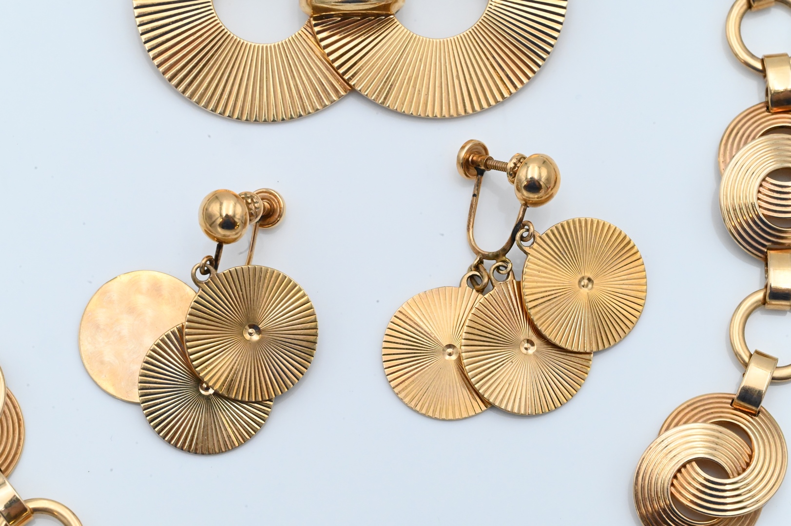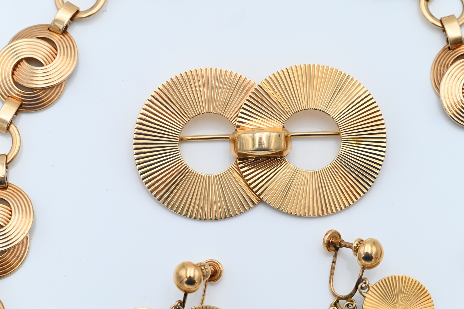 having ribbed circles, to include ribbed circle earrings along with double circle brooch