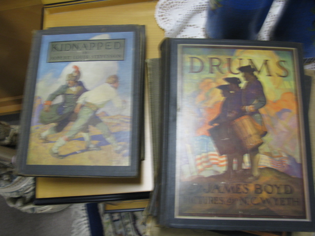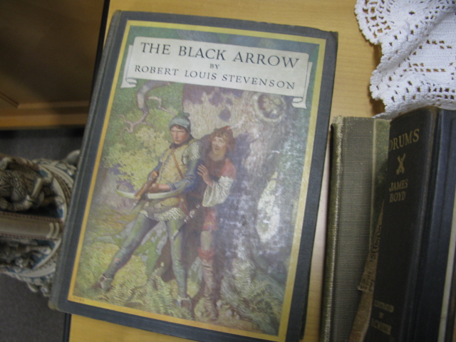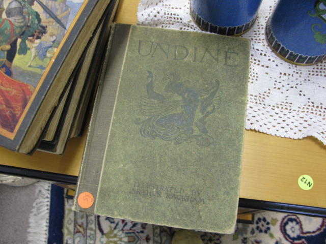 Group of books including Undine illustrated by Arthur Rockham, Peppers and Salt, The Boy’s King Arthur, Drums, Kidnapped and Black Arrow, Robert Lewis Stevenson books.