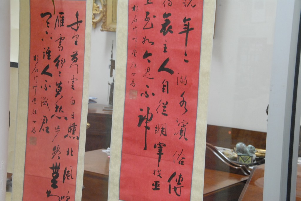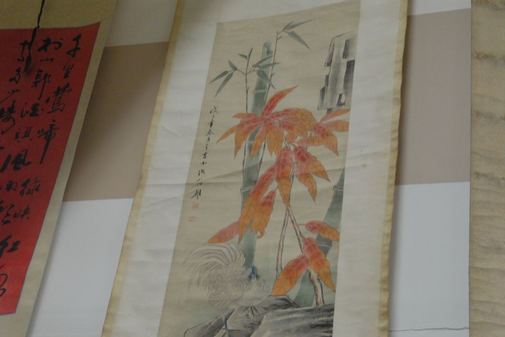 Lot 175: Group of five Oriental scrolls set of four watercolors of characters and watercolor on paper of tree with rooster.