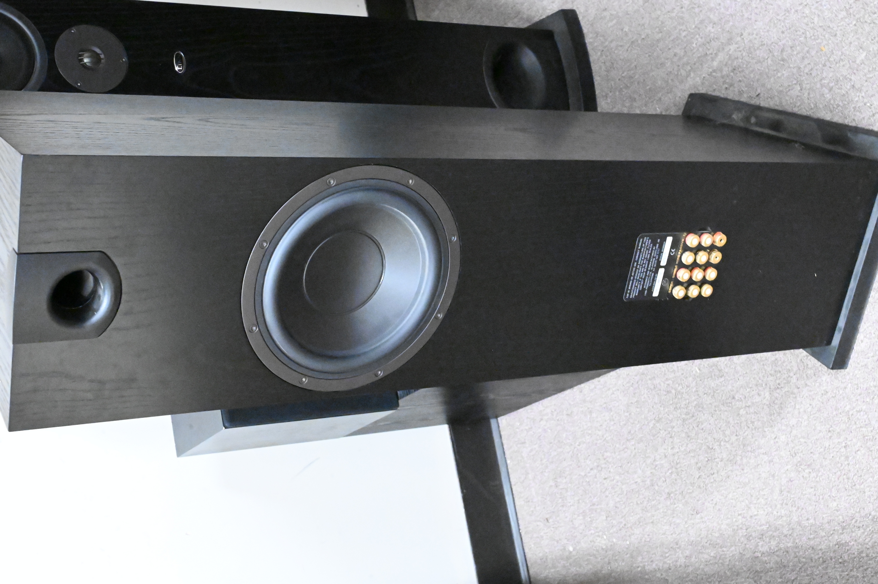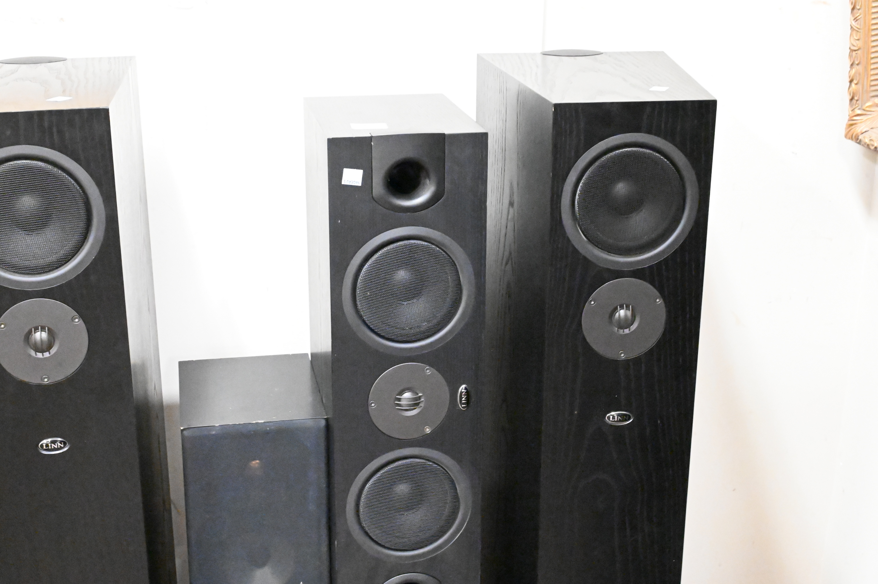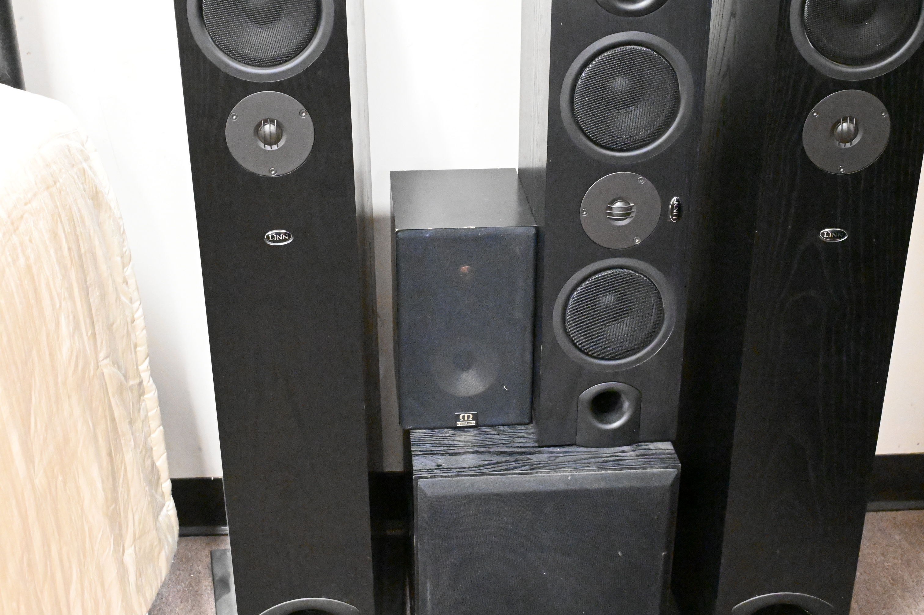 to include Klipsch sub-100 subwoofer, single monitor audio speaker, pair of Linn E Spek floor speakers, and a single Linn E Spek speaker