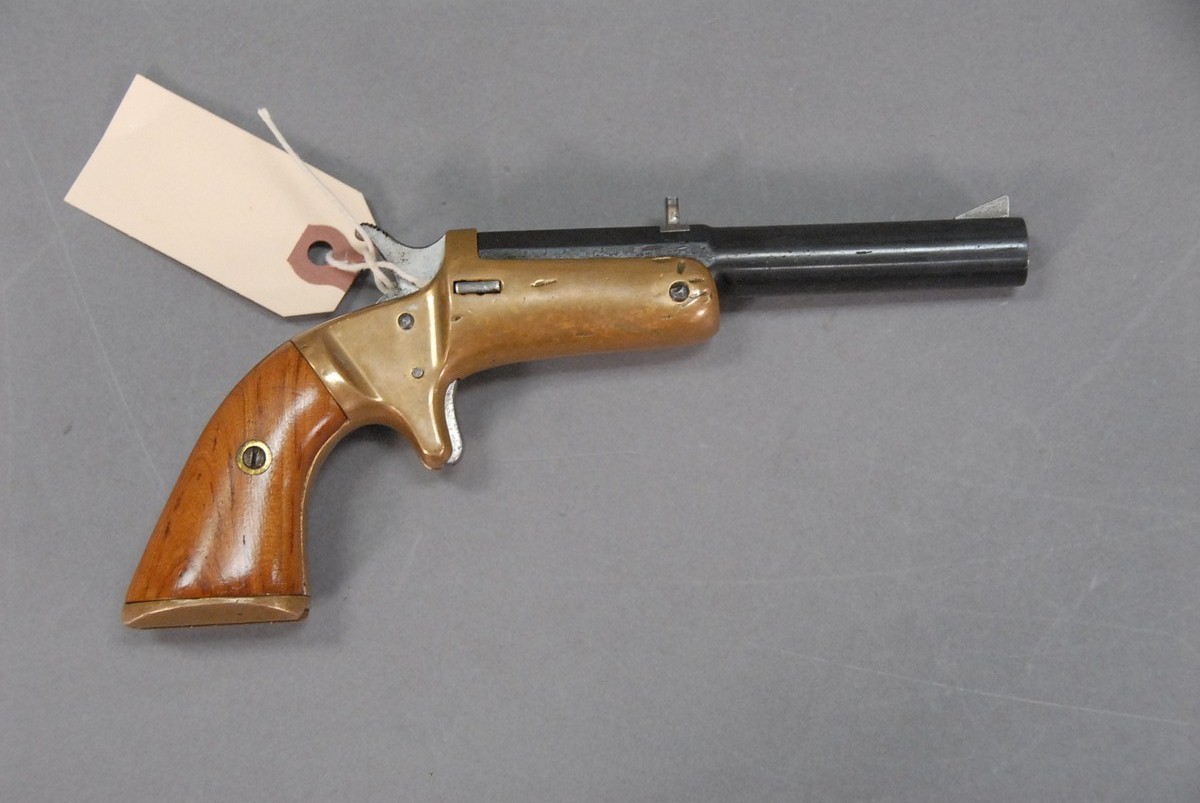 J. Stevens tip up pistol, 4 7/8 round – part octagon barrel, marked J. Stevens & C.C. Chicopee on barrel. 216 SN-1268