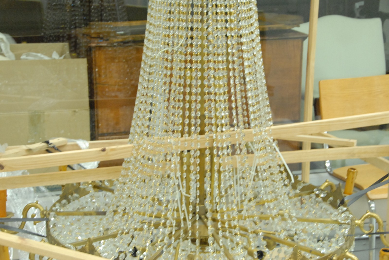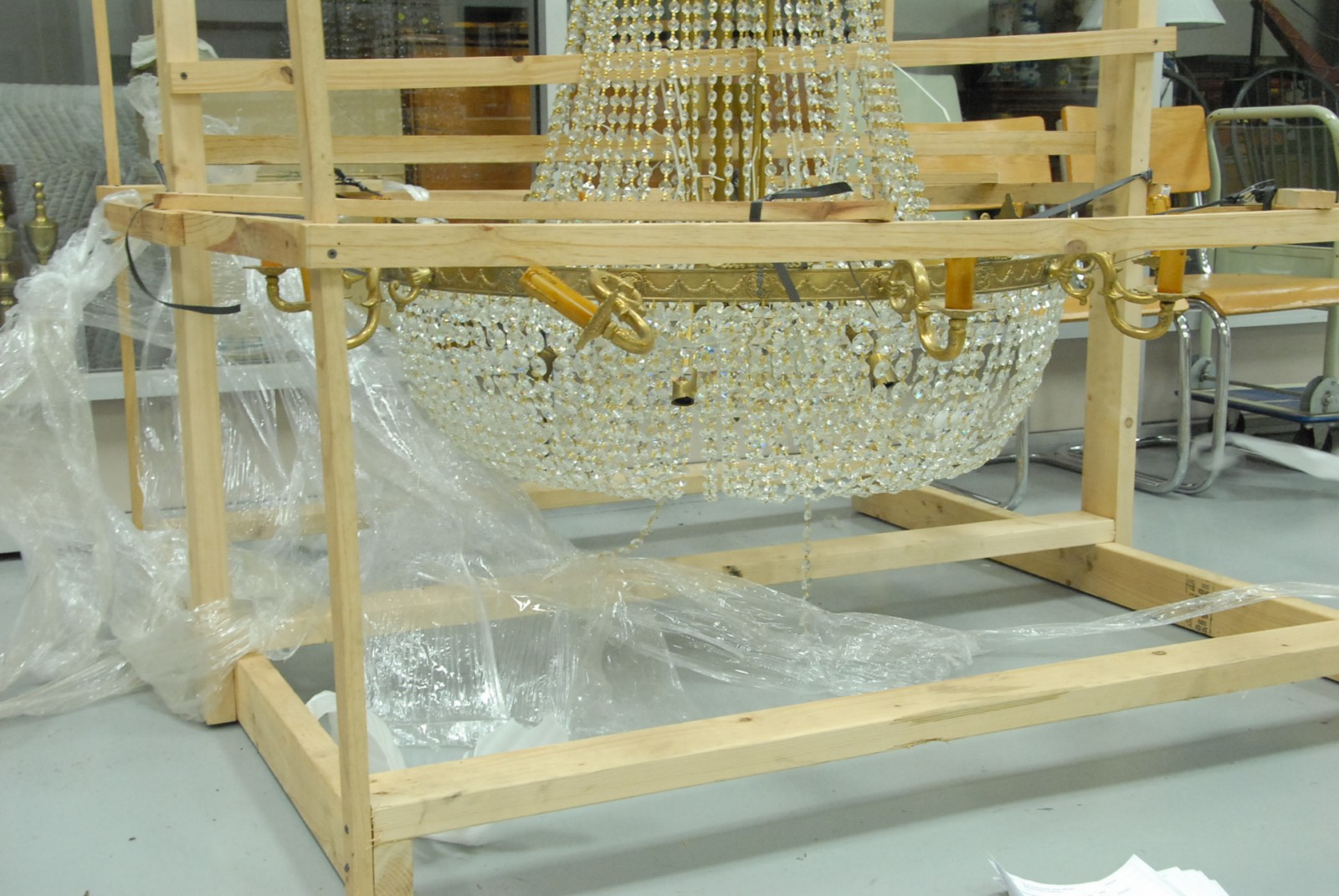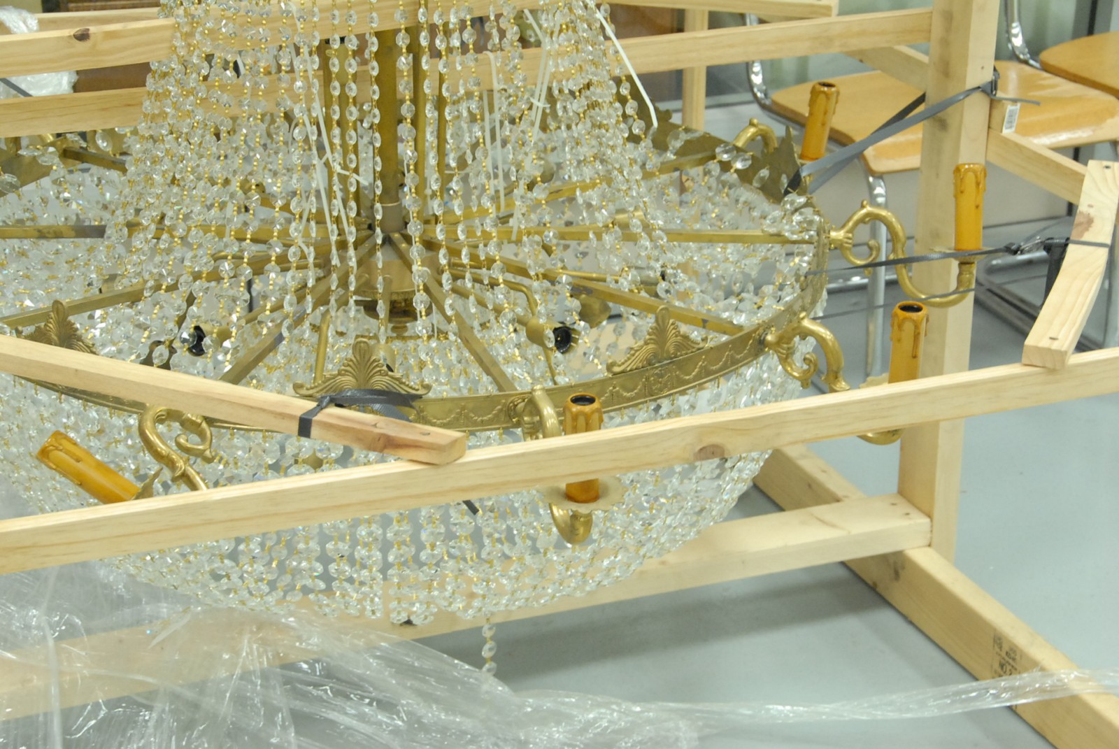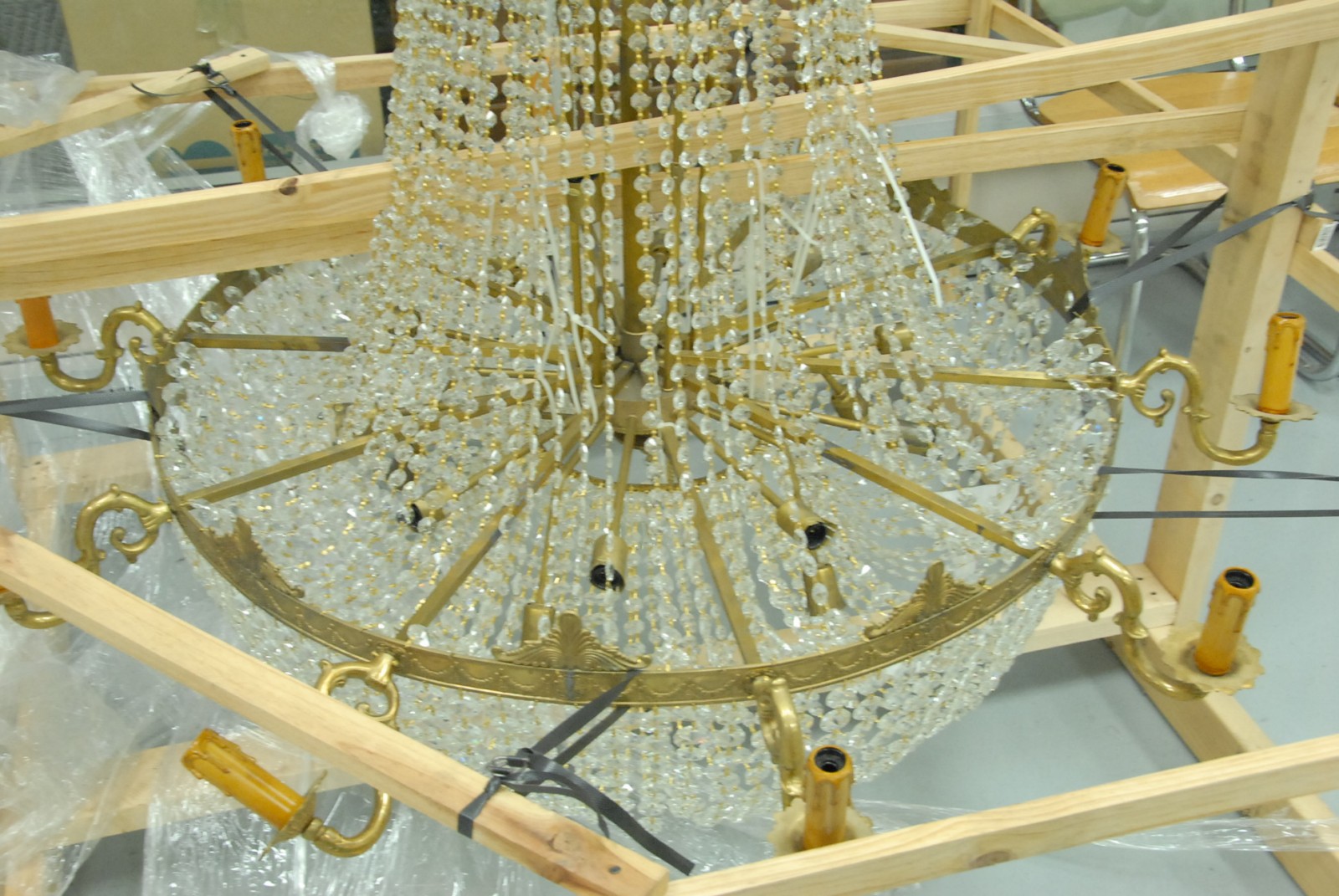 Large brass and crystal ten light chandelier
