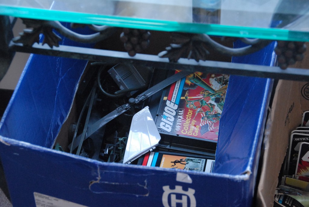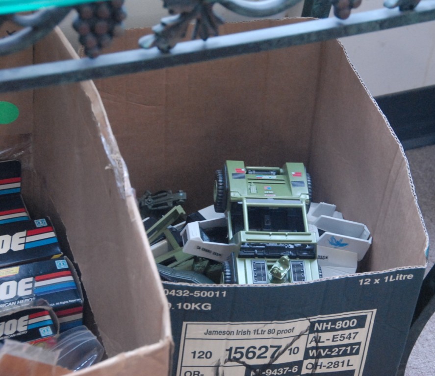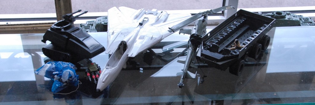 Large grouping of vintage G.I. Joe toys including airplanes, helicopters, tanks, and jeeps some pieces new in boxes.