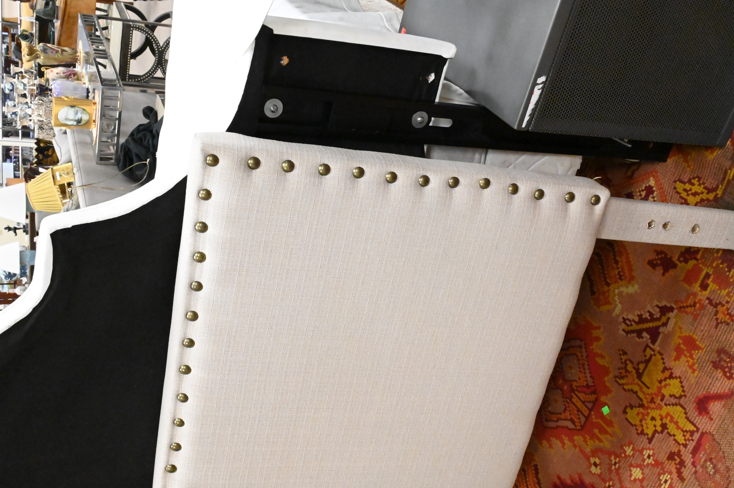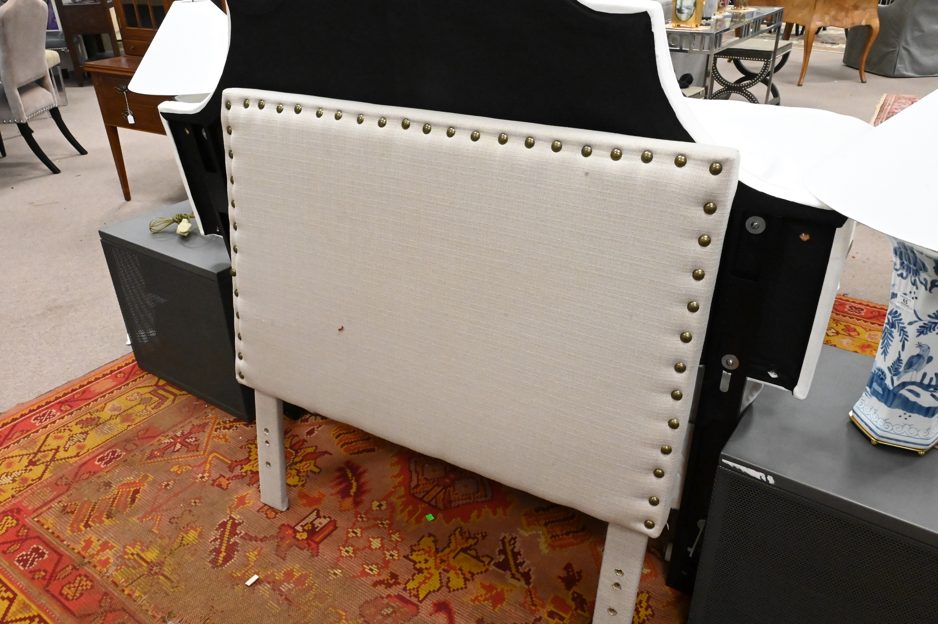 headboard having natural linen upholstery and nailhead accents, side tables having two drawers each