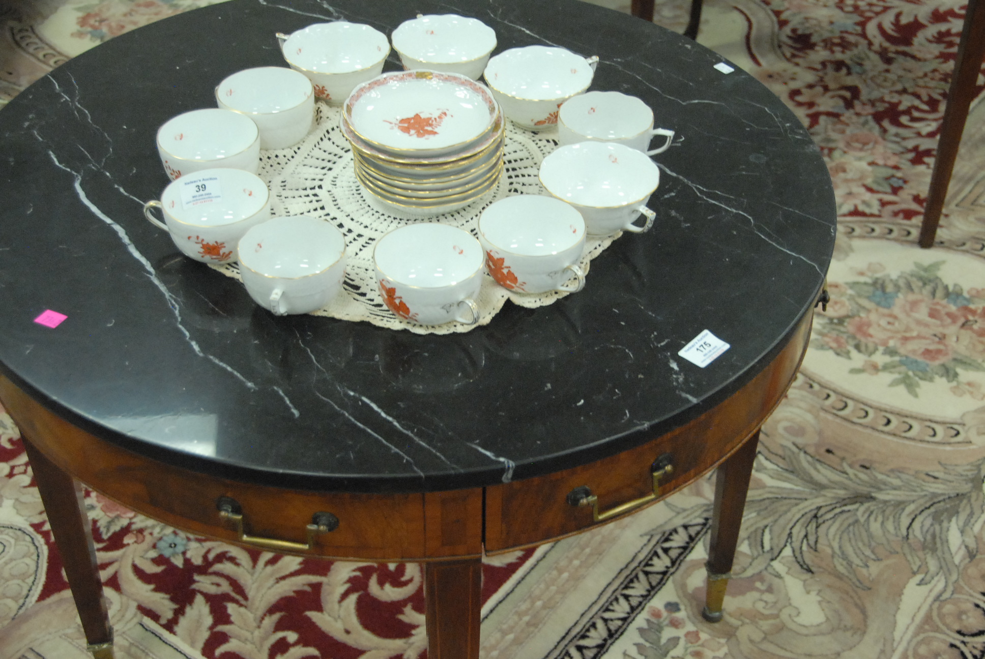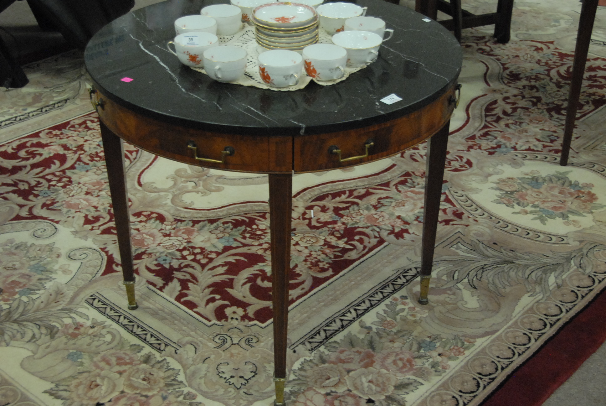 Mahogany round occasional table with marble top. ht. 28 in. dia. 32 in.
