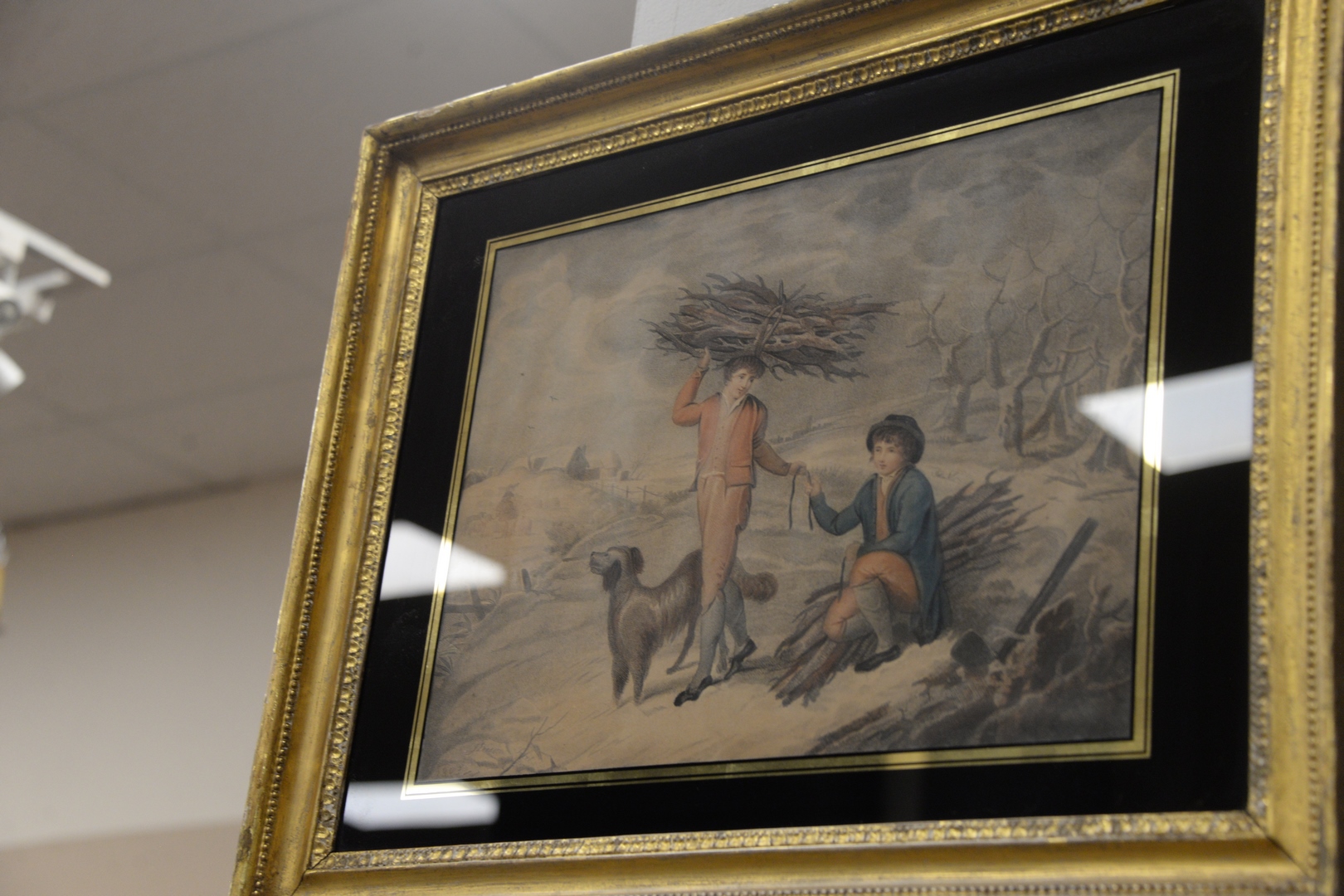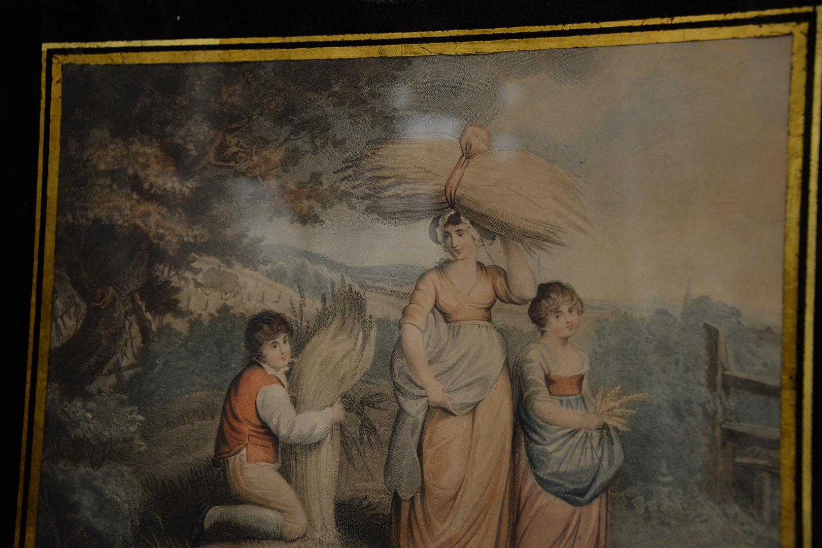 Lot 175: Two Hand Colored Prints, in matching frames, one with three figures carrying hay along with two figures carrying sticks with a dog and a village in the background, inscribed J. Jensen image 13 x 17.