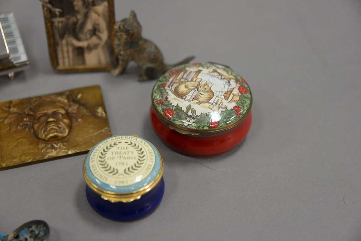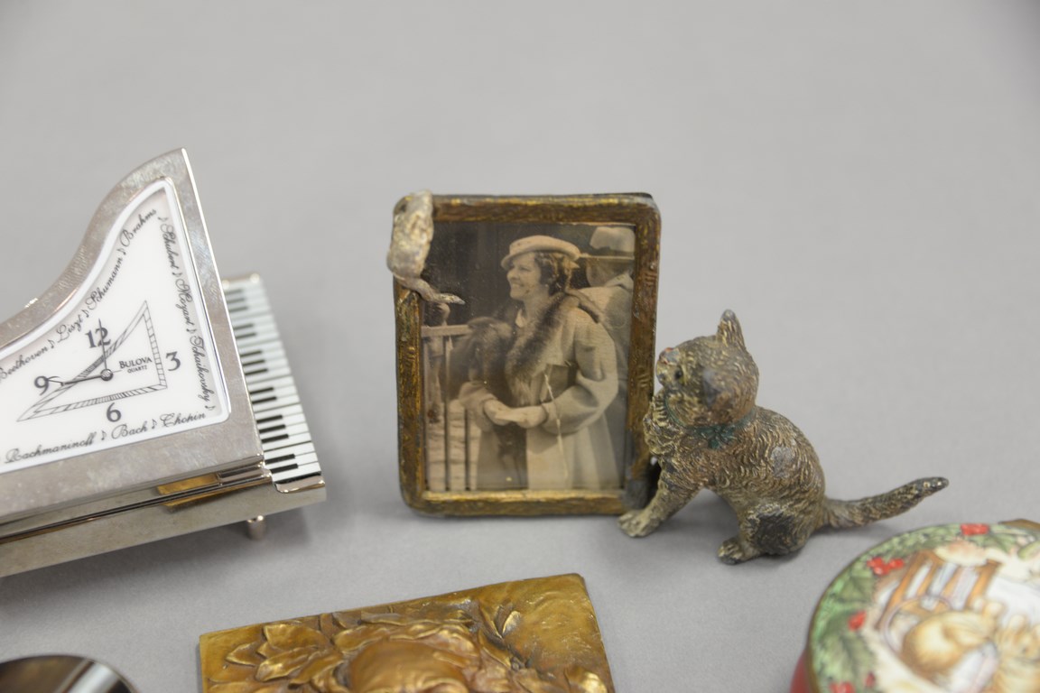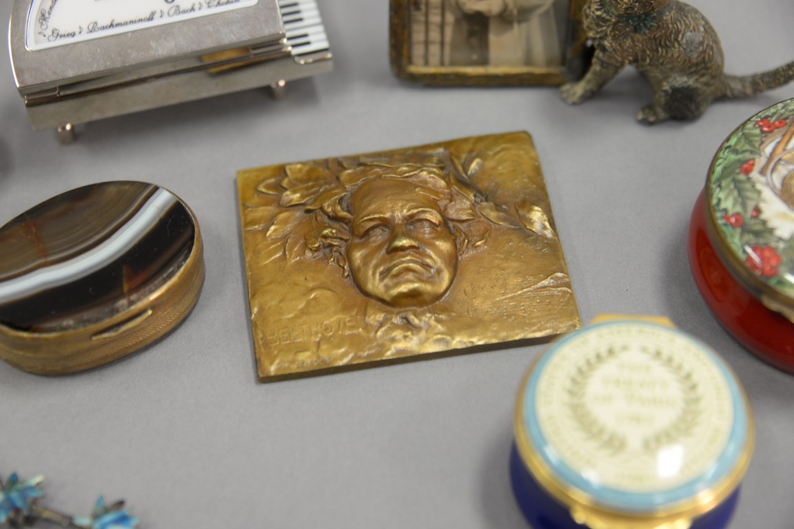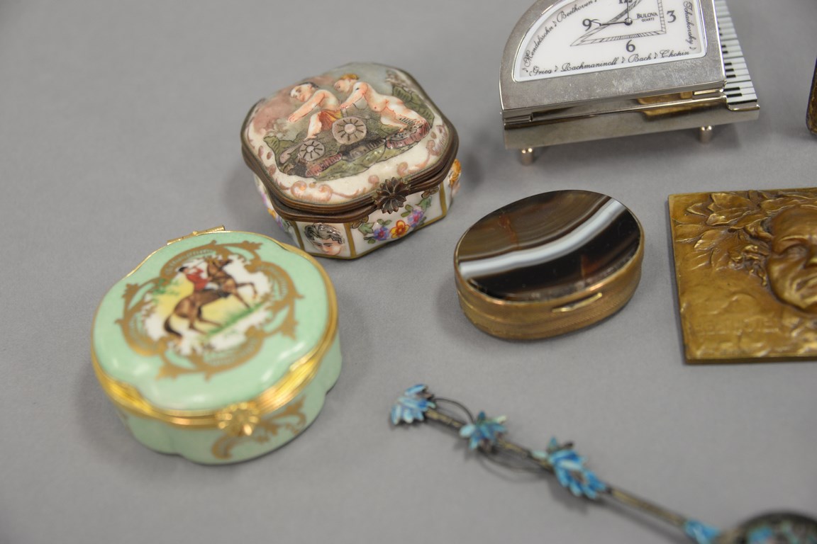 Box lot including Franz Stiasny 1881-1941 small bronze Beethoven plaque, enameled spoon, cat mouse frame, agate box, two enameled boxes, Capo de Monte box, Limoges pill box, and Bulova piano clock.