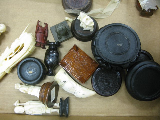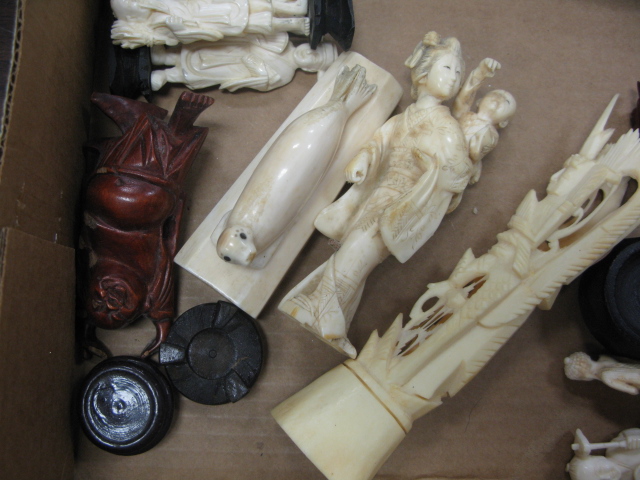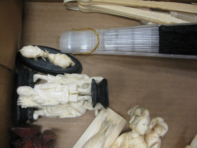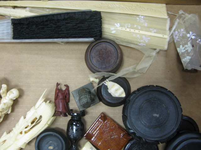 Box of mostly ivory figures including Japanese woman with baby on back, seal, small Oriental figures, teakwood stands and hand fans