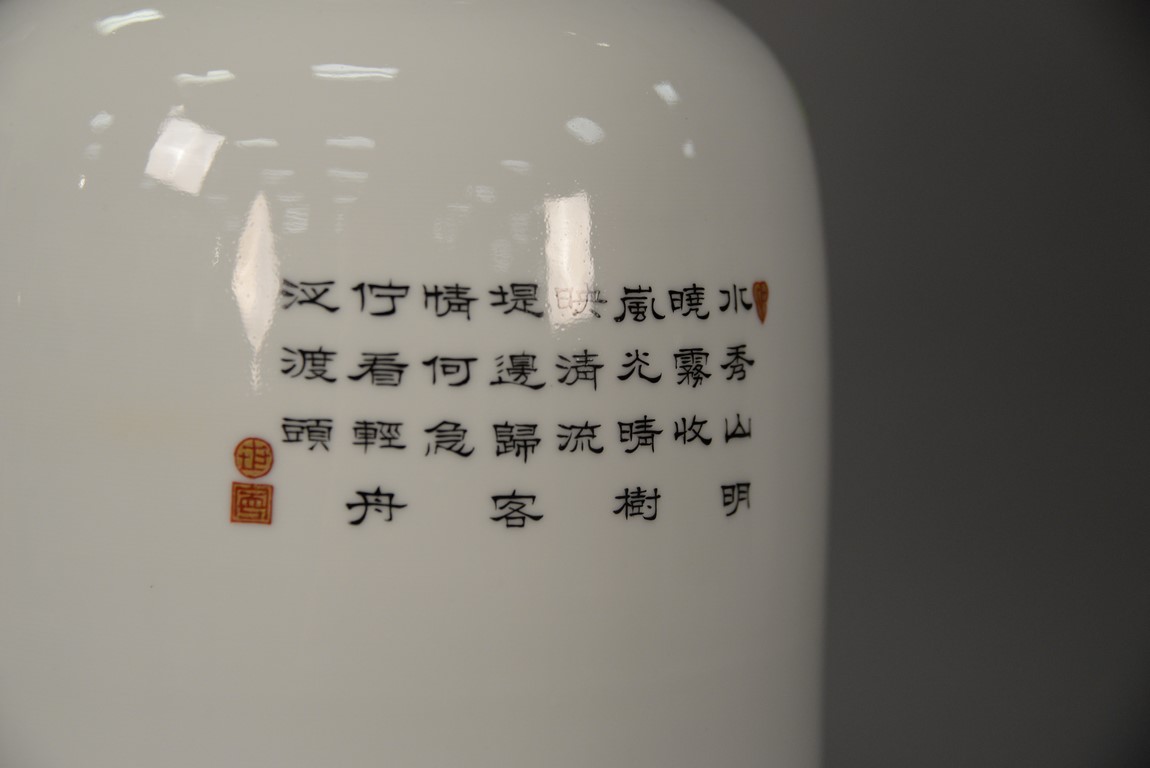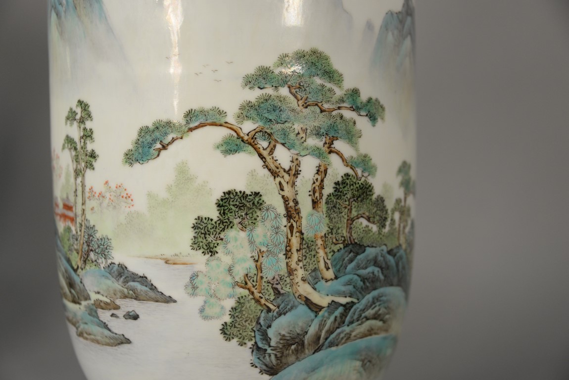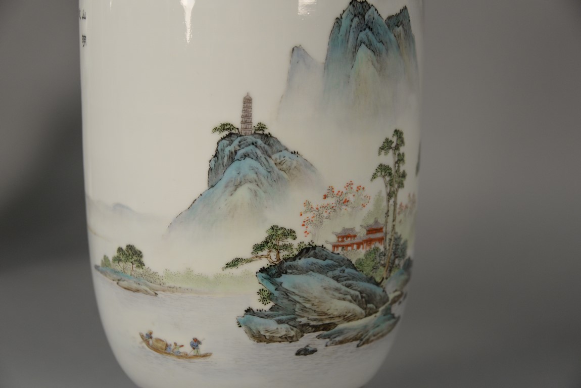Lot 176: Chinese porcelain vase made into a table lamp having painted mountainous landscape on ocean’s edge and signed on back, Republic Period. vase ht. 17 in. total ht. 35 1/2 in.