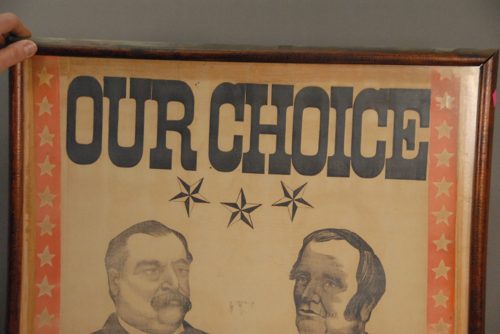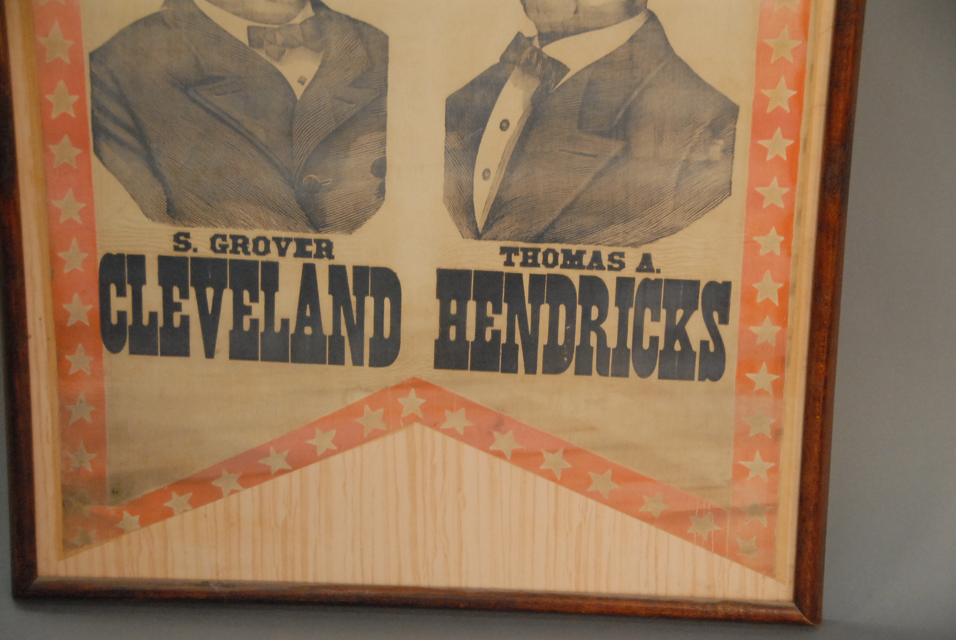Cleveland and Hendricks campaign banner, linen banner with portraits of the 1884 Democratic standard bearers inscribed Our Choice S. Grover Cleveland, Thomas A. Hendricks 33 1/2 x 23