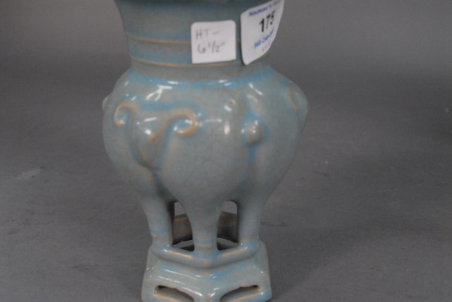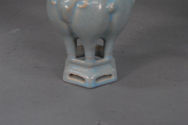 Crackle glazed duck vase having 2 molded duck handles and 2 molded character panels in fitted box