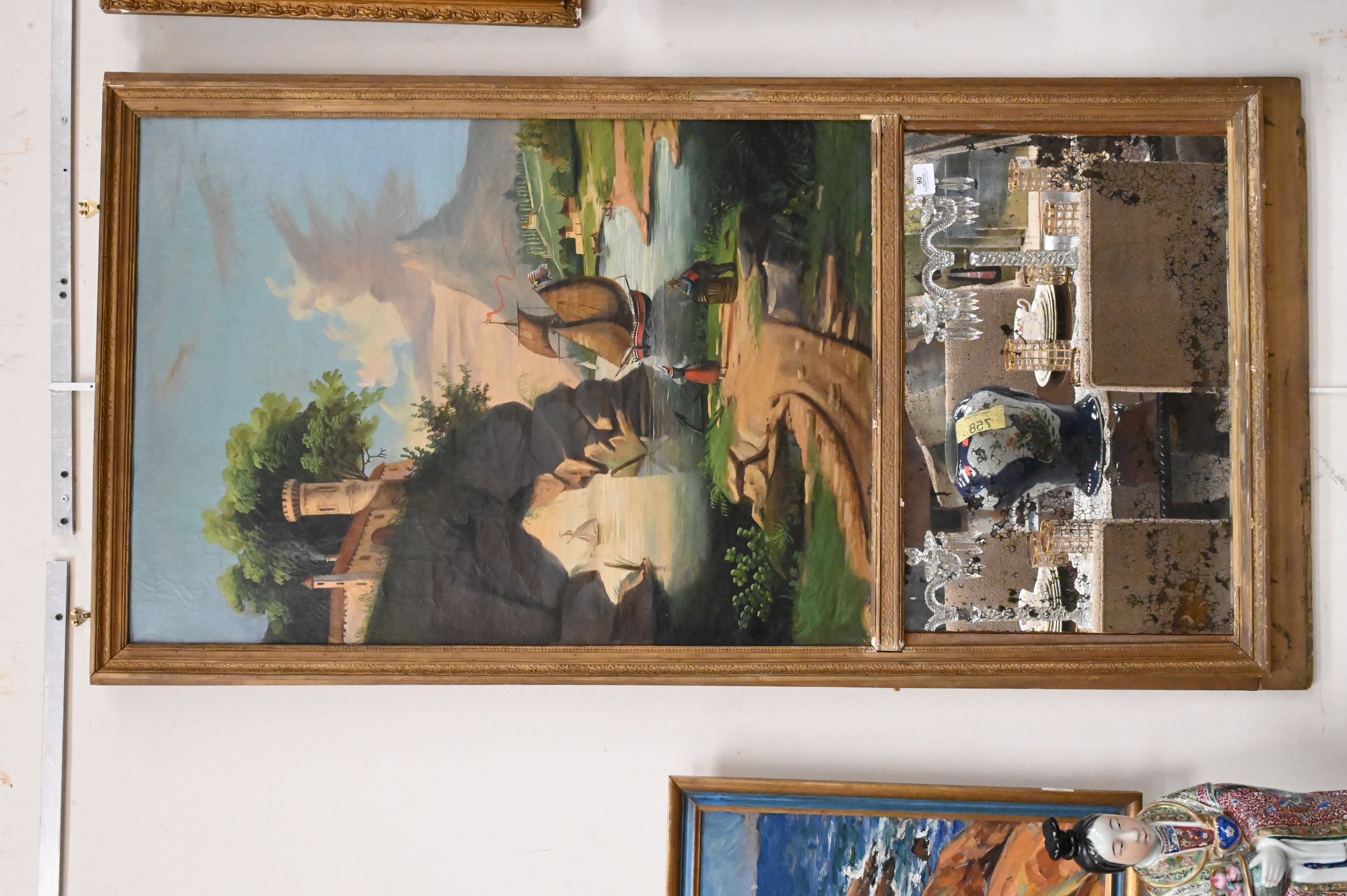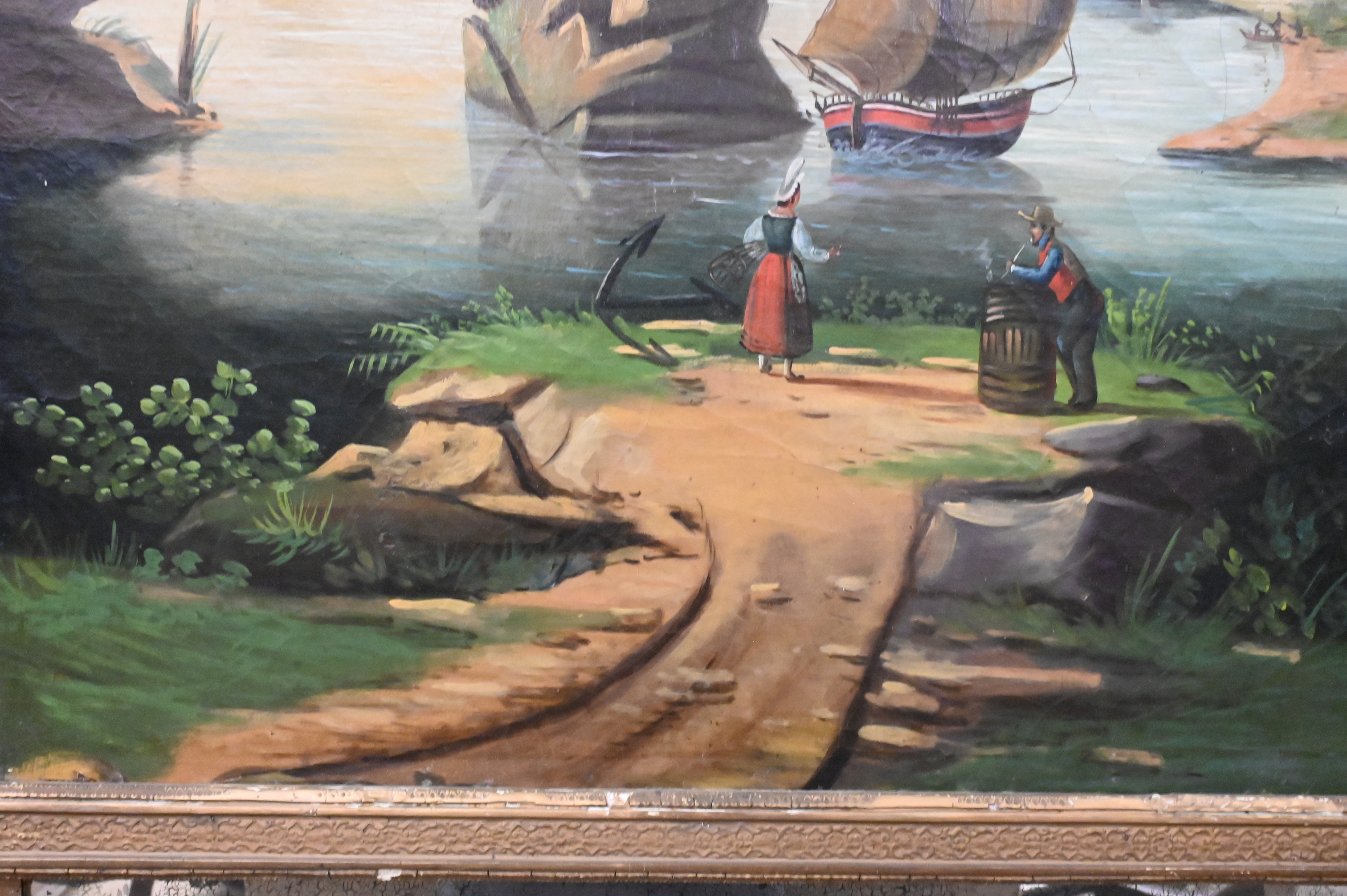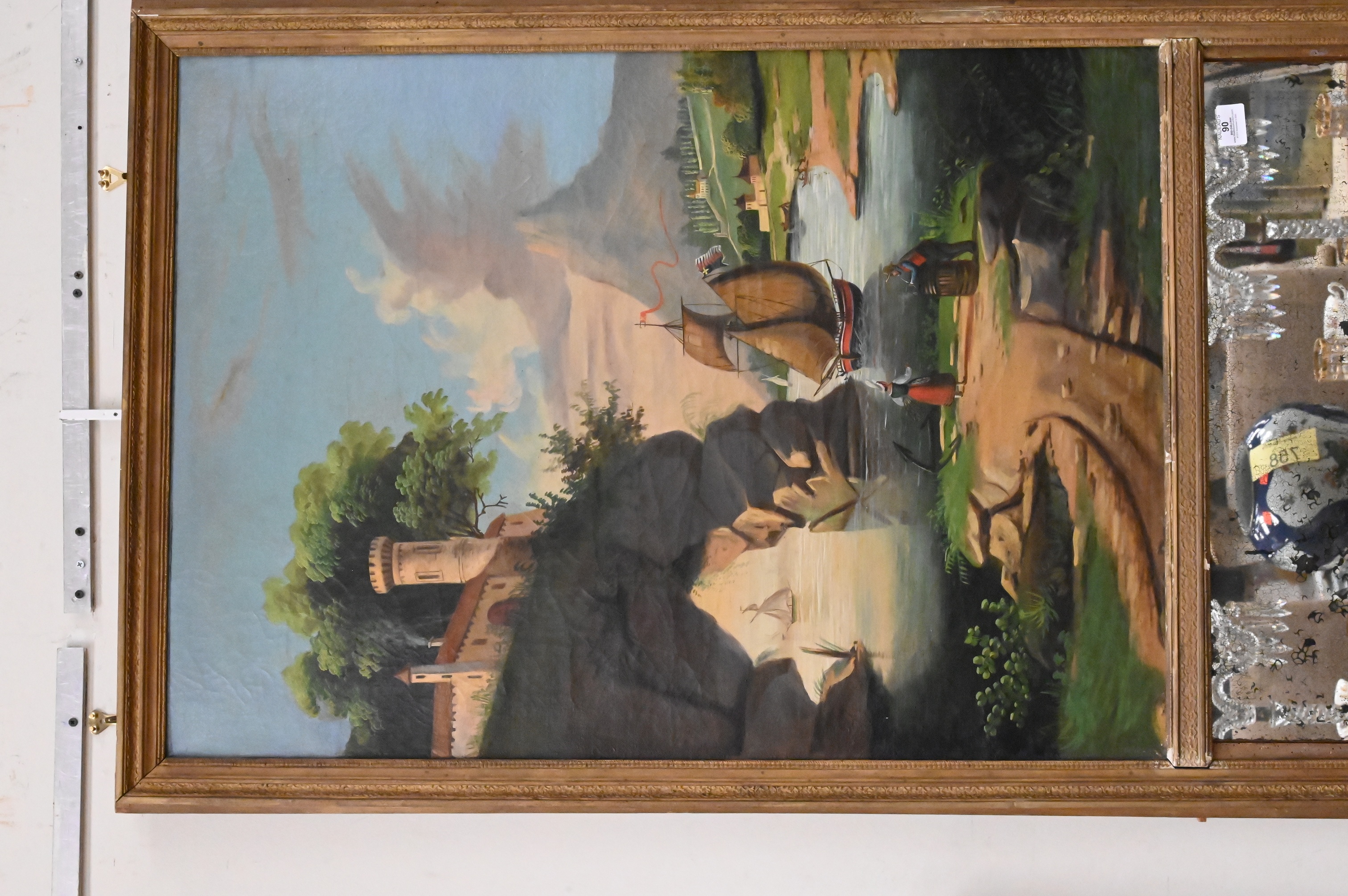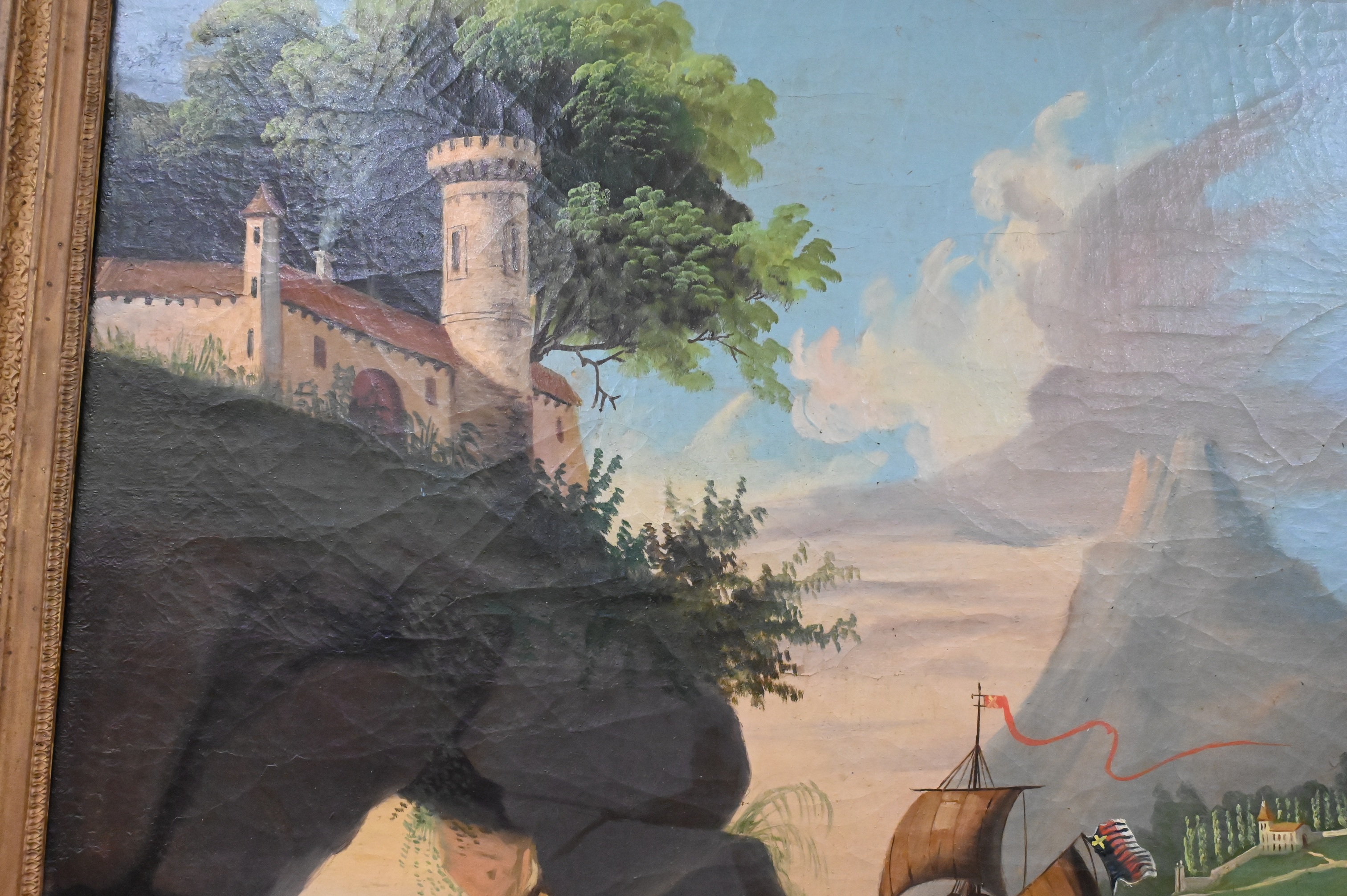 featuring an idealist Swiss landscape of two figures standing before a ship coming to harbor beneath a mountain castle