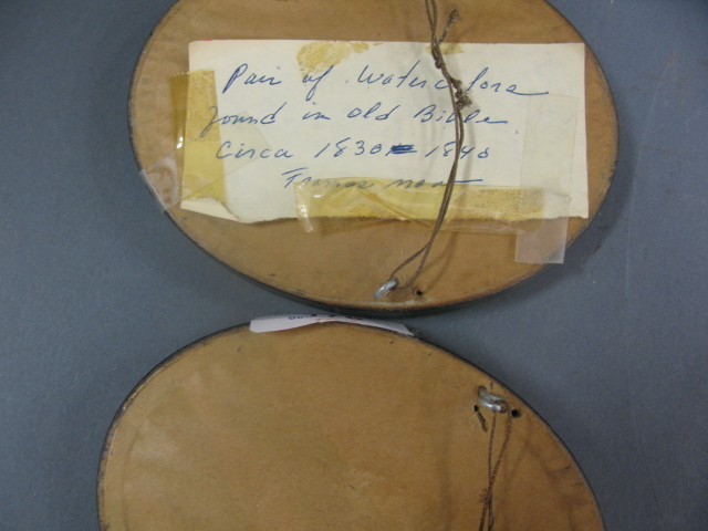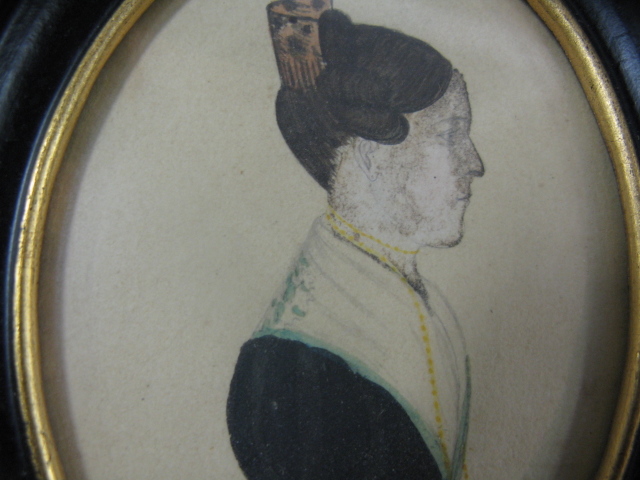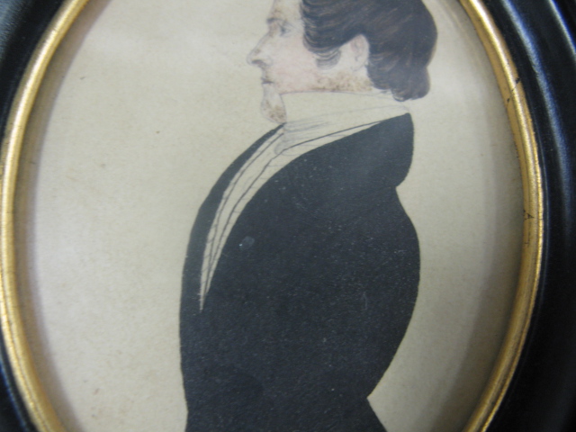 Pair of primitive oval watercolor silhouettes of man and woman.