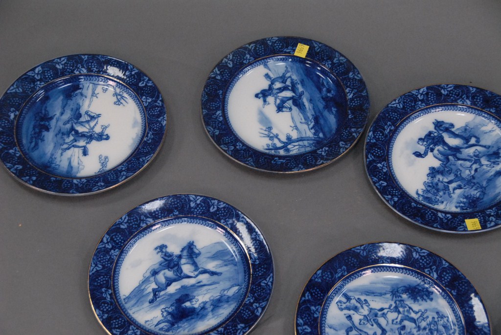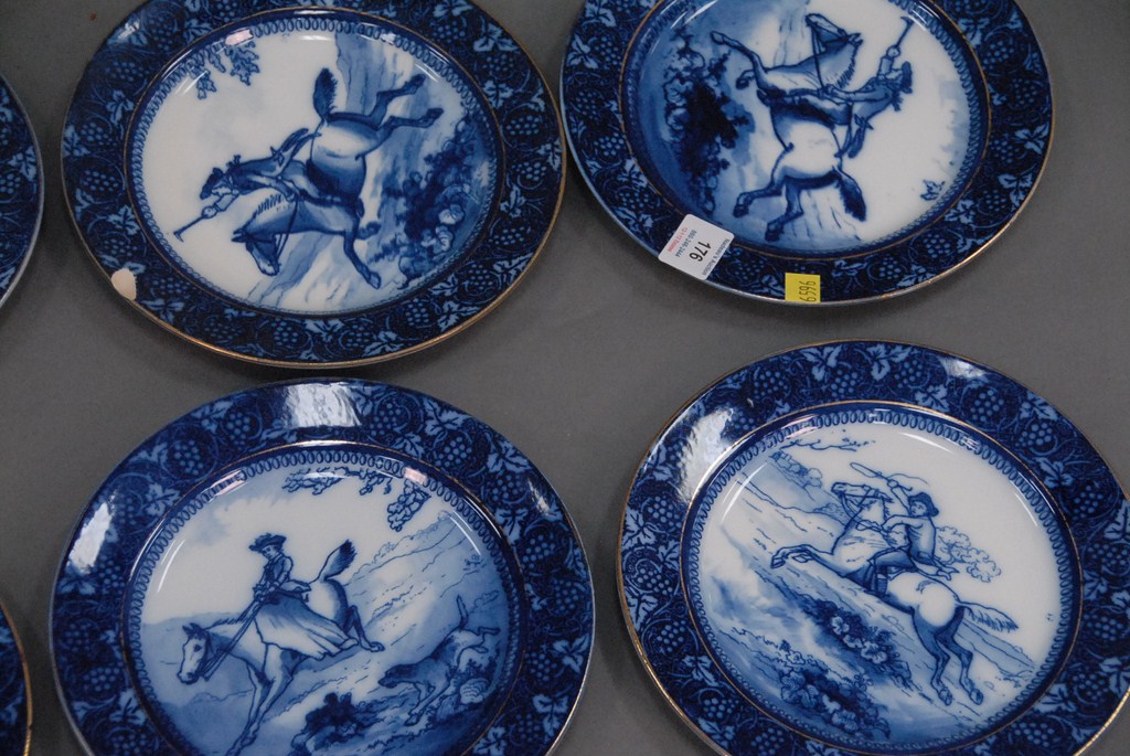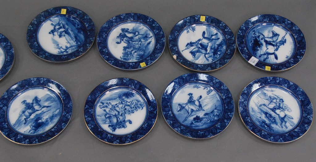 Set of nine Royal Doulton blue and white plates, each with men on horseback.