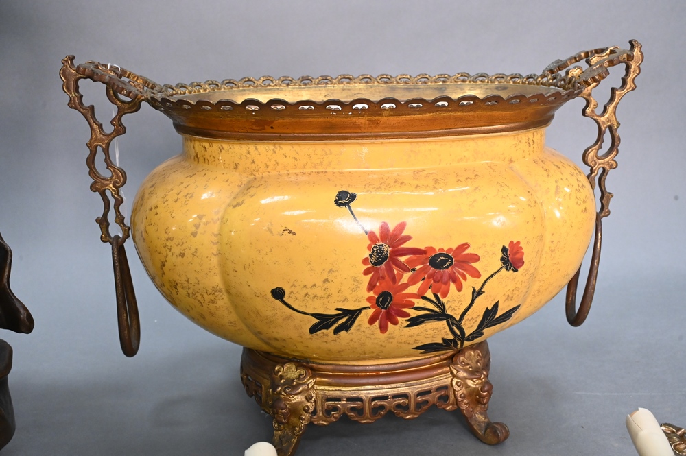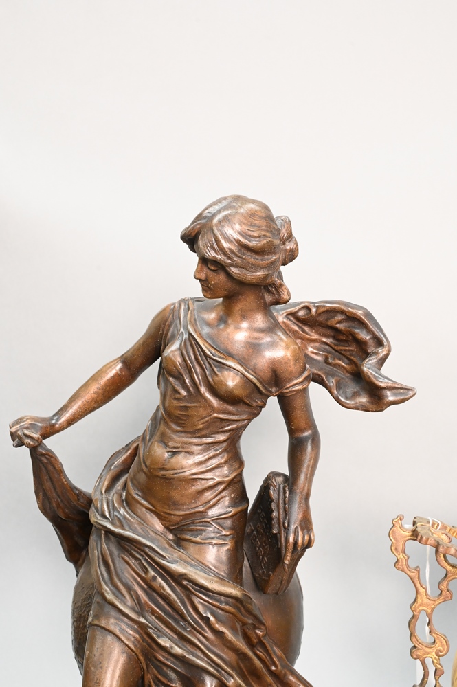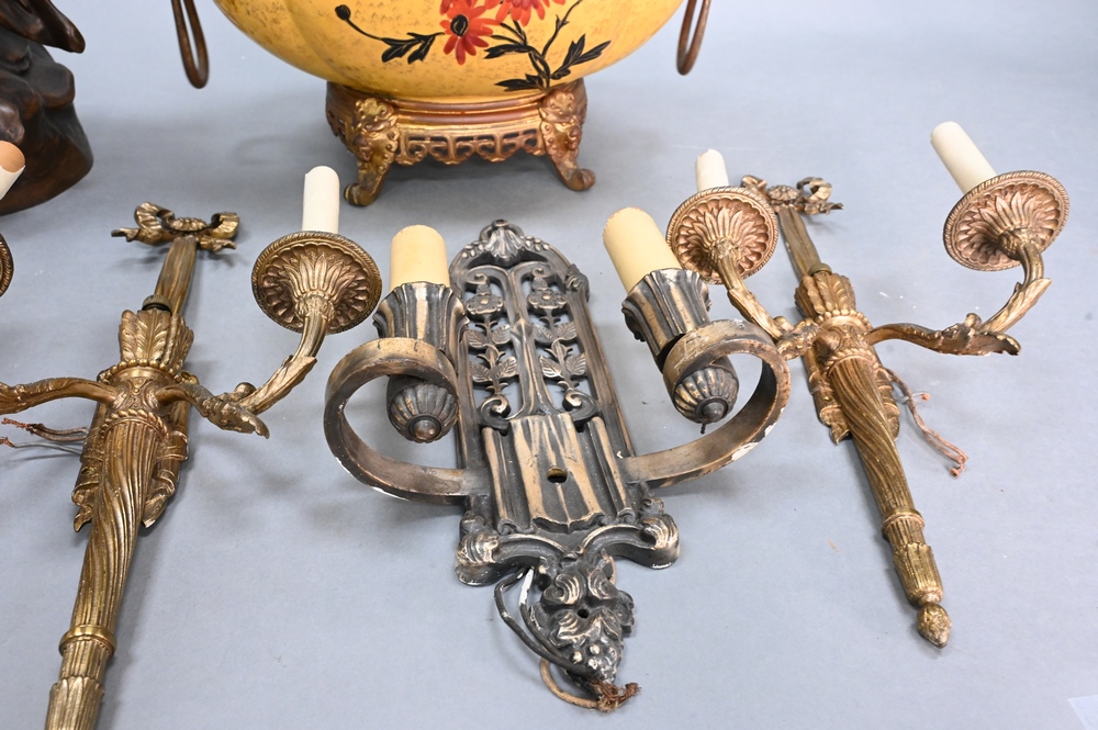 Lot 176: Six Piece Assorted Group, to include after Victor Rousseau Les Secrets de la Terre white metal figure, two pairs of sconces, and a ceramic center pot with bronze mounts, height 23 inches.