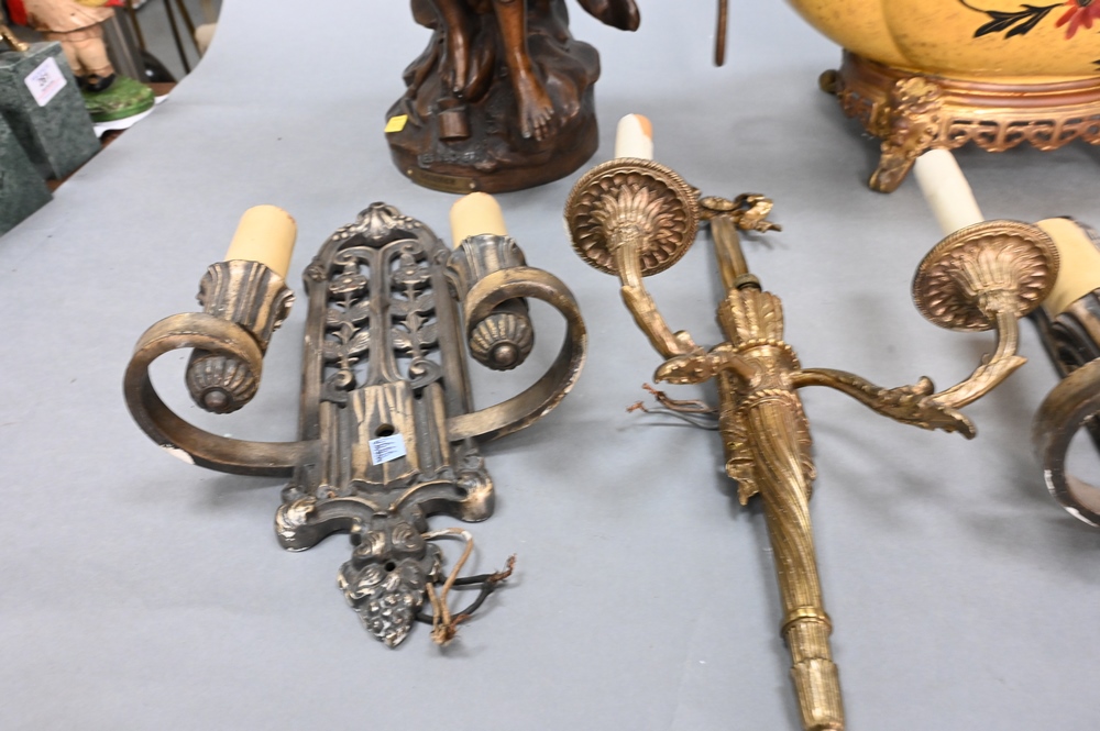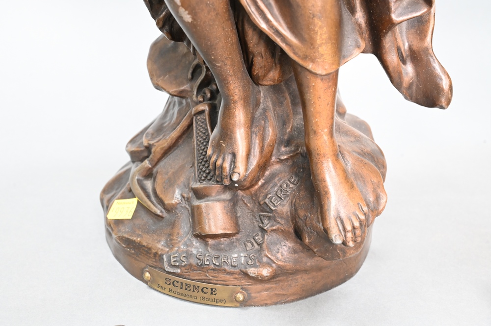 Six Piece Assorted Group, to include after Victor Rousseau Les Secrets de la Terre white metal figure, two pairs of sconces, and a ceramic center pot with bronze mounts, height 23 inches.