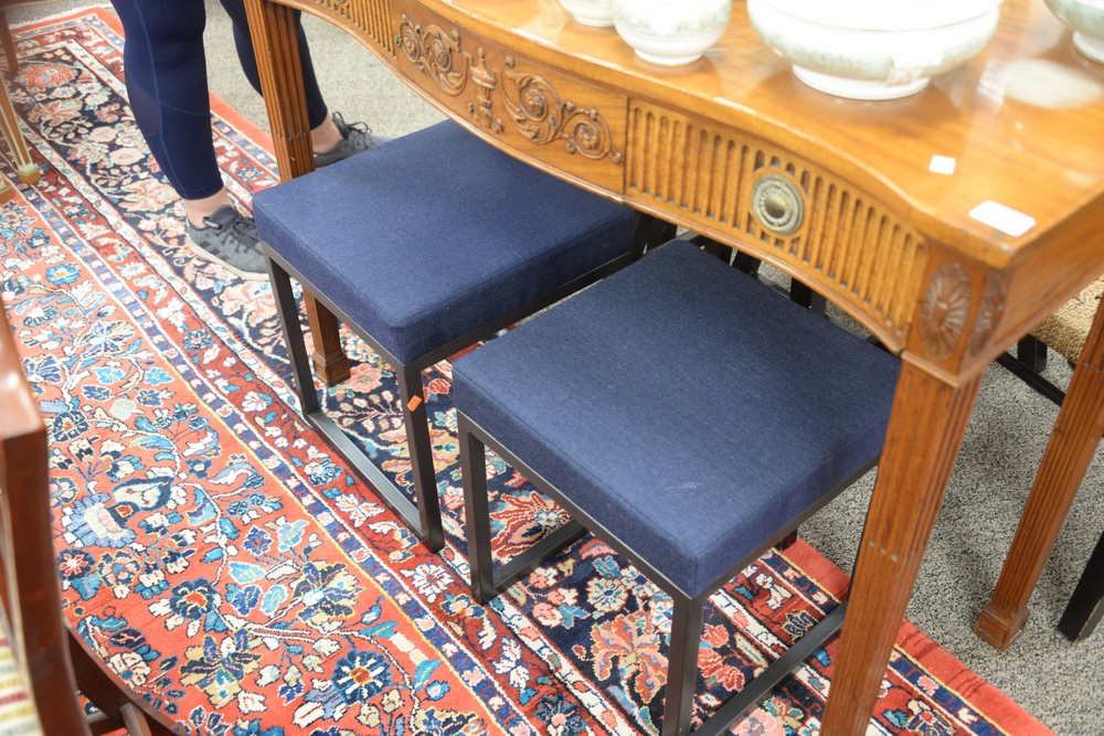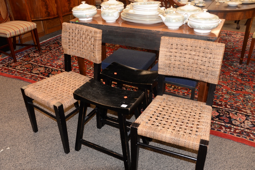 Six Piece Lot, to include a pair of Desiron stools; a pair of Palecek sea glass and panama wood side chairs, along with a pair of black stools in black paint, height 21 inches, Provenance: David and Cynthia Kim, 22 Stoney Wylde Lane, Greenwich, Connecticut. View home by visiting: https://www.zillow.com/homedetails/22-Stoney-Wylde-Ln-Greenwich-CT-06830/177238281_zpid/.