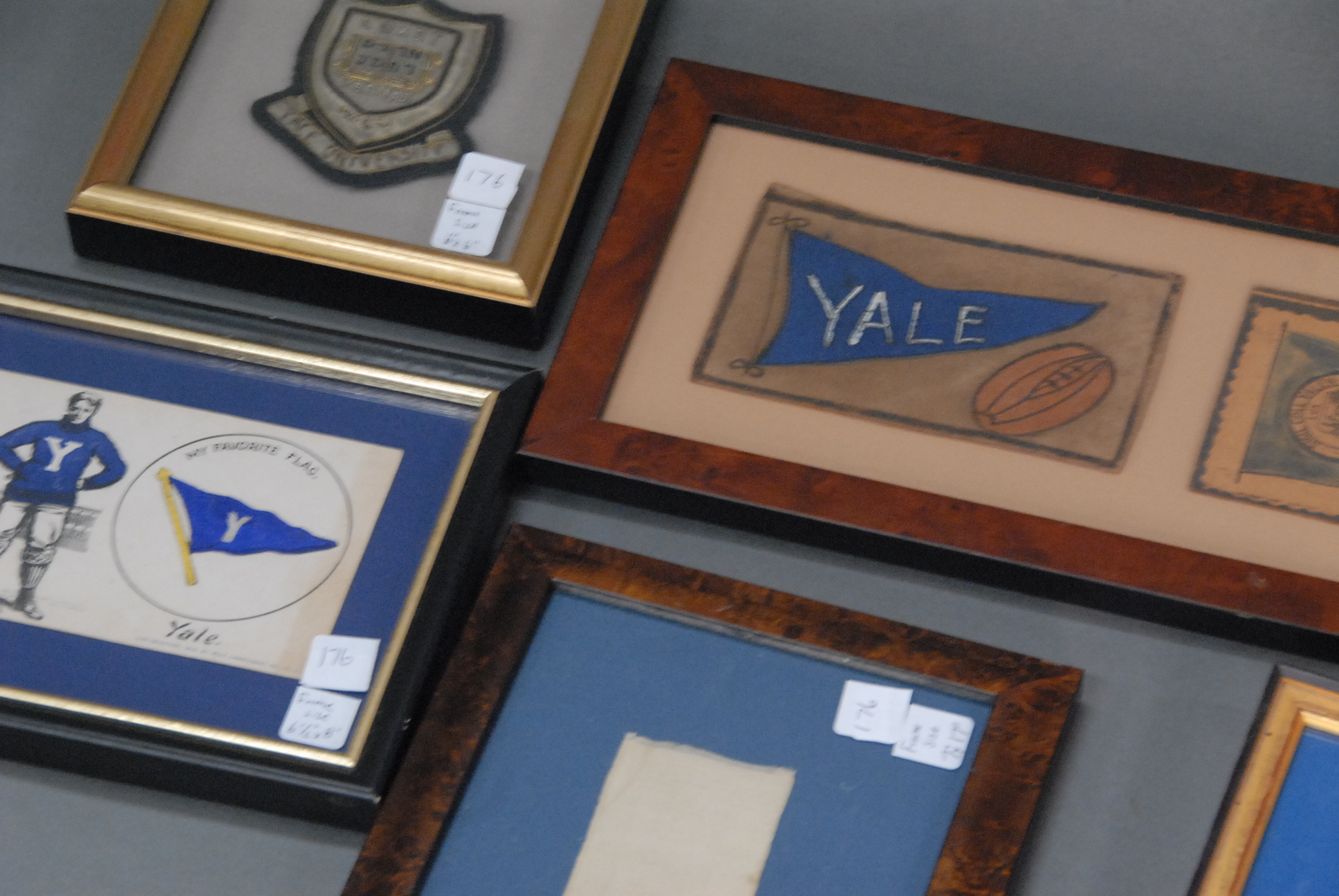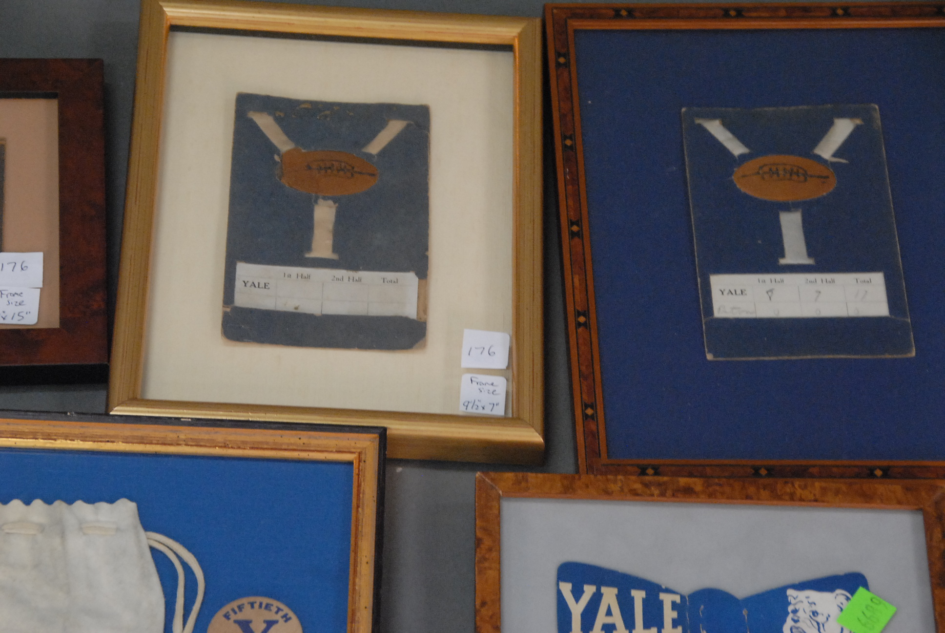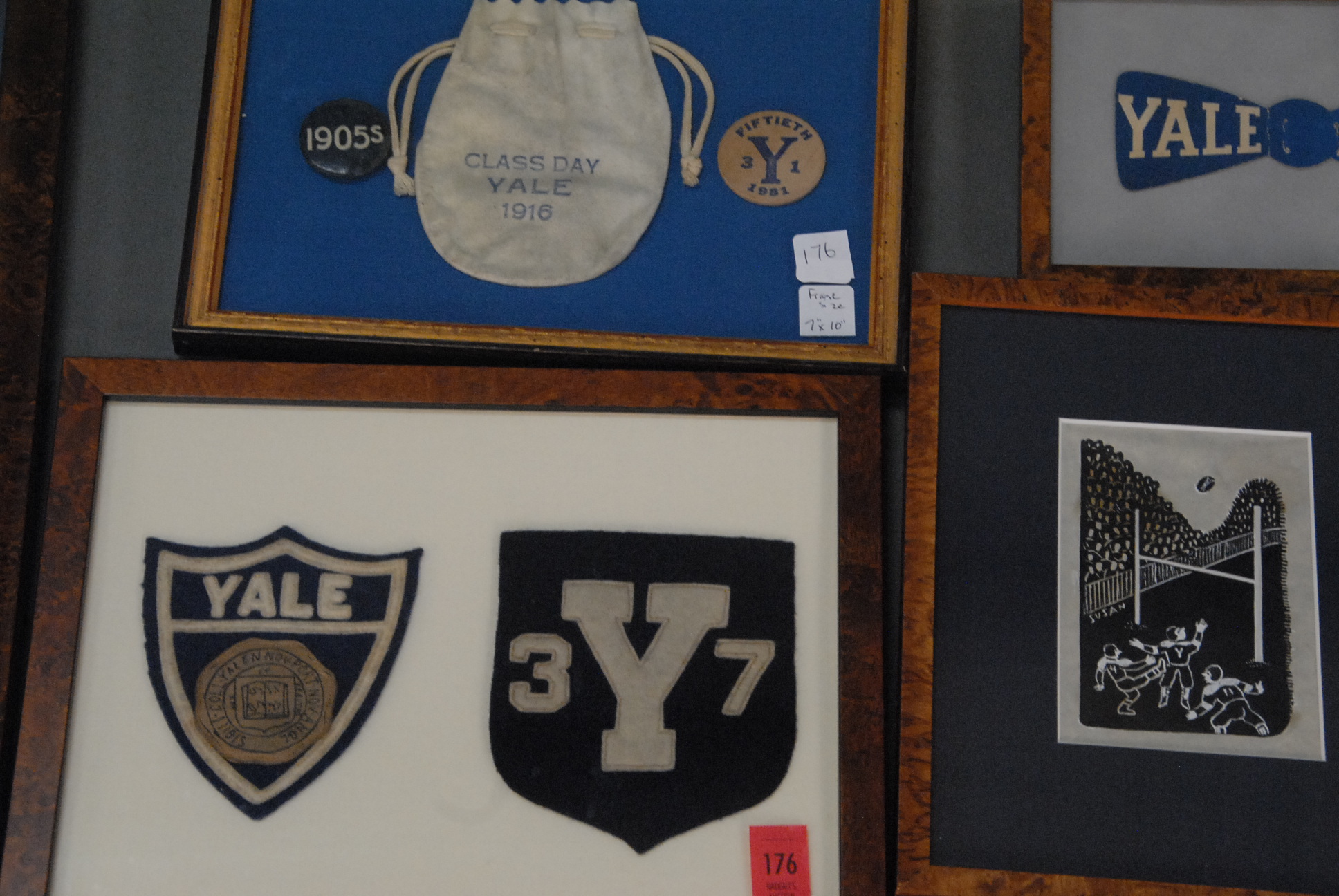Lot 176: Ten piece framed lot of Yale memorabilia patches, paper bow-tie, small sack, etc., frame sizes: 6 x 6 – 9 x 11.