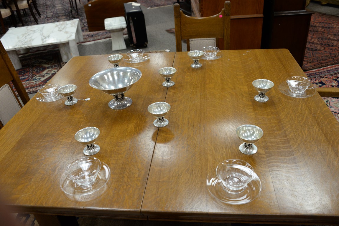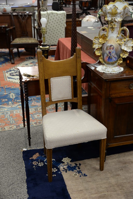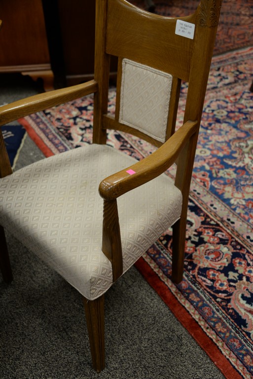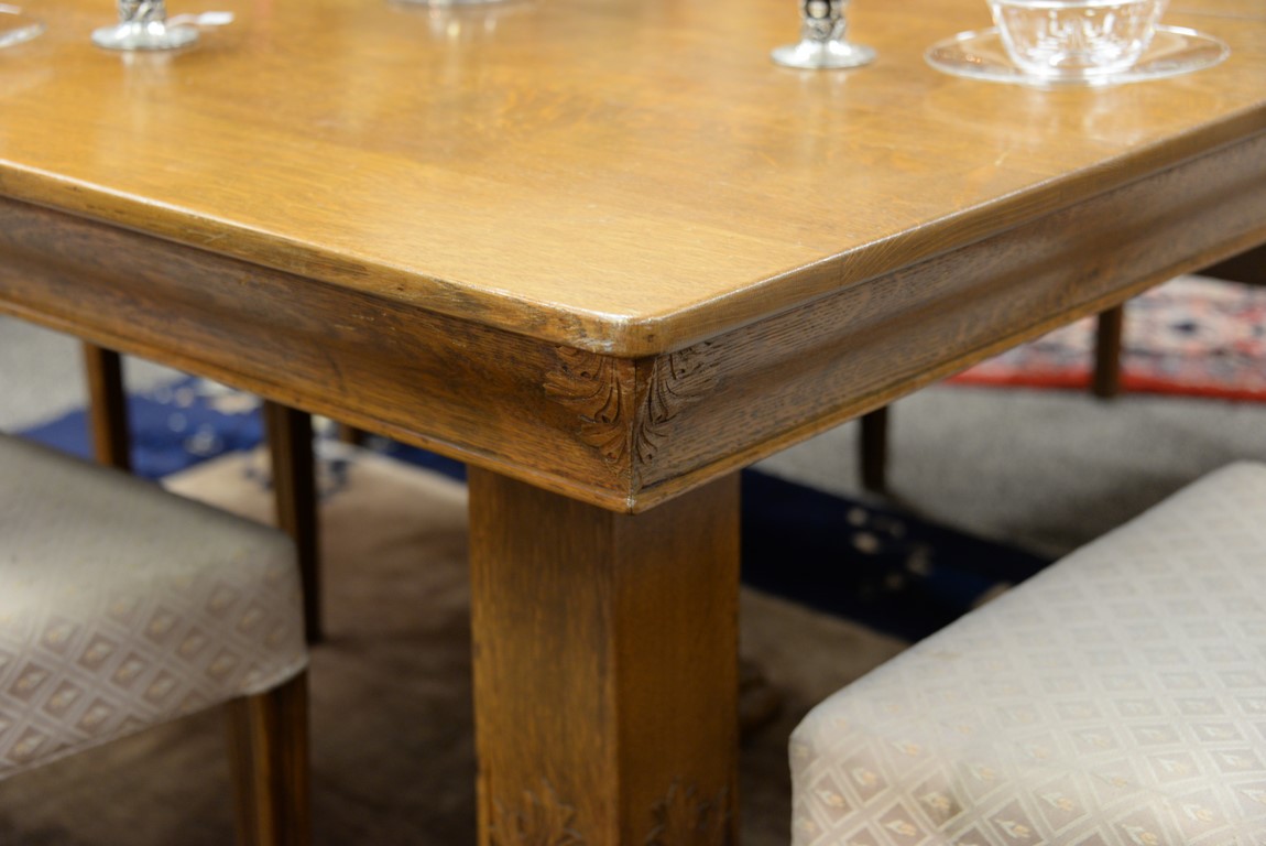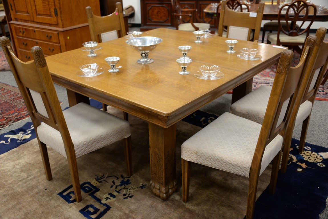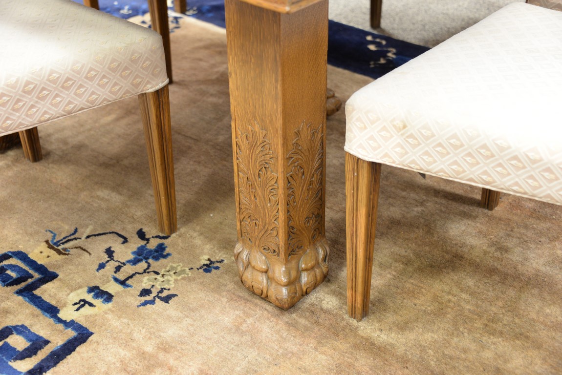 Lot 176: Toby Furniture oak Victorian seven piece set to include square table with five carved legs ending in claw feet with two leaves and s…
