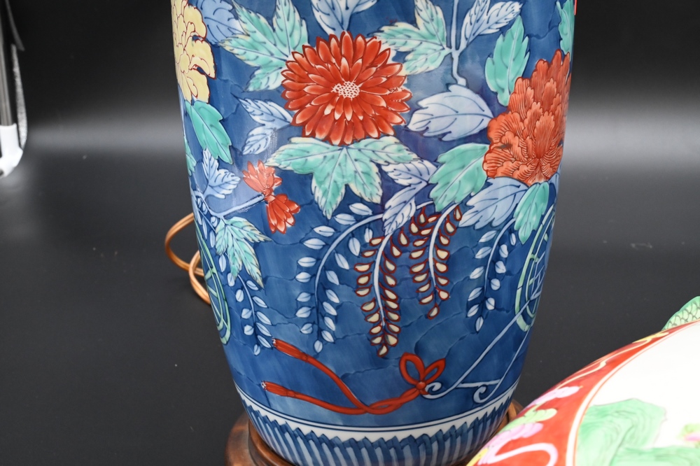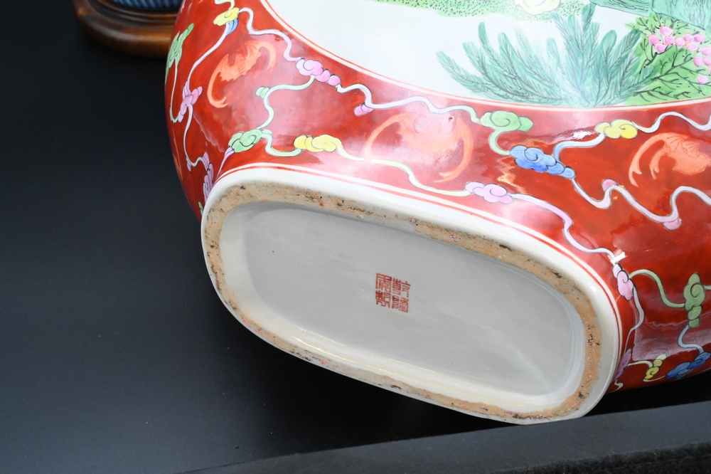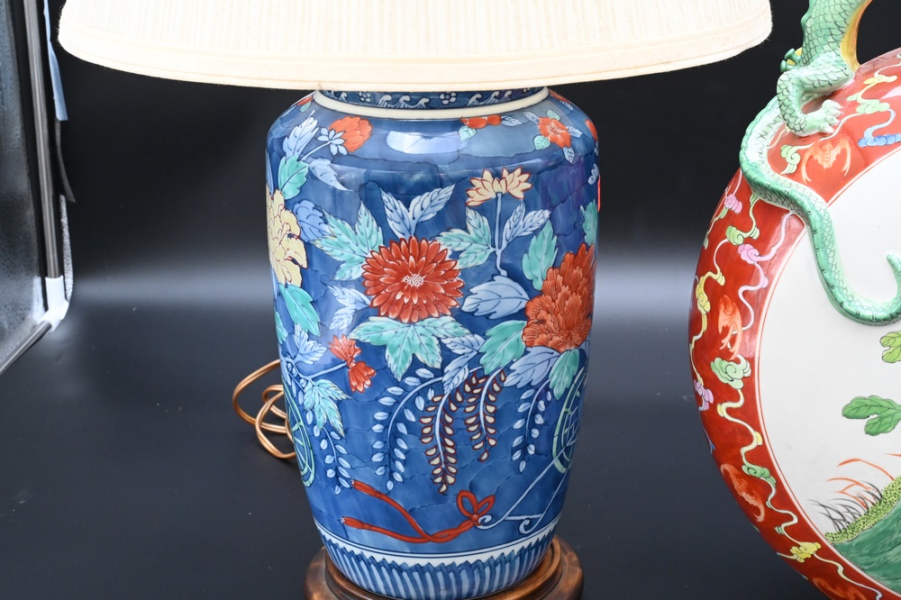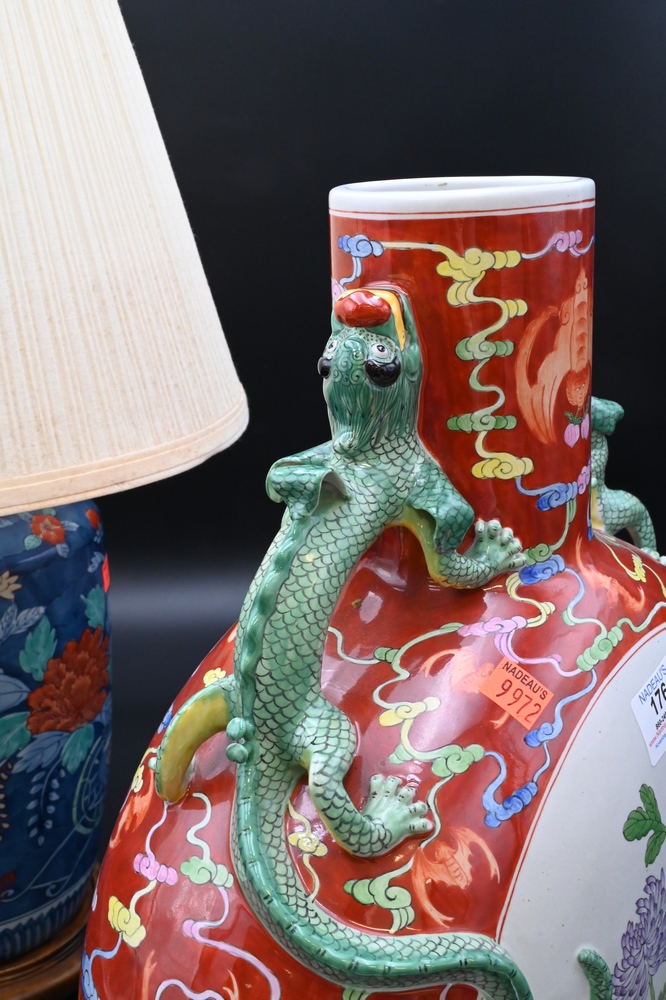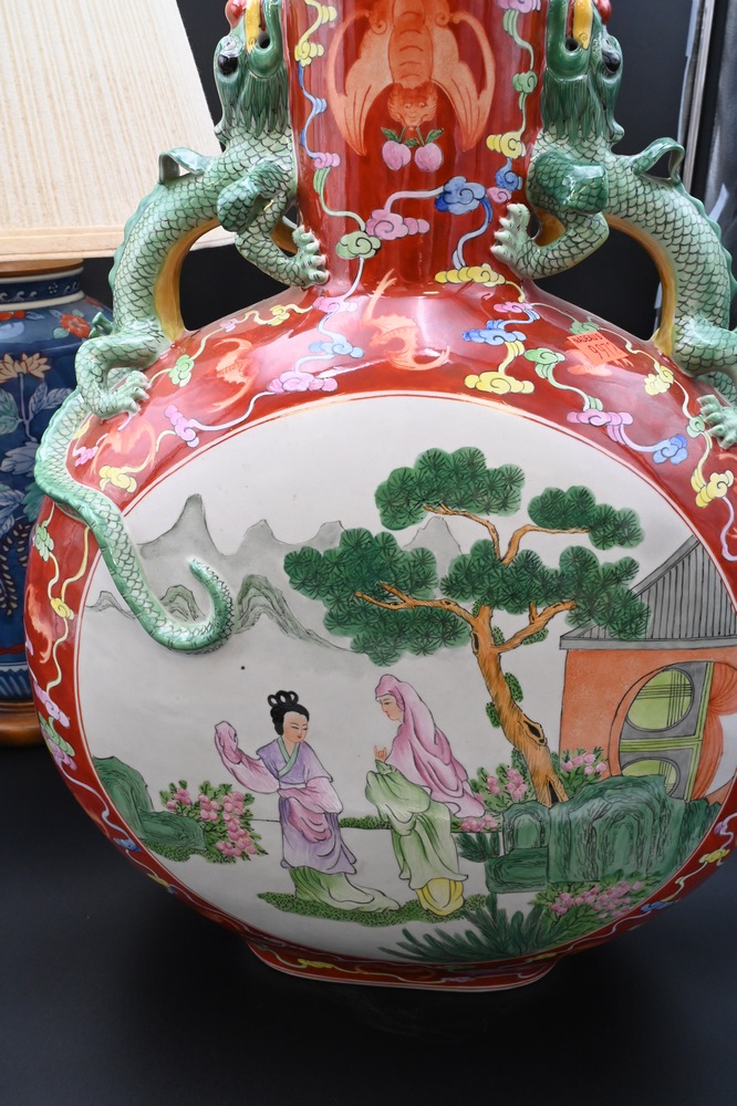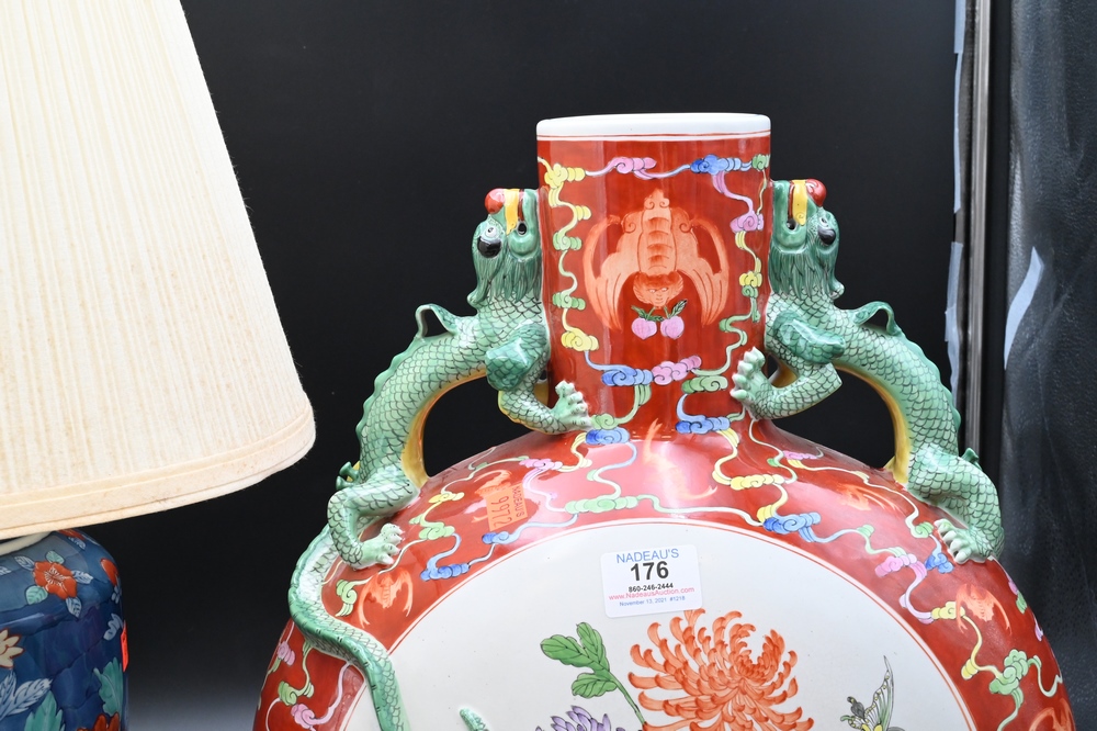 Lot 176: Two Chinese Porcelain Vases, to include a large moon flask having dragon handles, 19 inches; along with a blue with red flower vase, made into a table lamp, vase height 11 1/2 inches, total height 26 inches.