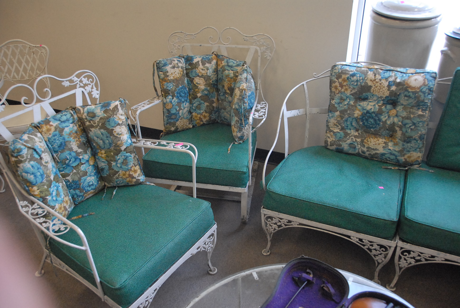 Lot 176: Woodard six piece lot including three chairs to make a sofa plus two rockers and two armchairs some cushions missing.