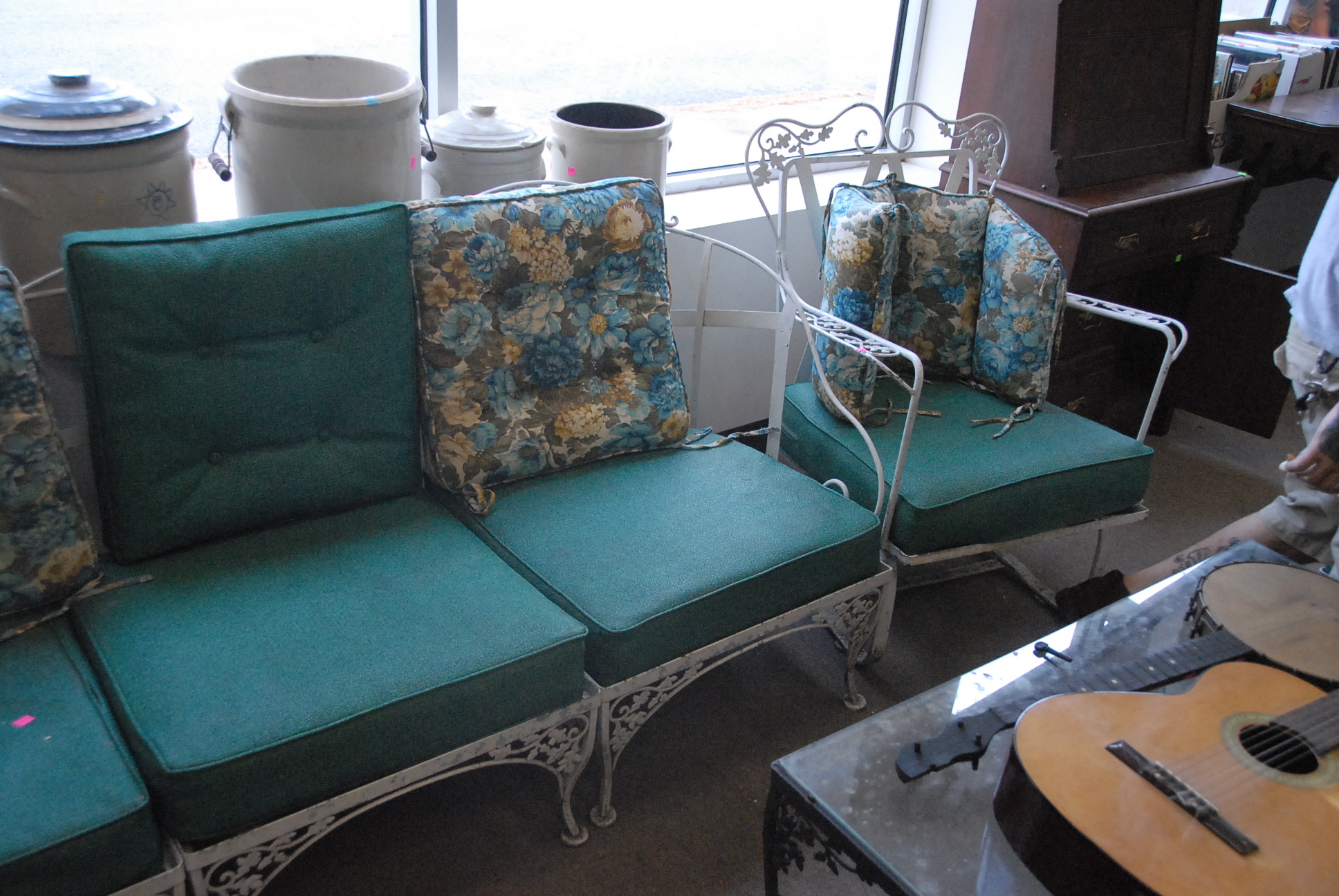 Woodard six piece lot including three chairs to make a sofa plus two rockers and two armchairs some cushions missing.