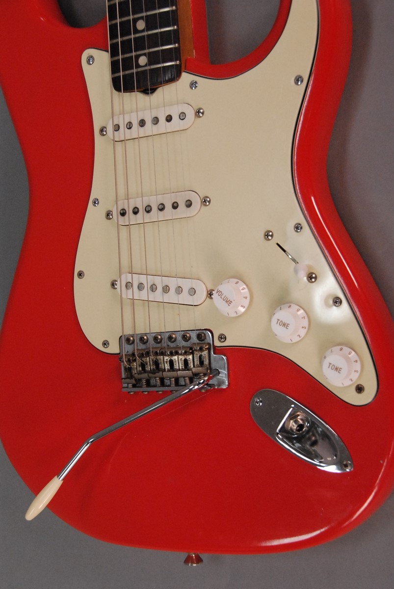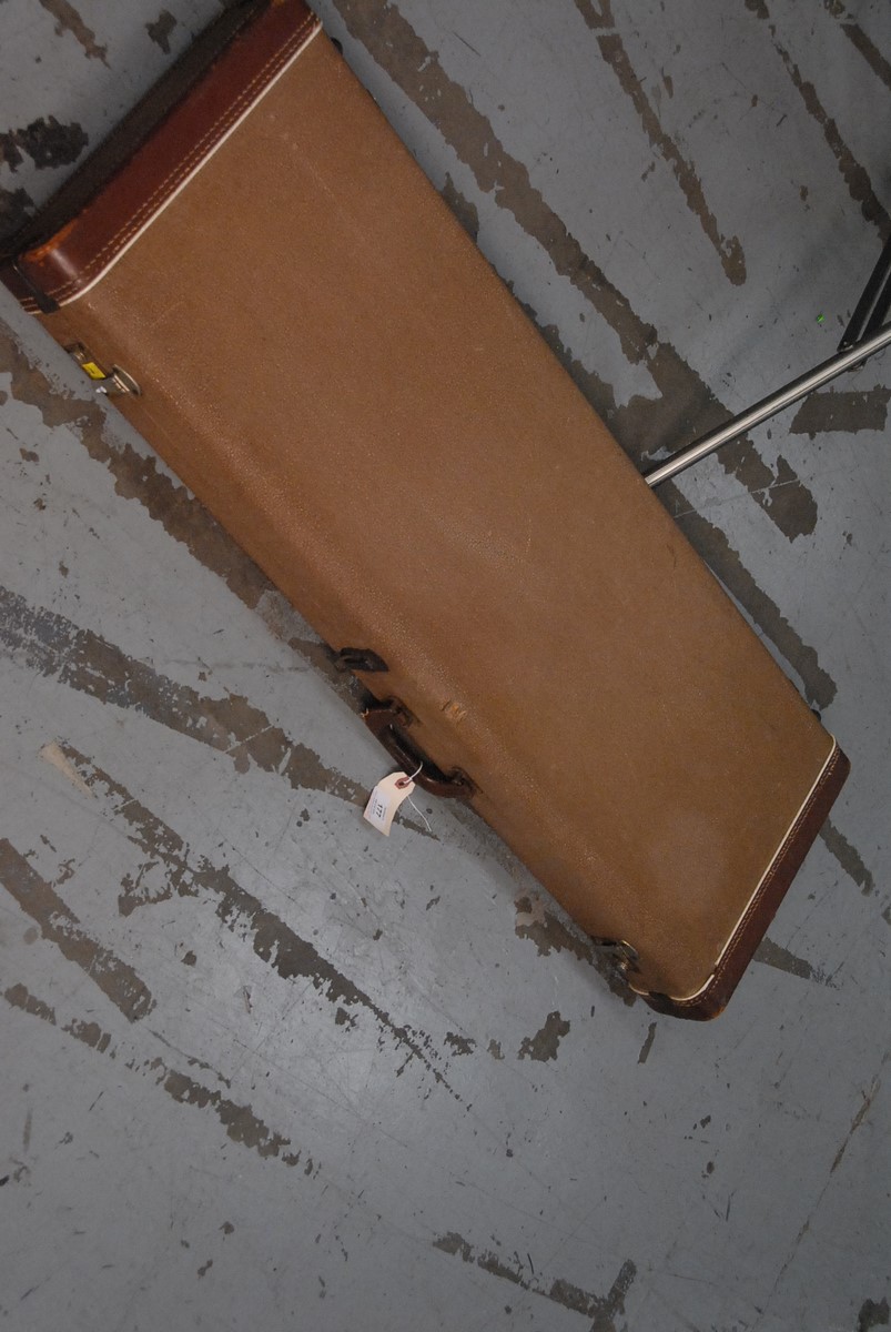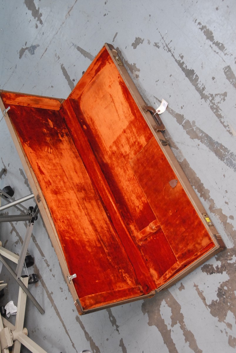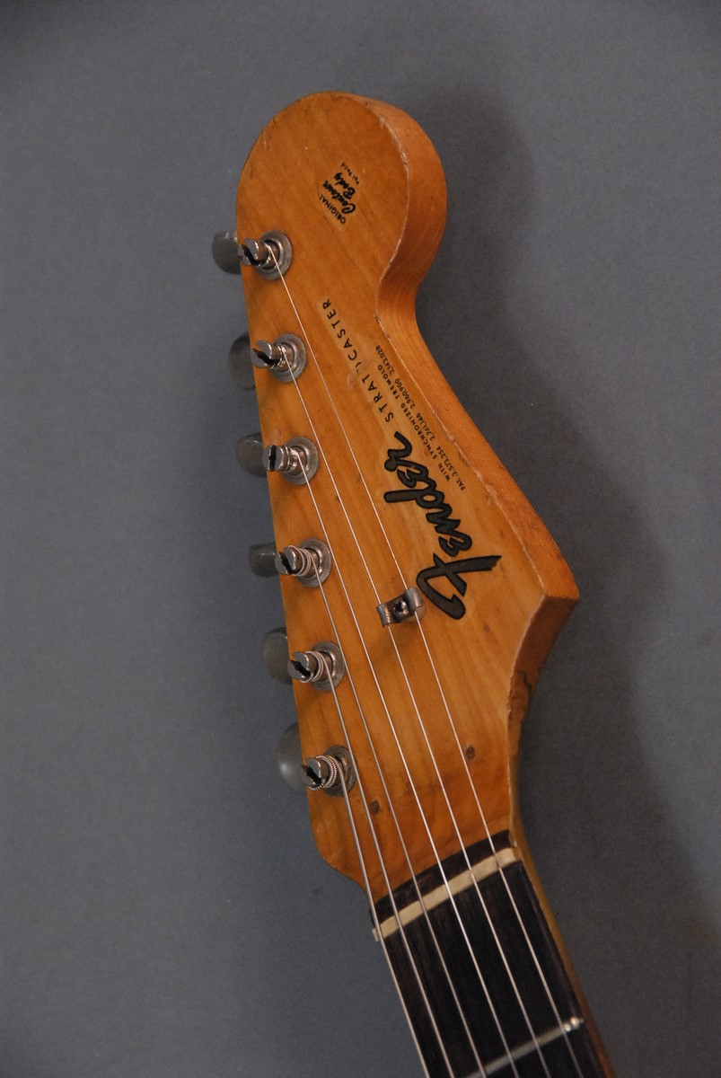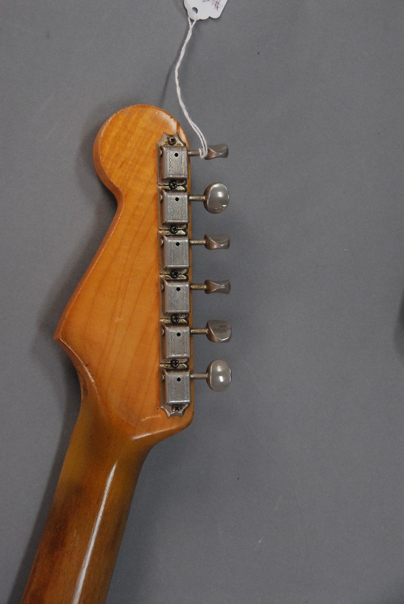 Lot 177: 1965 Fender Stratocaster, Headstock bearing decal Fender Stratocaster with Synchronized Tremolo original contour body body plate sn-101111, in fender tweed case. total lg. 38 in.