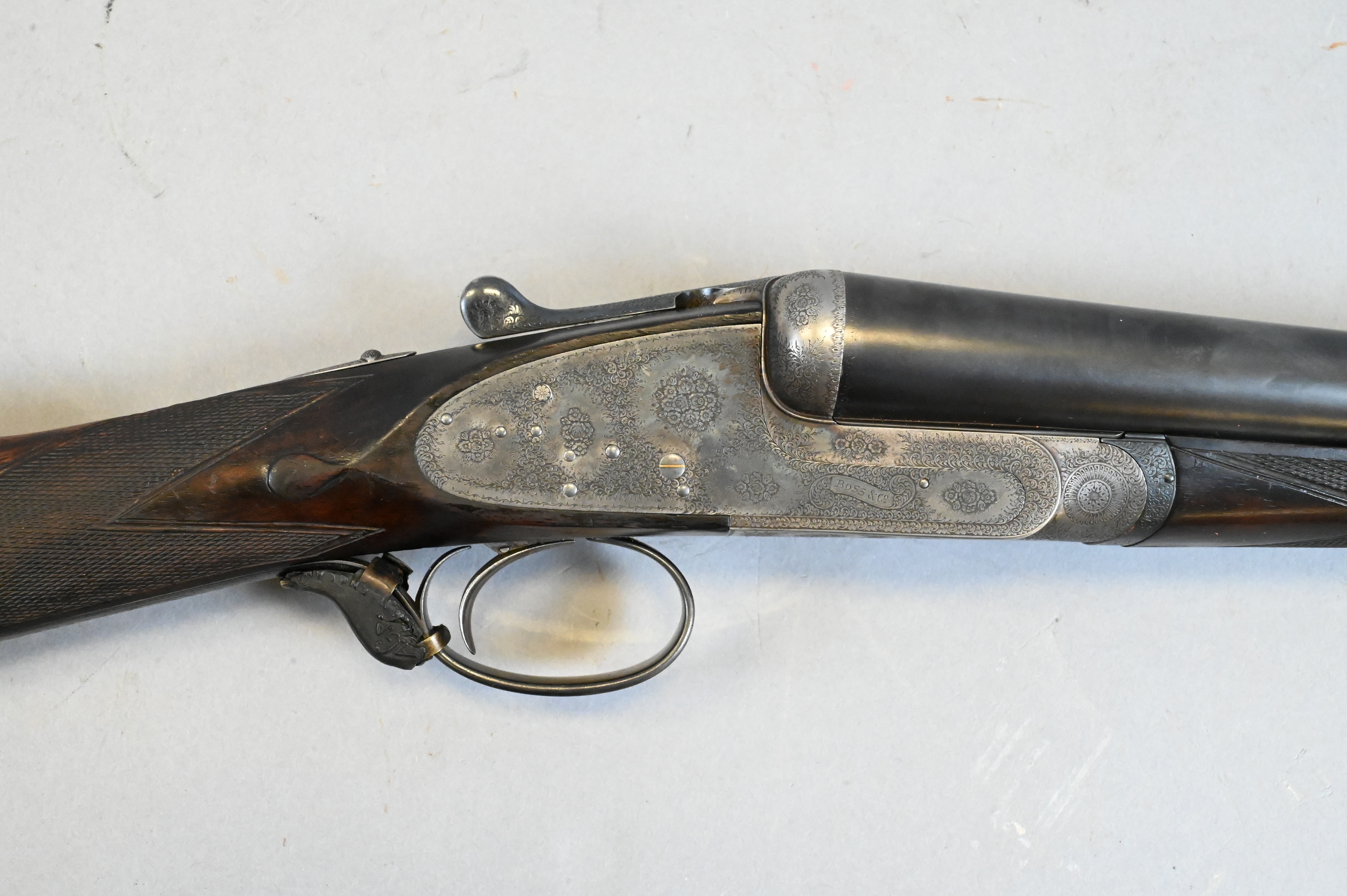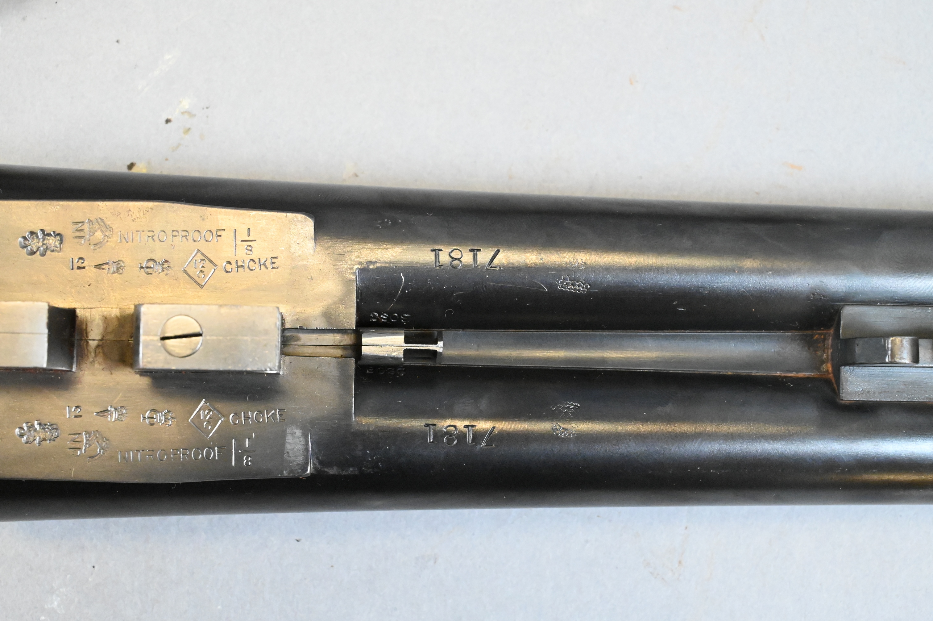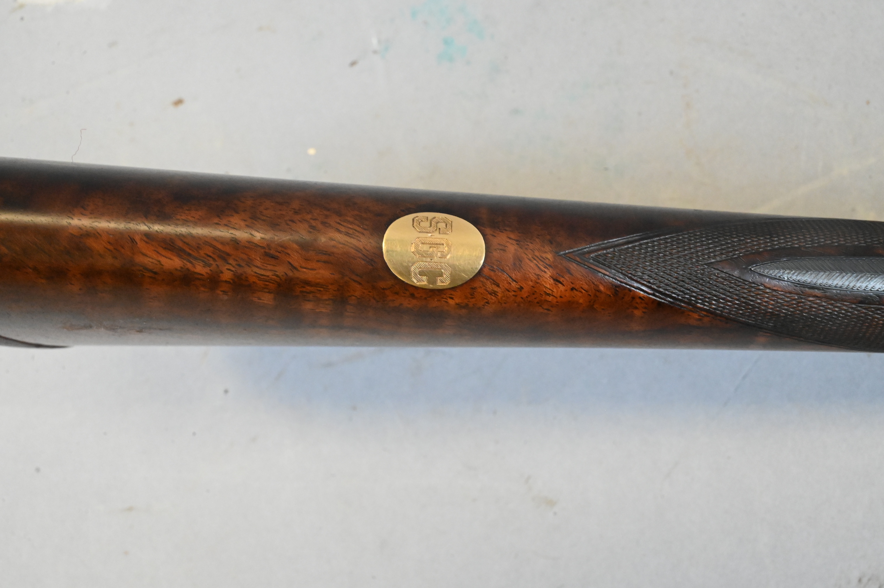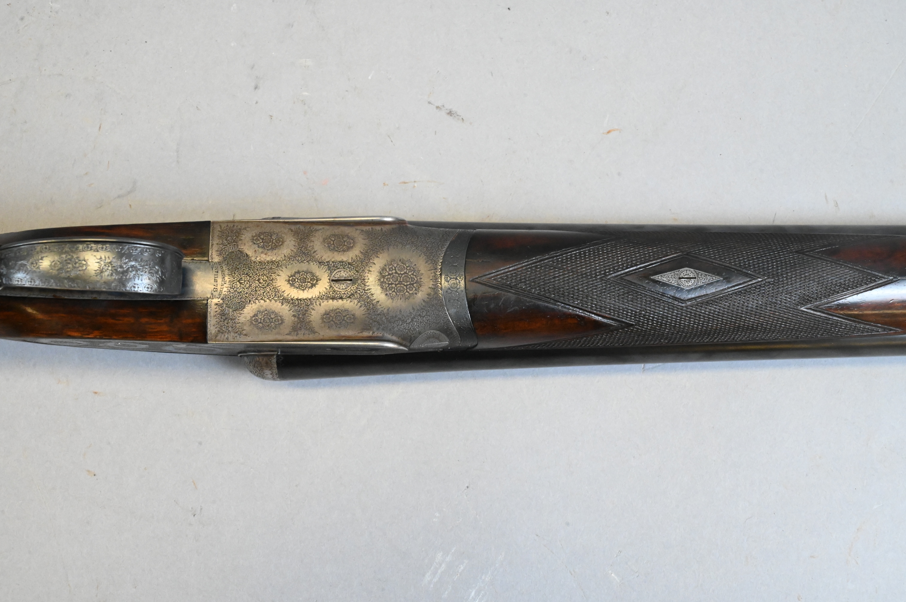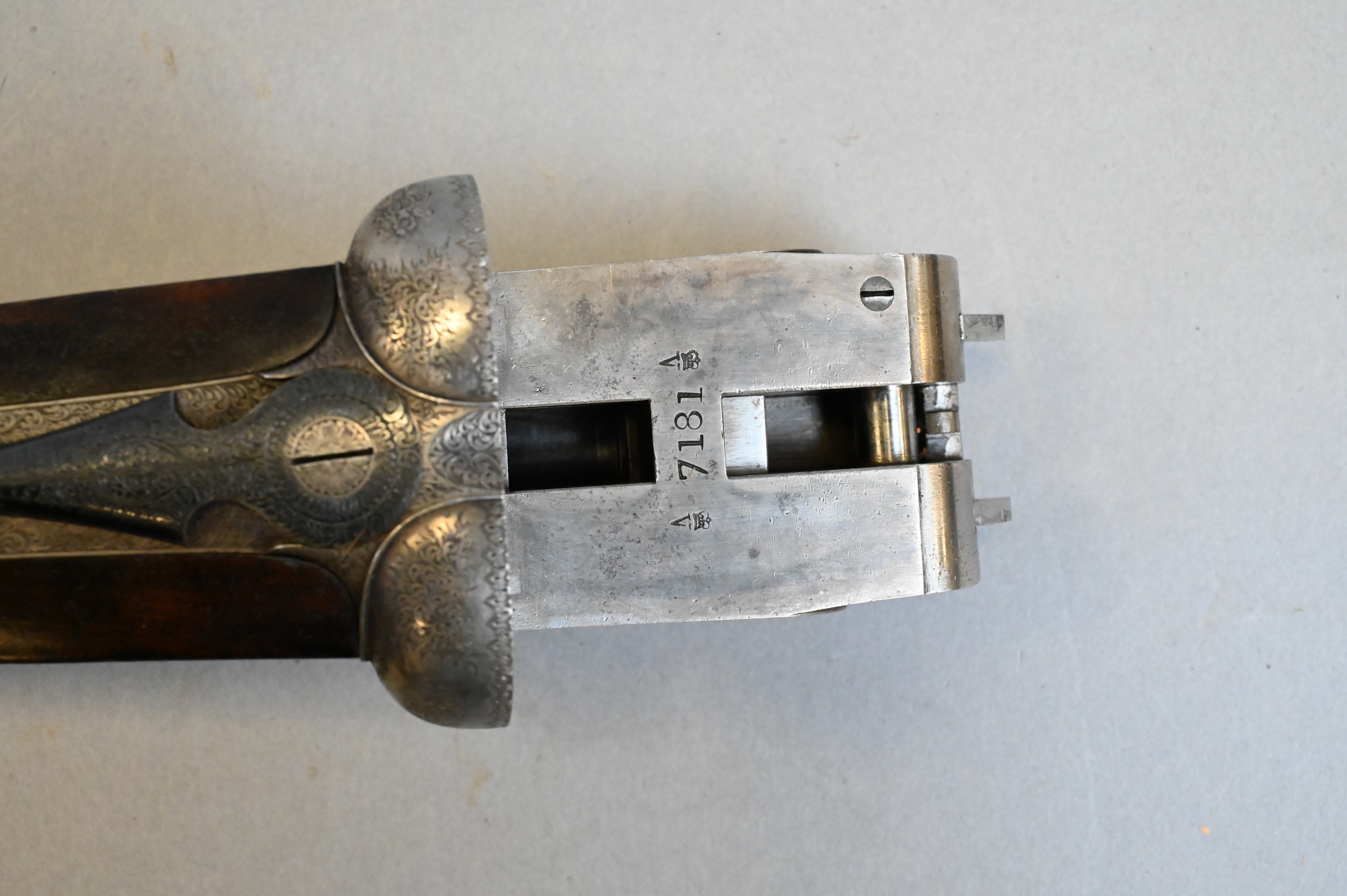 having checkered English stock and foregrip with gold cartouche on underside, blued with highly engraved with floral and scroll work, 1/8 inch choke, serial number 7181 with fitted leather hard case