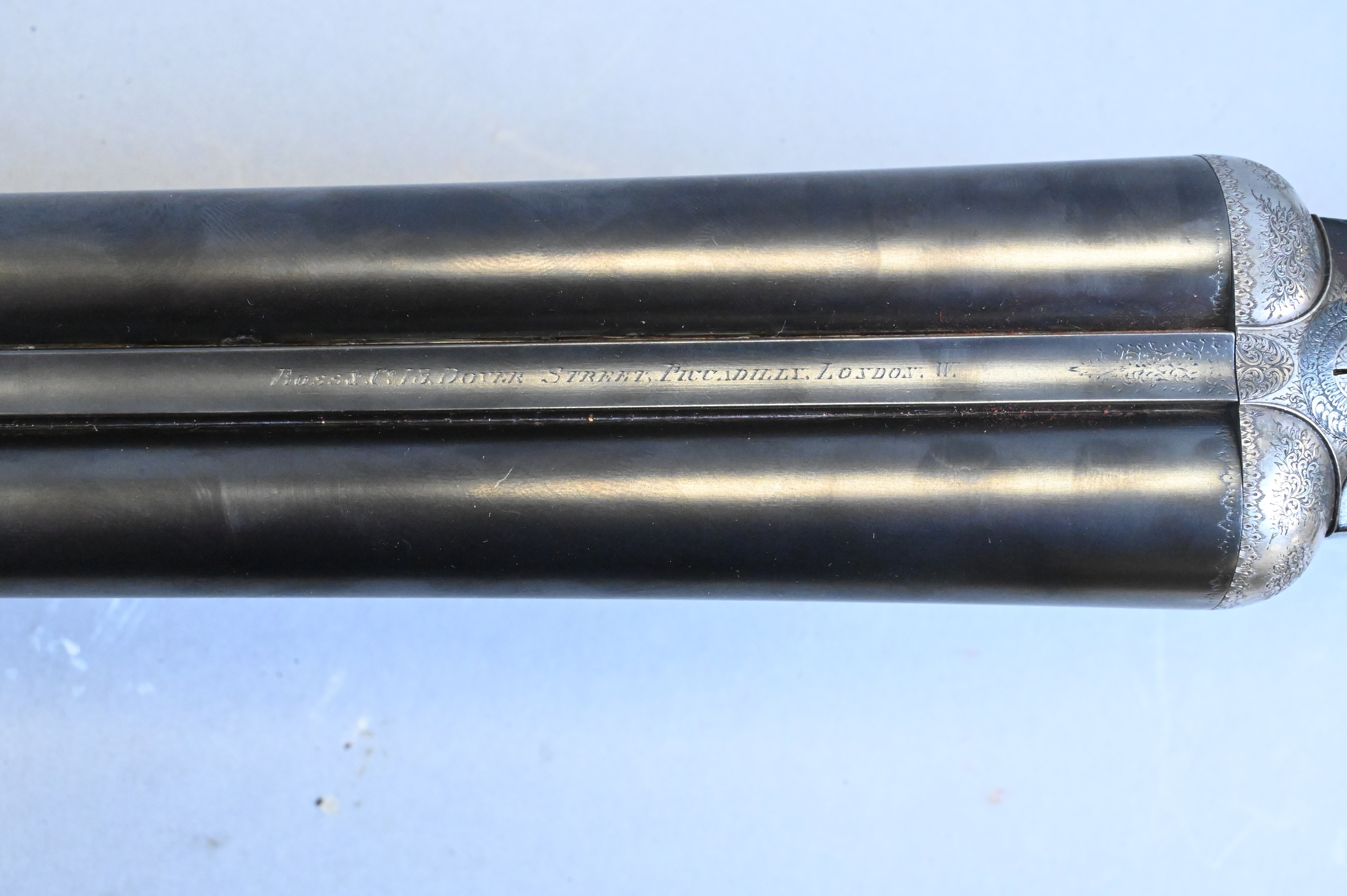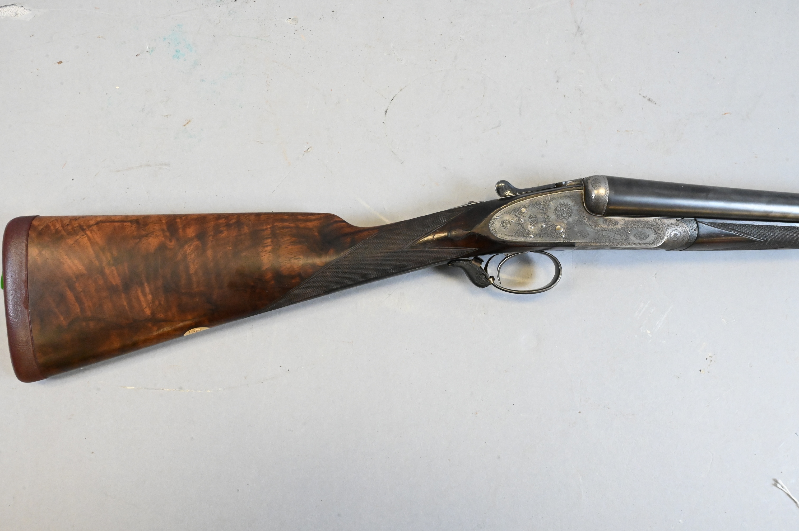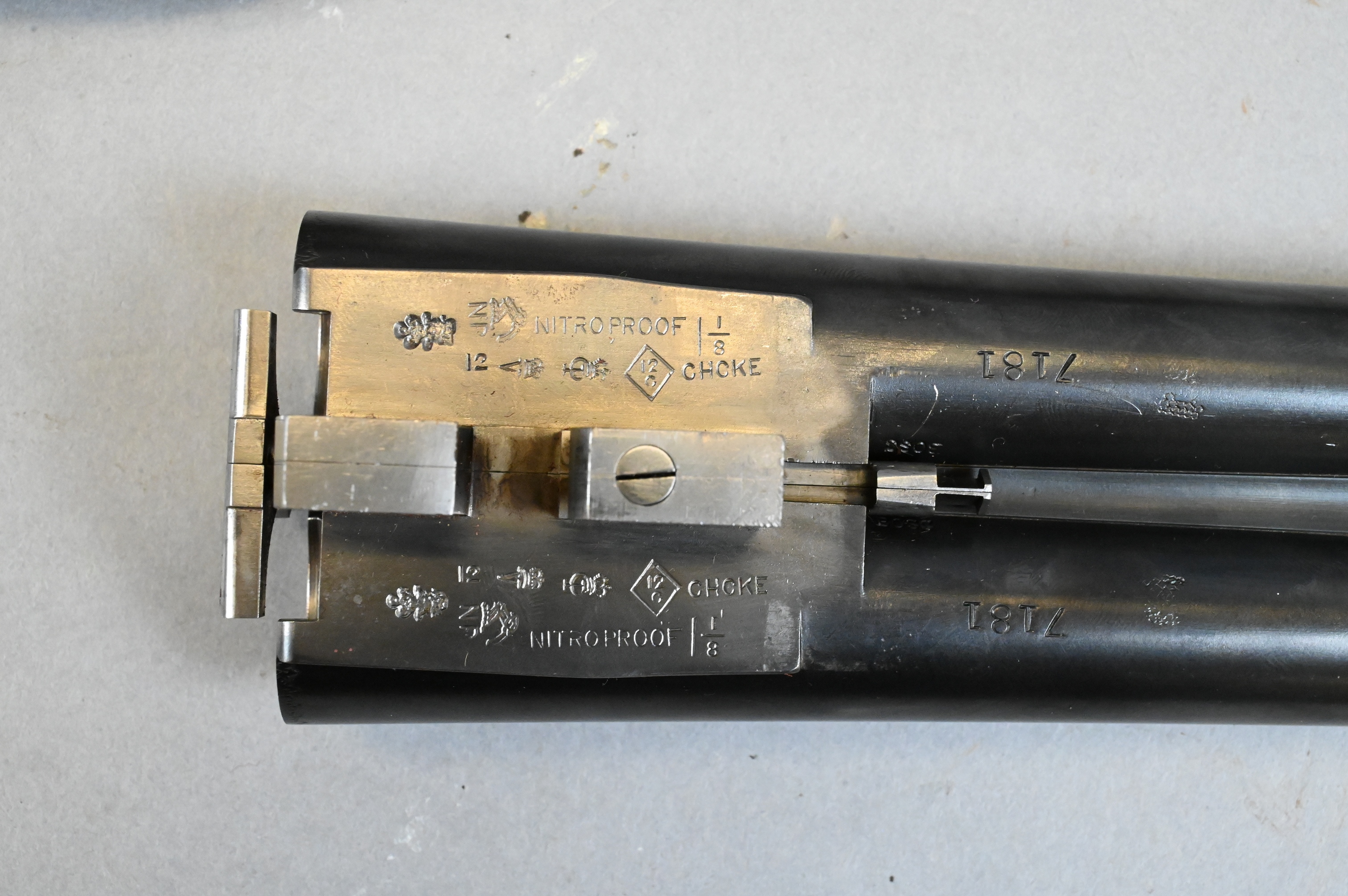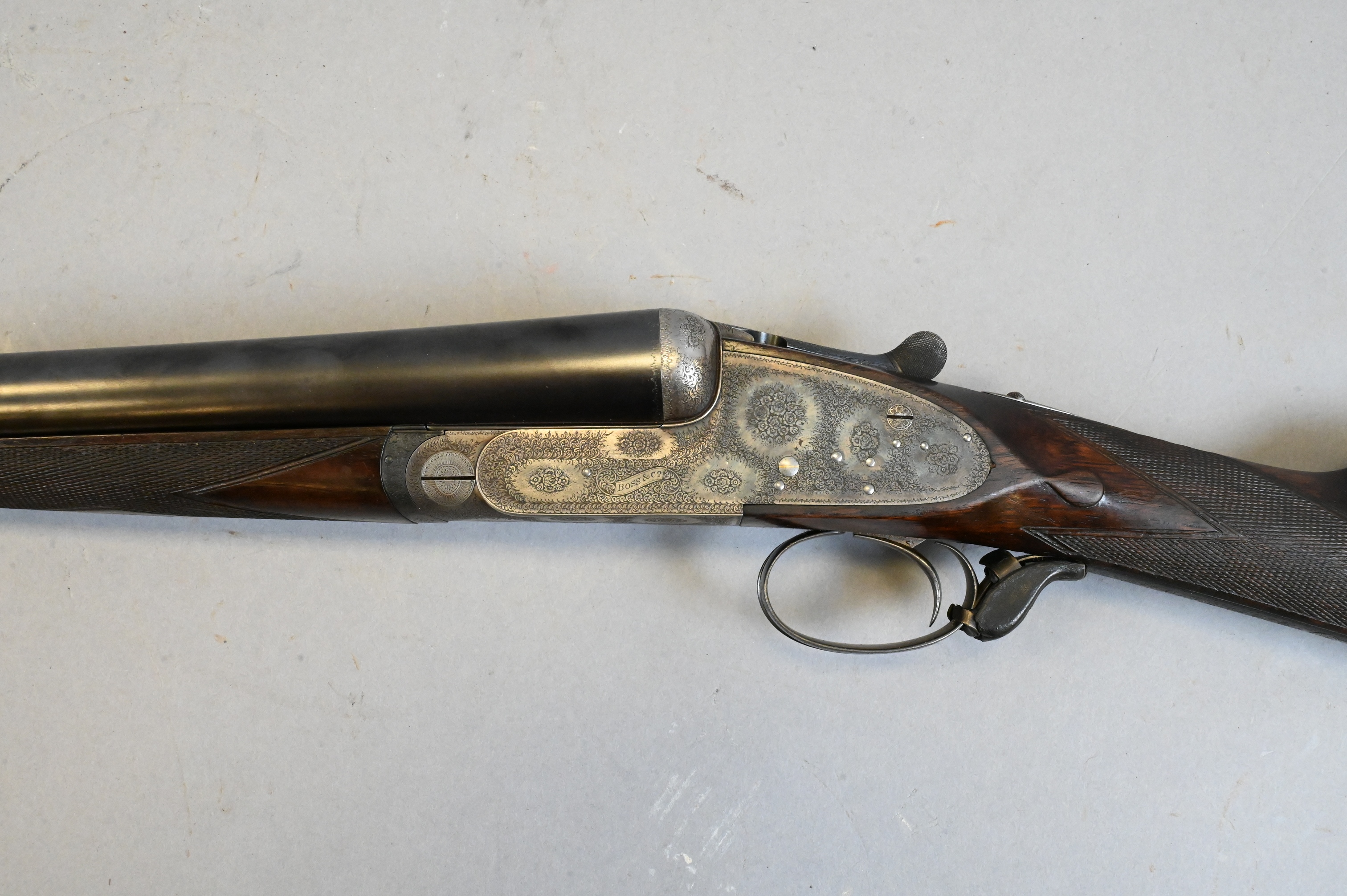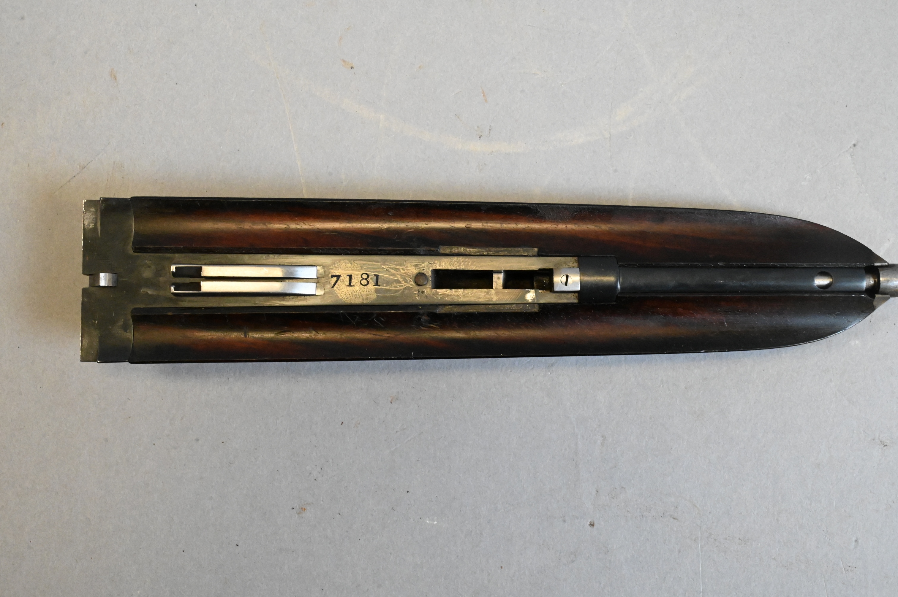 having checkered English stock and foregrip with gold cartouche on underside, blued with highly engraved with floral and scroll work, 1/8 inch choke, serial number 7181 with fitted leather hard case