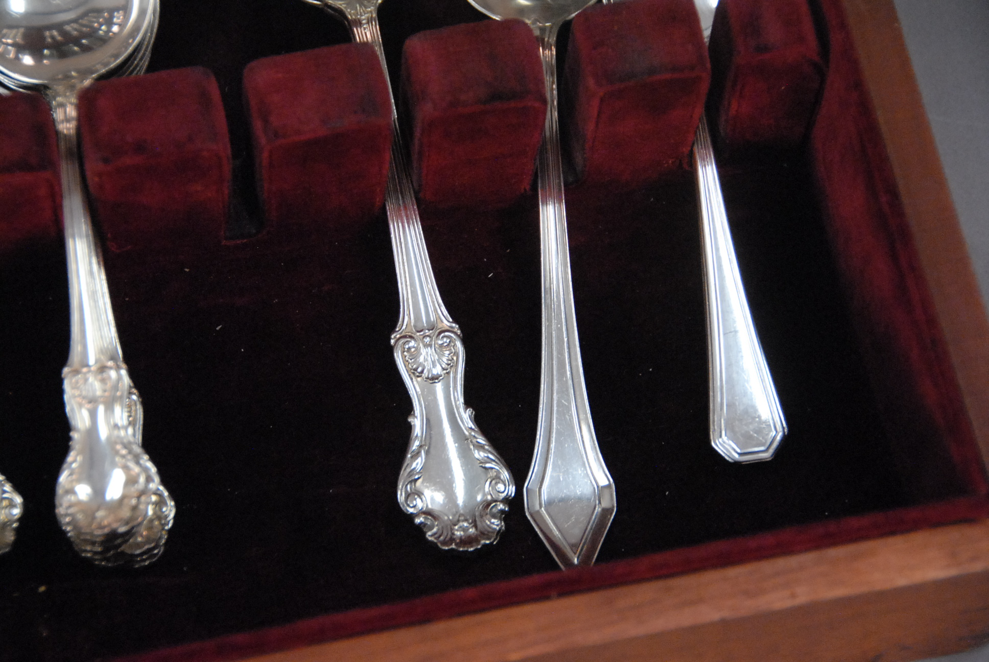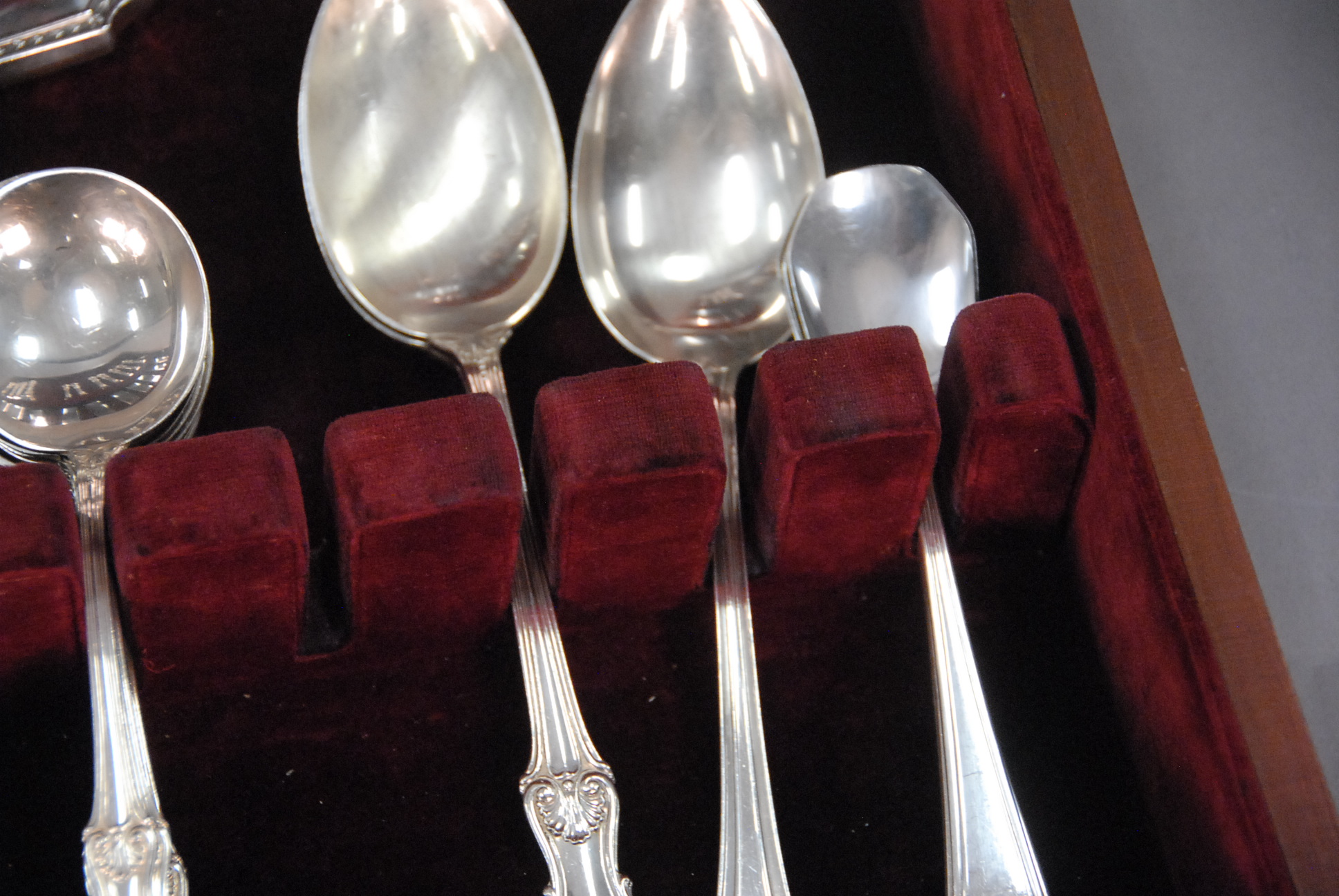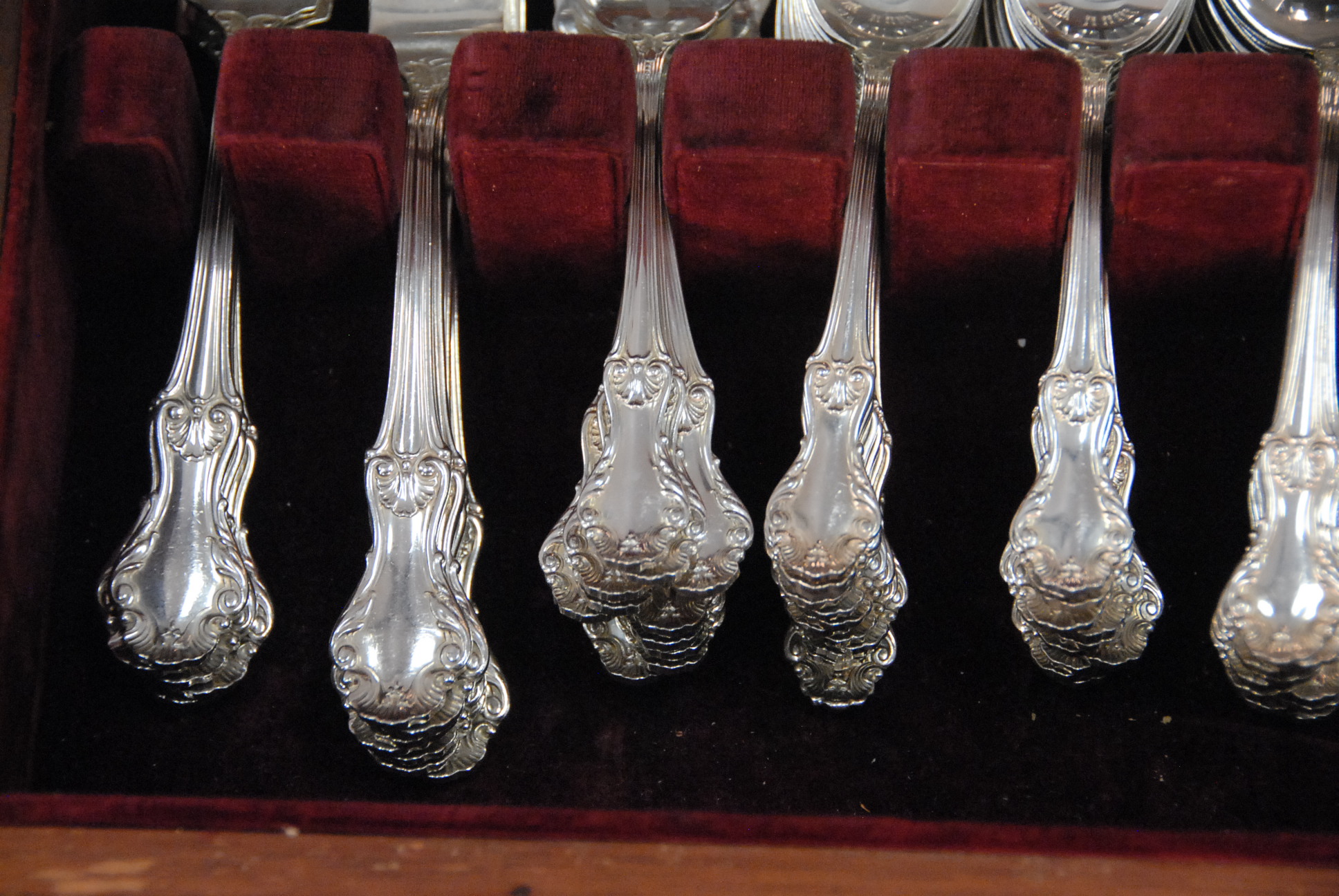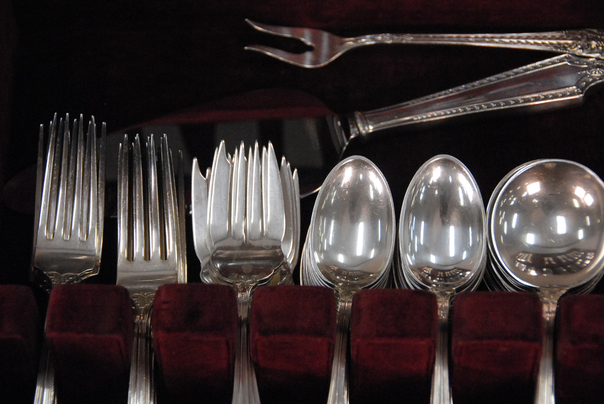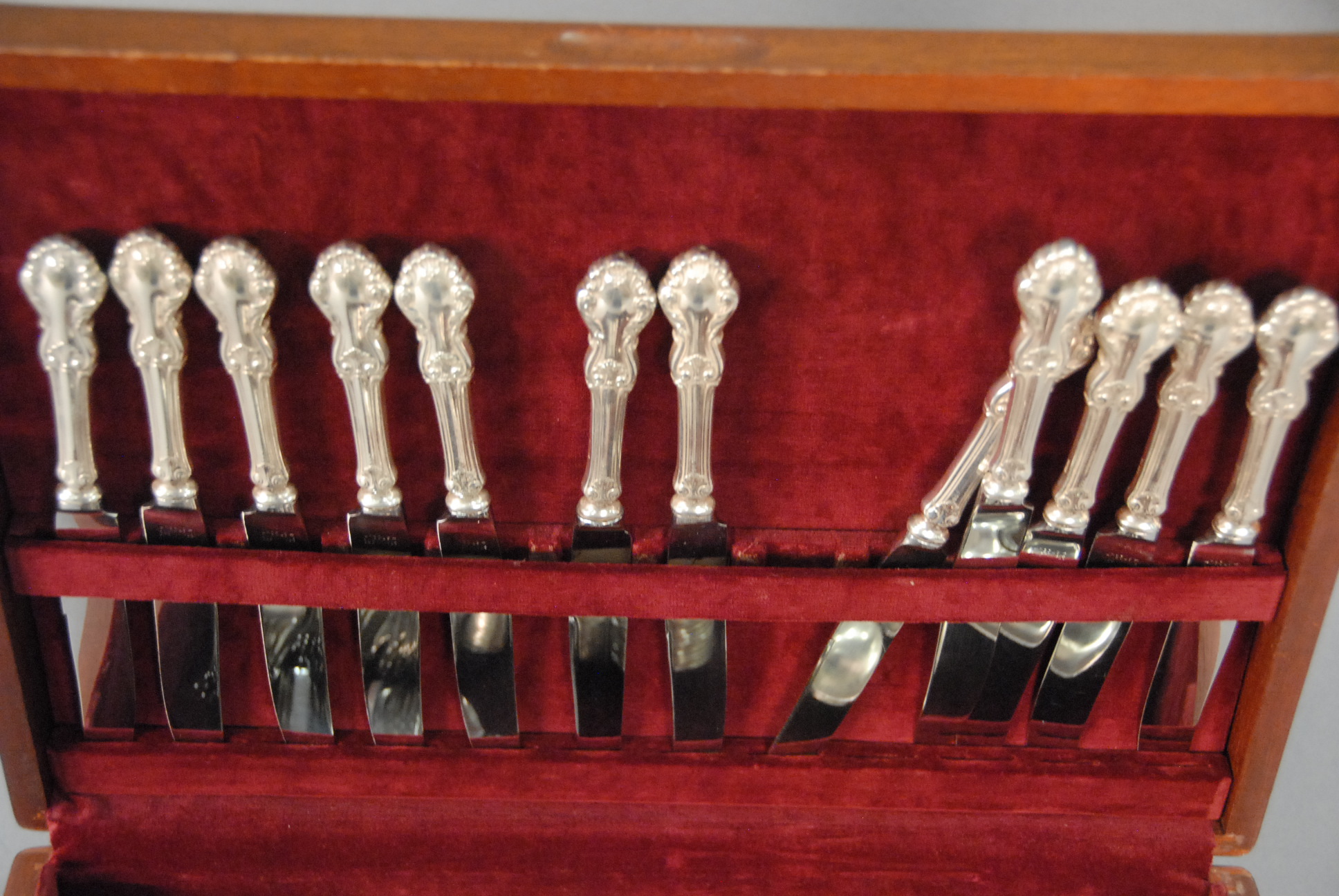 Concord sterling flatware set to include 12 dinner forks, 11 salad forks, 24 teaspoons, 12 soup spoons, 12 knives, and 4 serving pieces, 79.8 t oz. plus 13 weighted handles.
