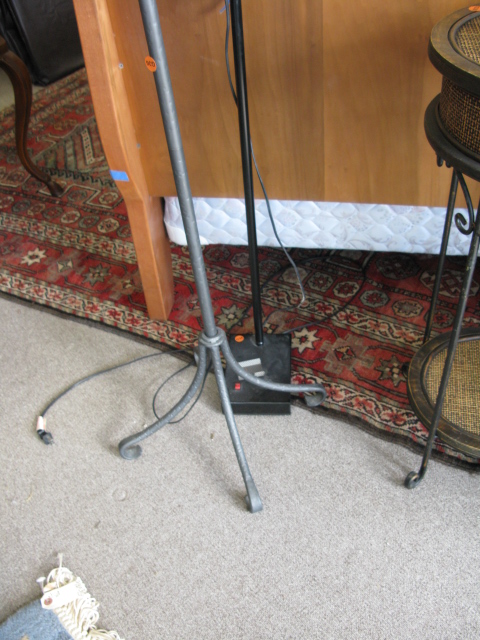 Contemporary grouping to include two floor lamps, a table lamp, a small round table and small Oriental screen and a small rush style cabinet.