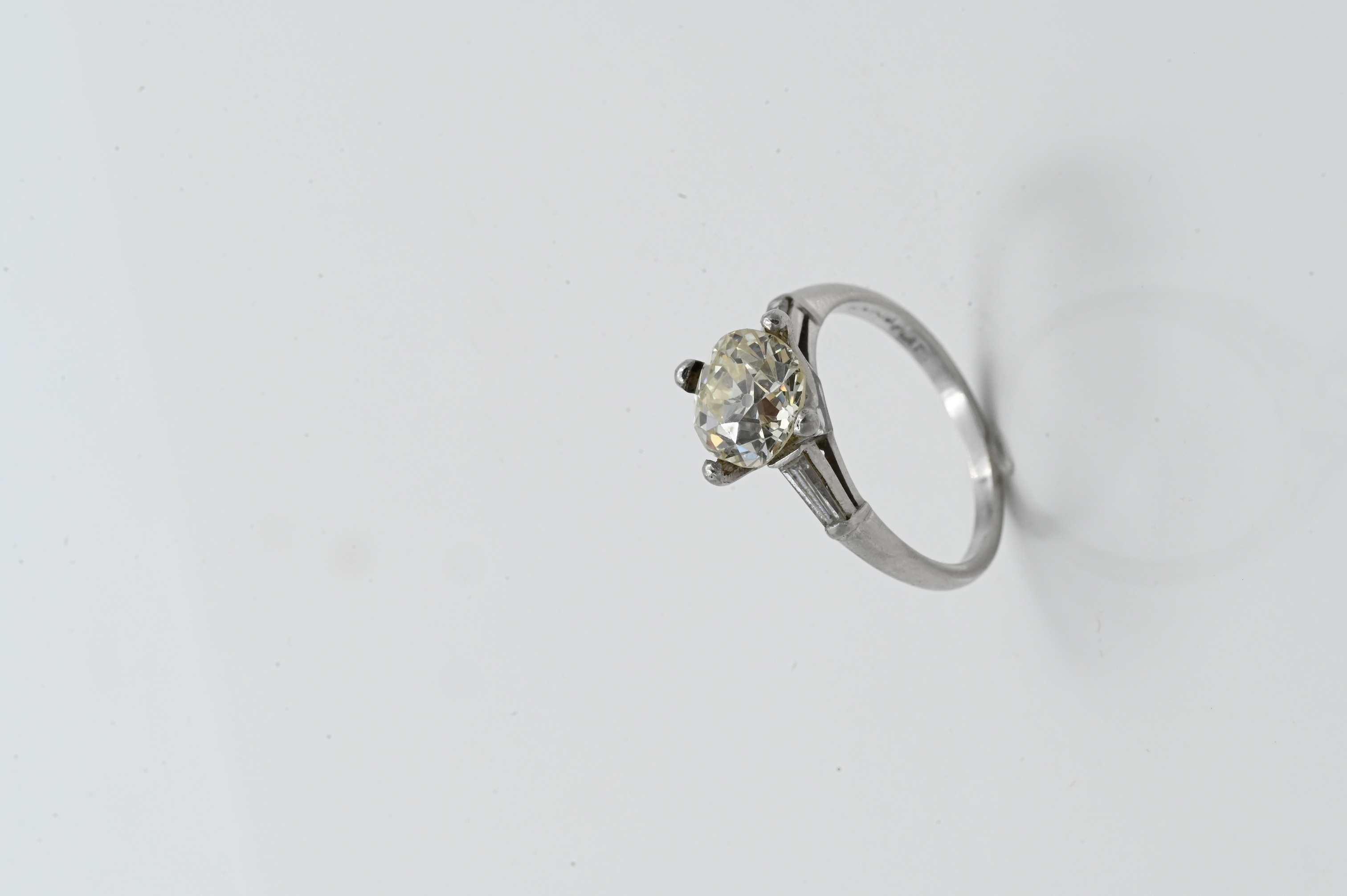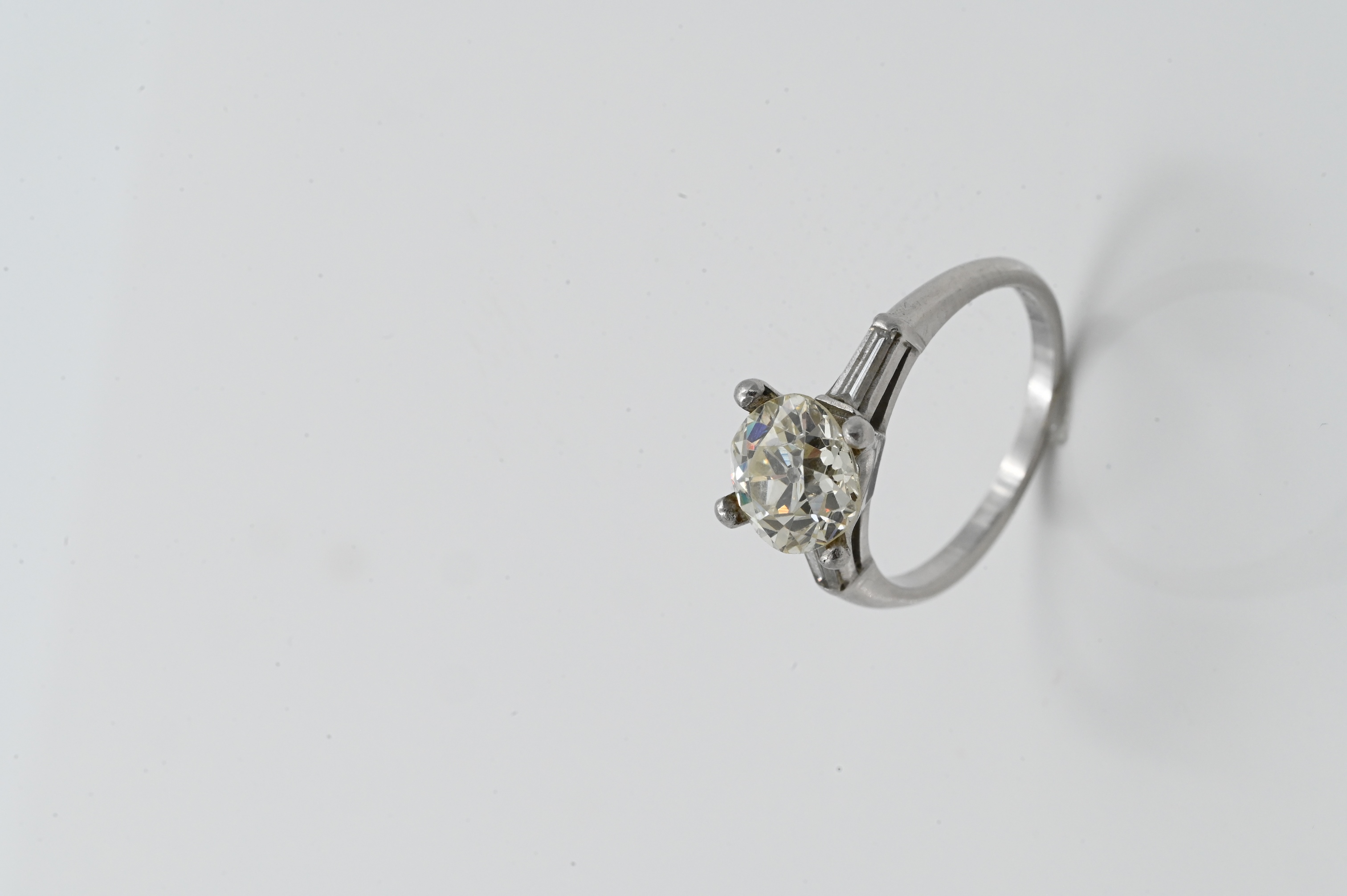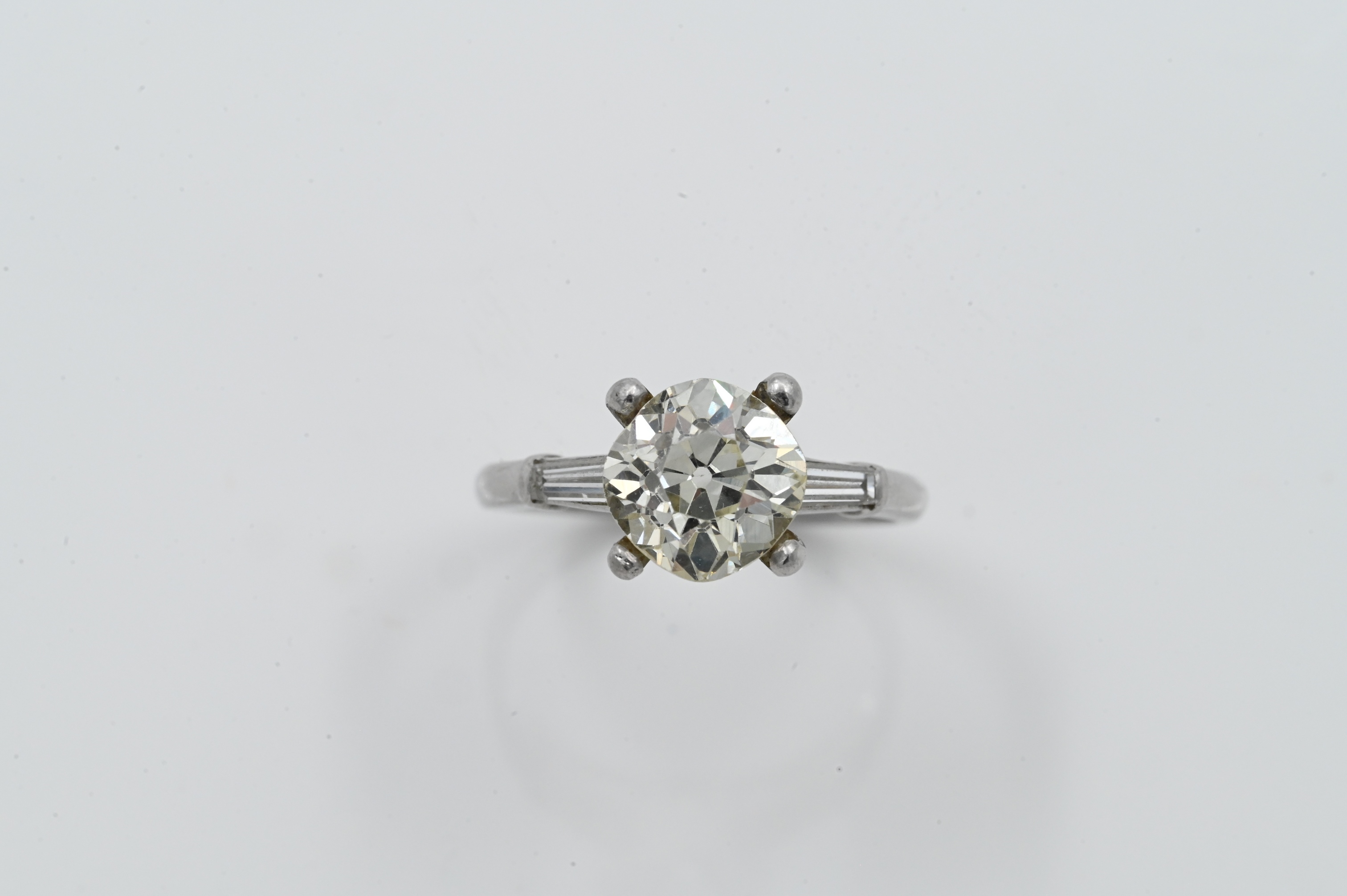 having center round 2.42 carat diamond flanked by tapered baguettes in platinum setting, VS2 QR color, GIA report number 2235459441
