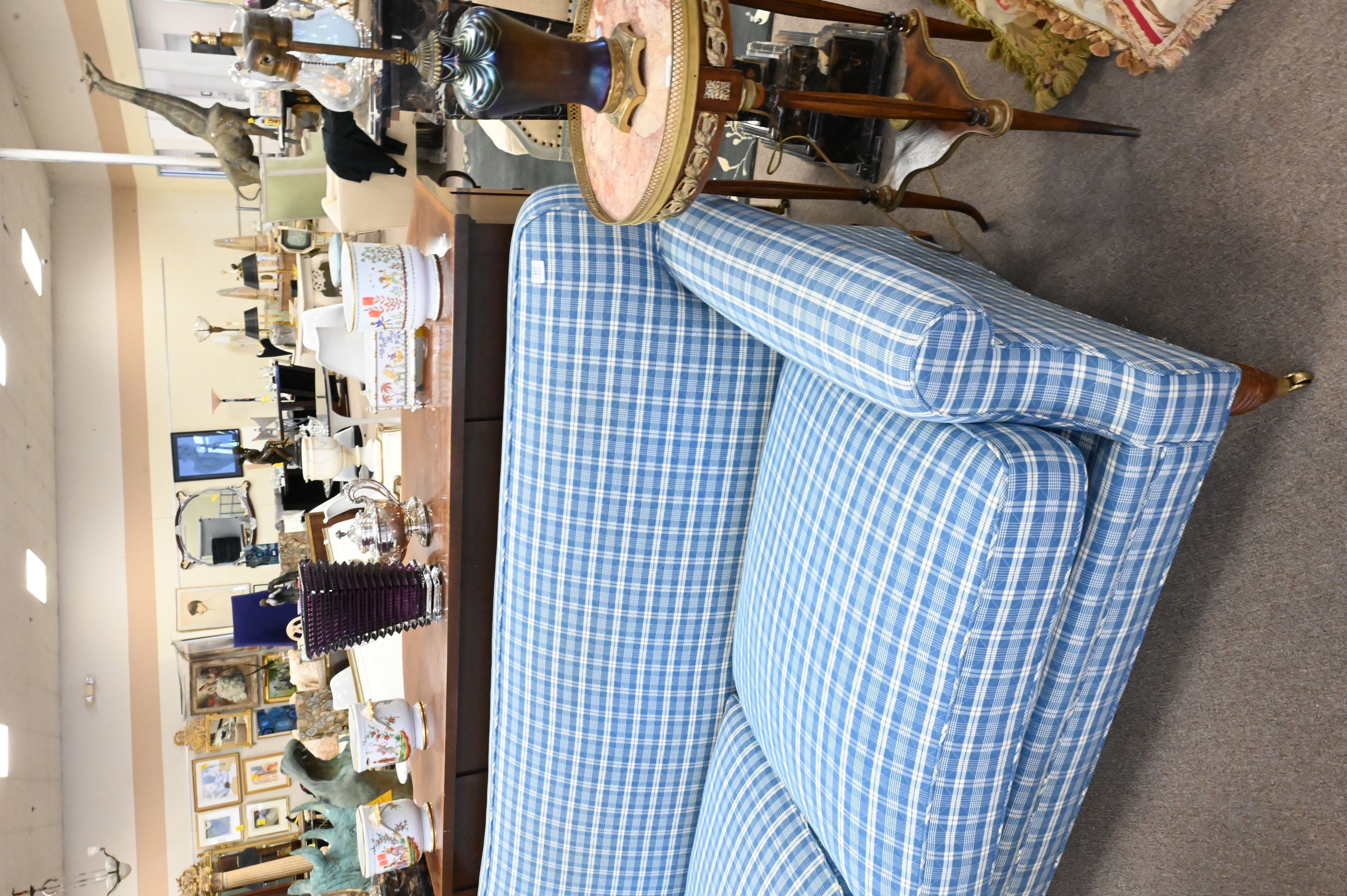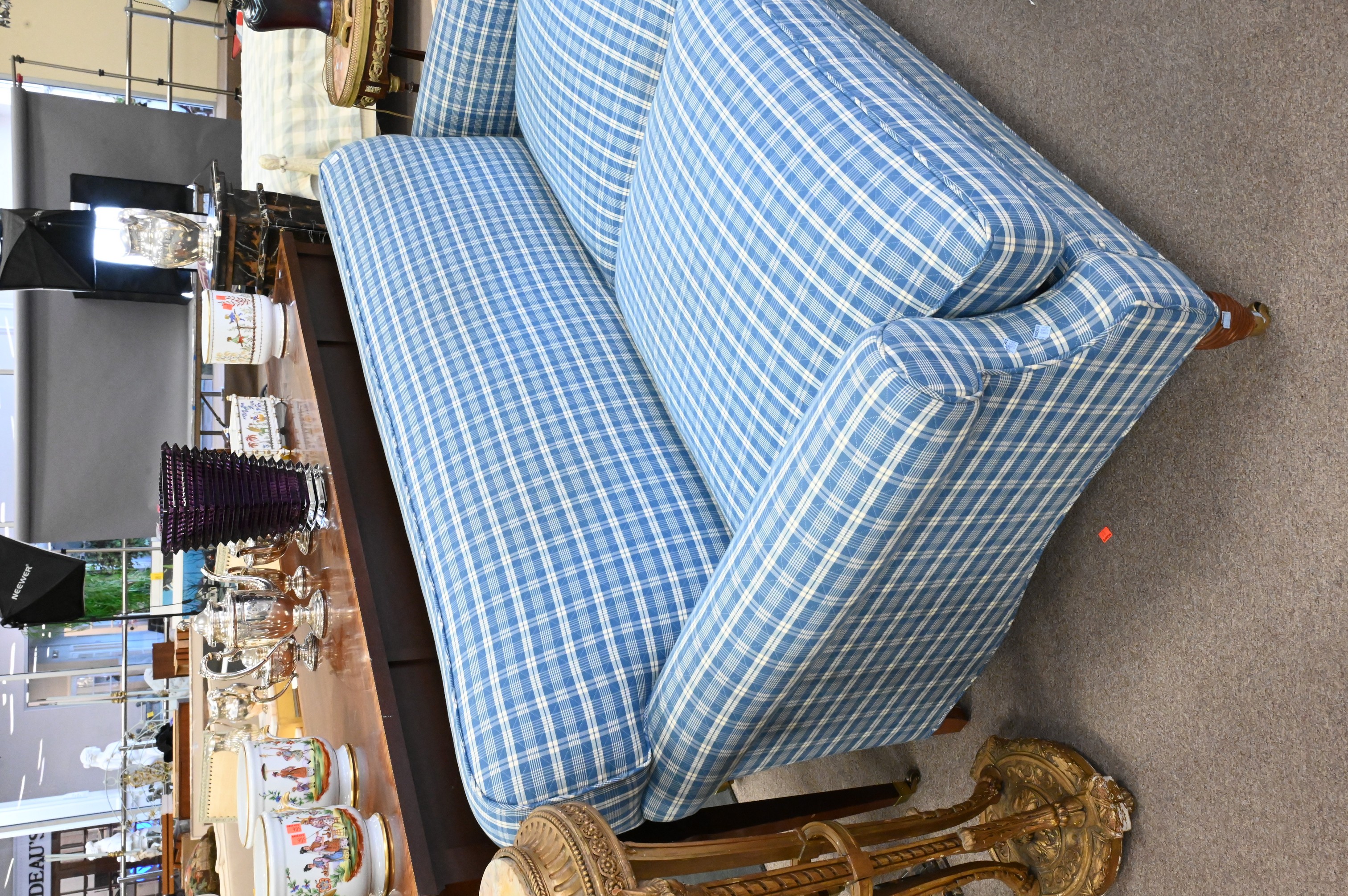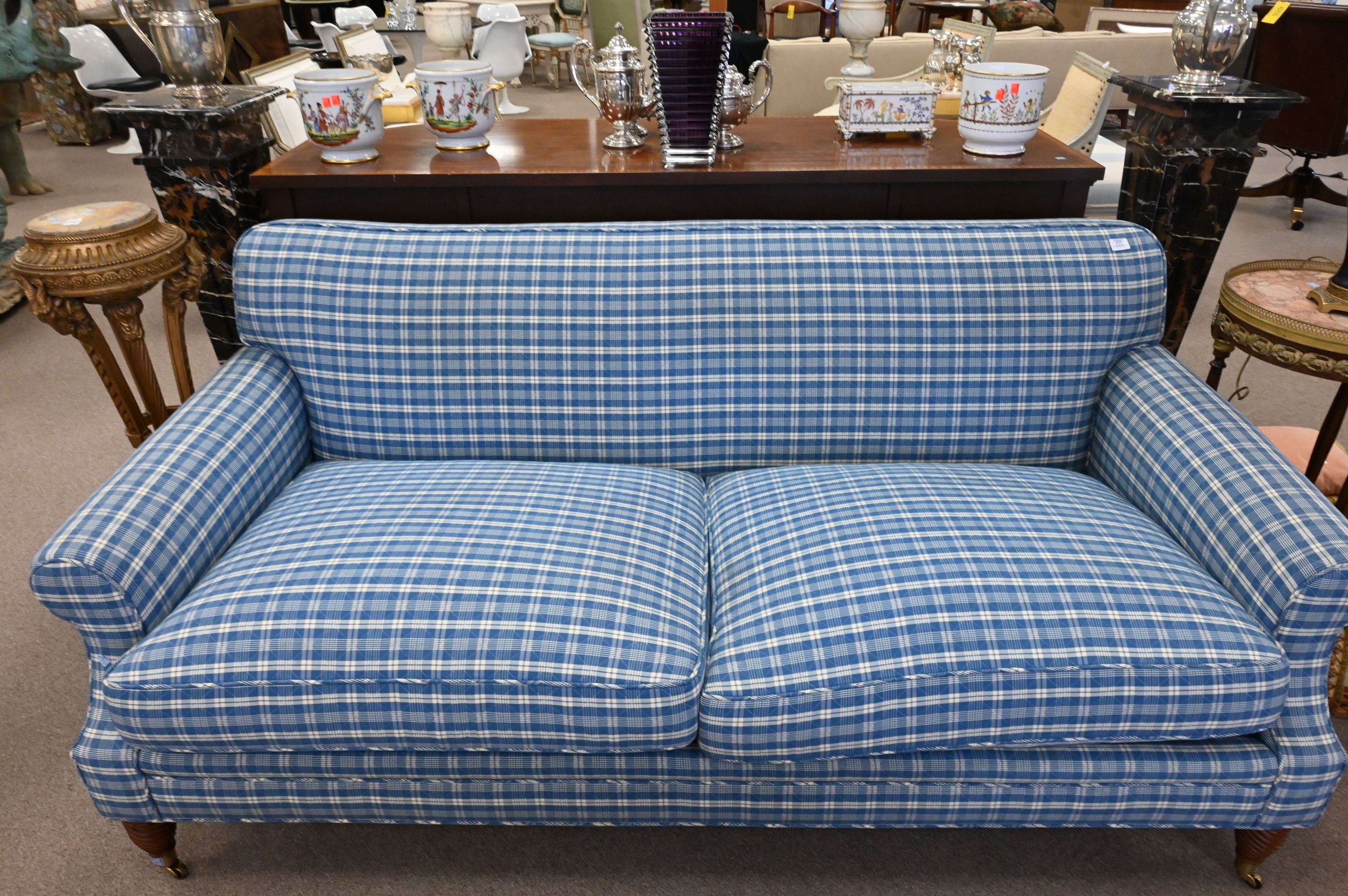Ferrell Mittman, New York, in Pierre Frey Plaid, over carved wood legs set on brass casters, along with five pillows