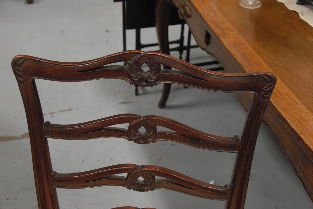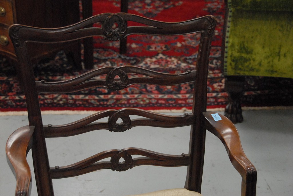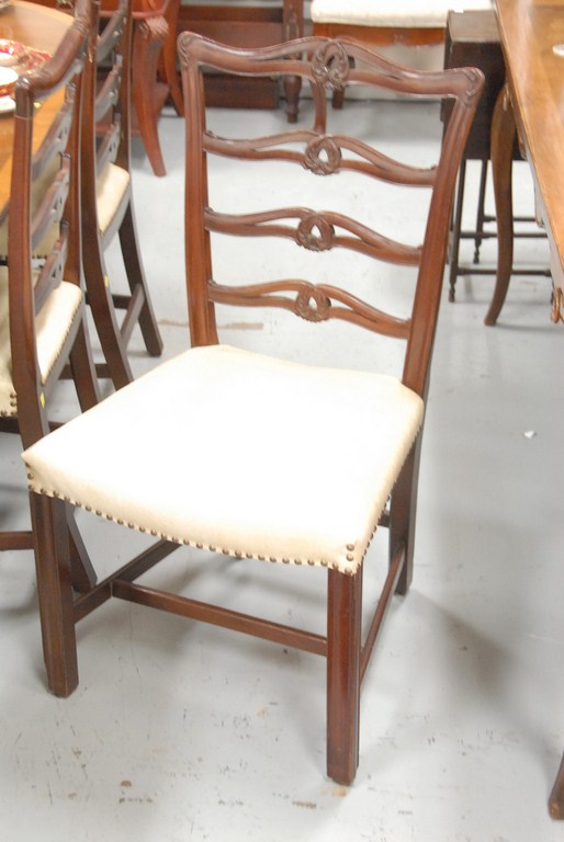 Eight custom mahogany Chippendale ribbon back dining chairs with fully upholstered seats.