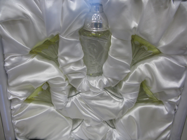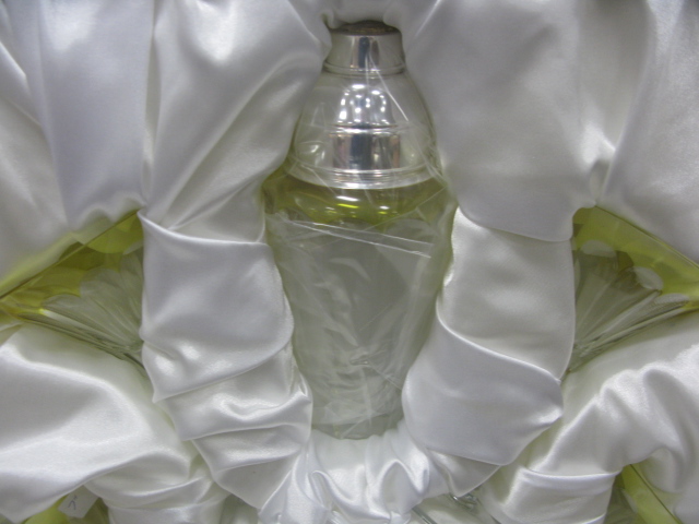 Faberge lot to include a decanter, cocktail shaker and four stems yellow cut to clear in a Faberge fitted box