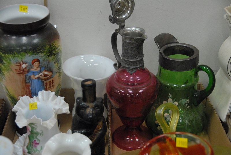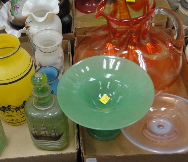 Four box lots to include bristol glass vases, bear glass bottle, an enameled ship glass bottle, jade color compote, etc.
