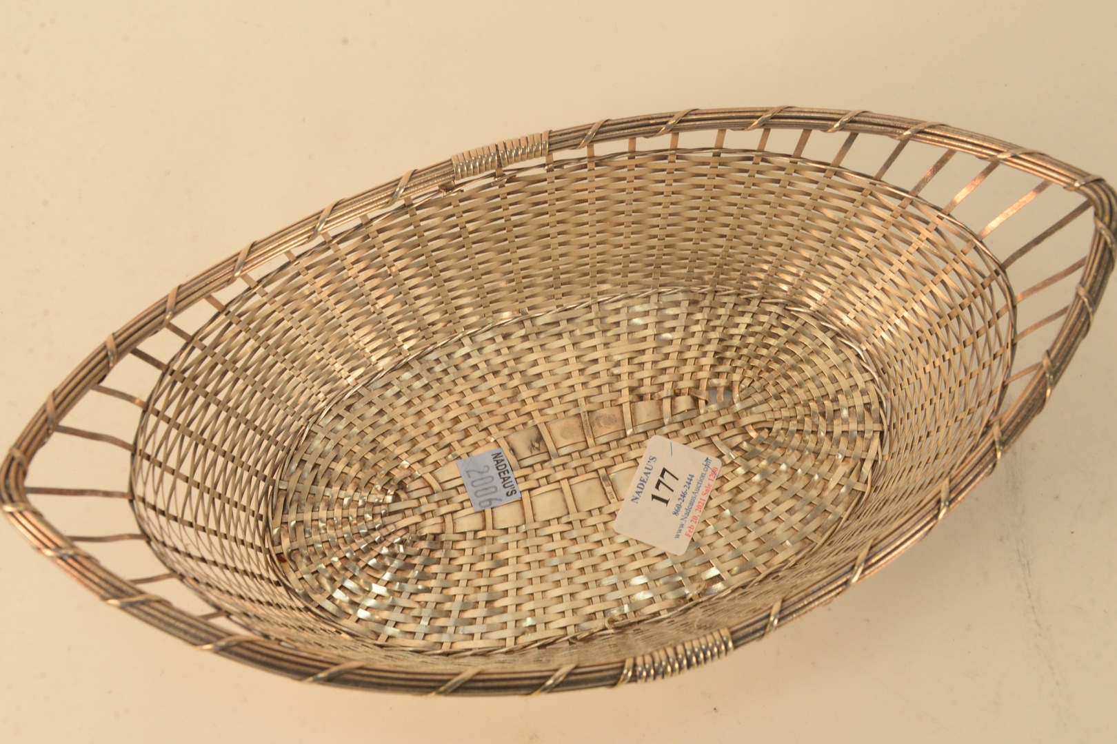 Lot 177: French Silver Woven Basket, length 13 1/4 inches,14.1 t.oz. Provenance: The Estate of Gloria Schiff, 630 Park Avenue, New York.