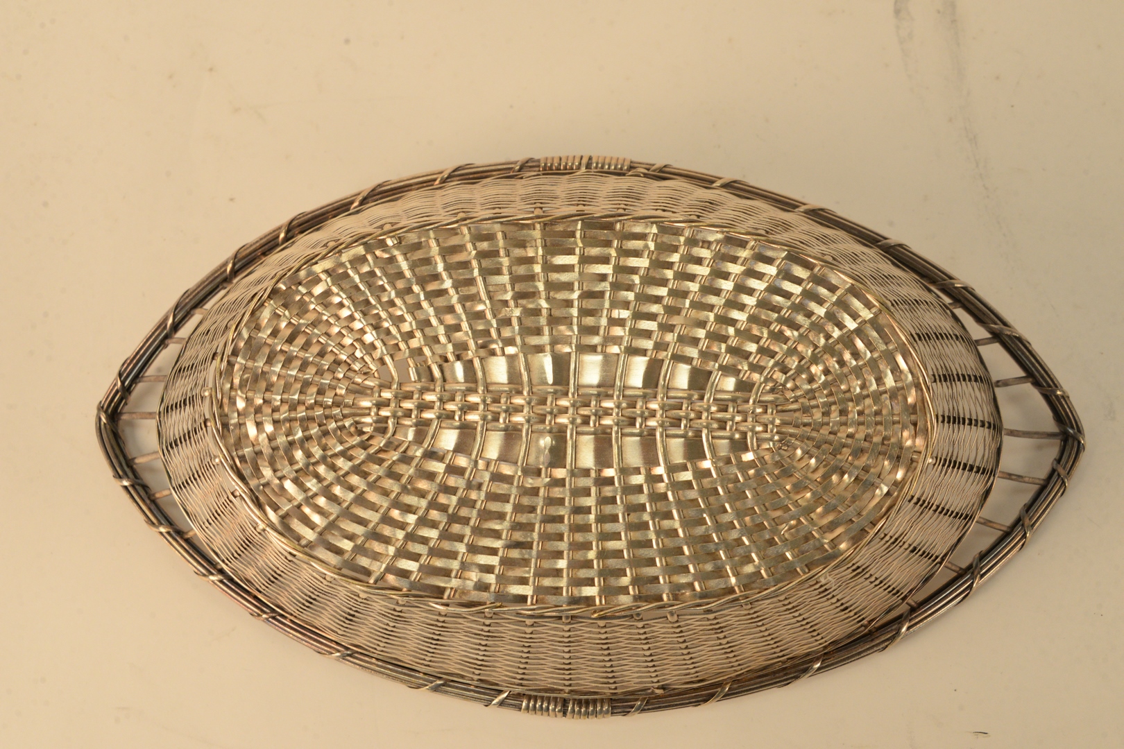 French Silver Woven Basket, length 13 1/4 inches,14.1 t.oz. Provenance: The Estate of Gloria Schiff, 630 Park Avenue, New York.