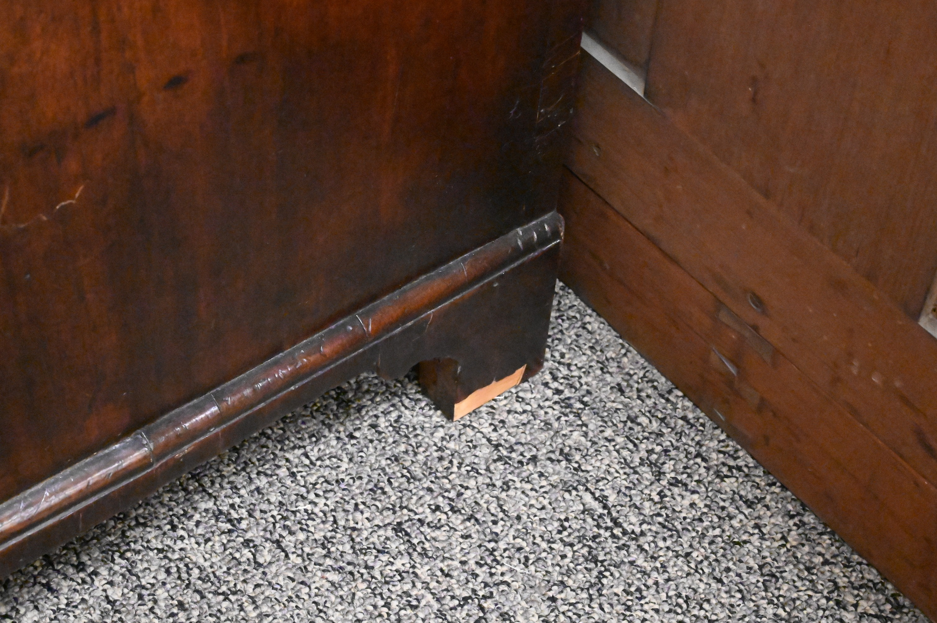 Presents well, age cracks to the top and sides, light scratching to surface, veneer loss to back right foot and under front drawer, interior with wear consistent with age