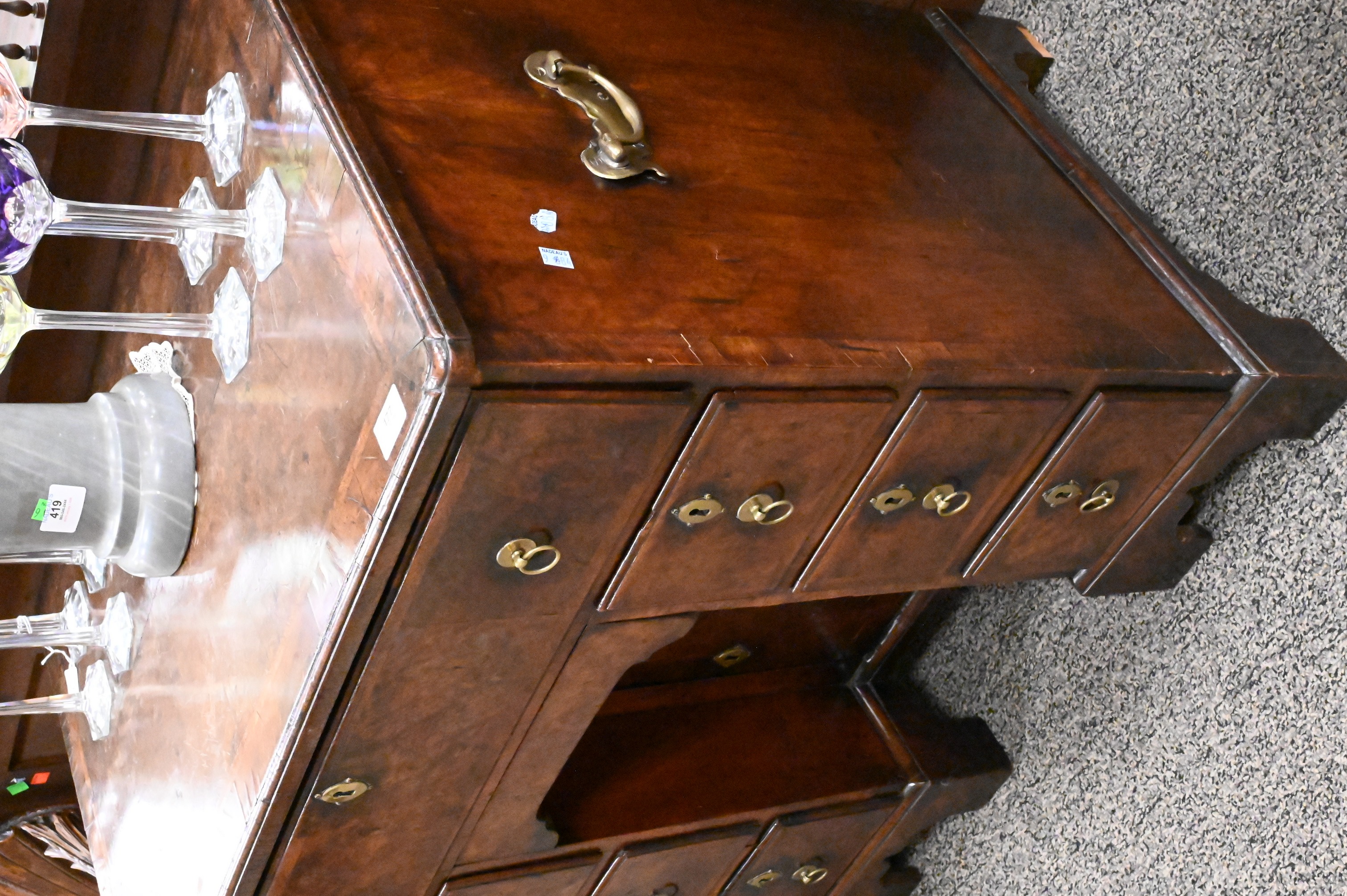 having rectangular top with feather-banded inlay above a long drawer opening to a fitted writing surface and compartments, over a drawer and arched kneehole recess fitted with a cupboard door flanked by three drawers to each side, large brass side handles, raised on bracket feet, early 18th century