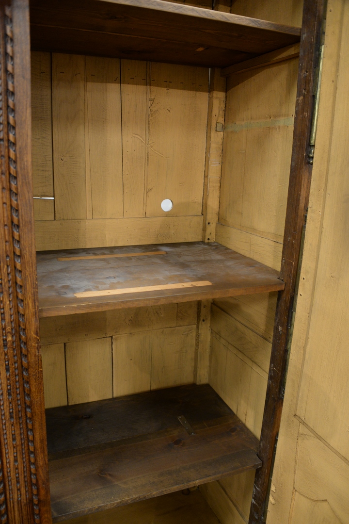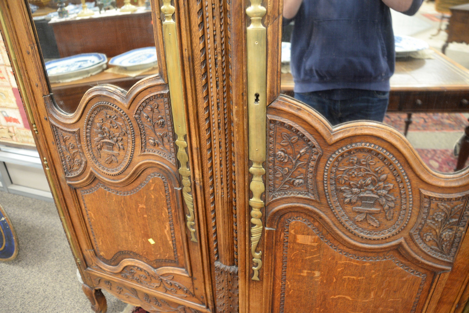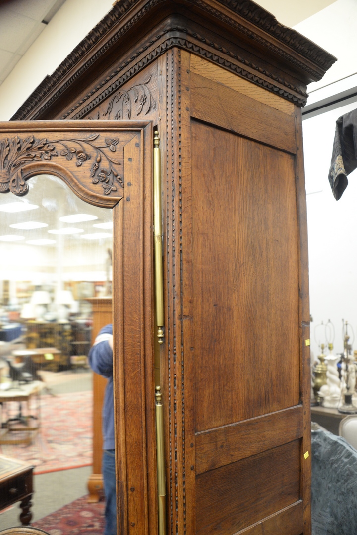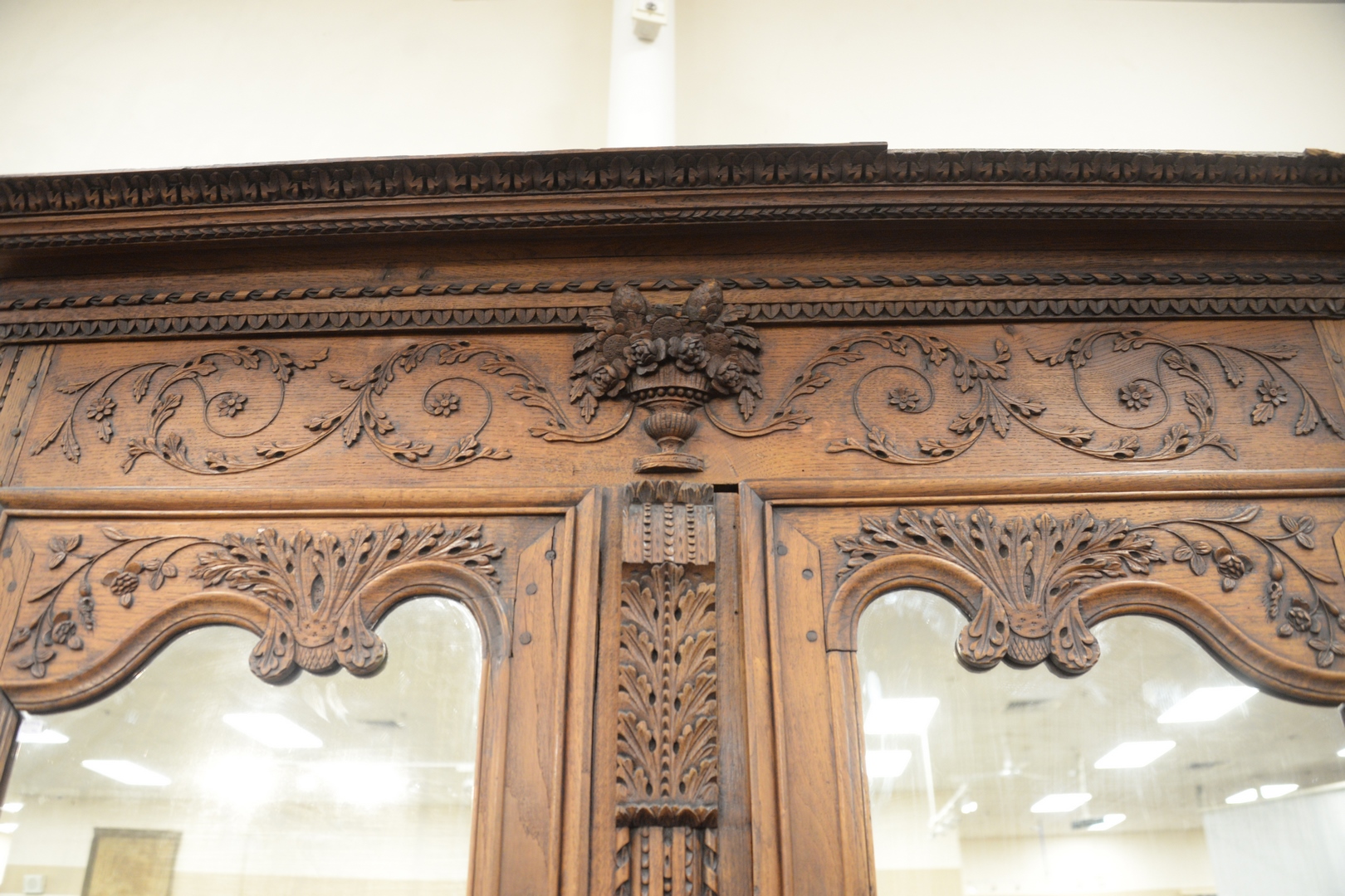 Lot 177: Louis XV Oak Armoire, top with 3D carved basket of flowers under molding and two carved panels and glass doors, 18th century, height 95 inches with removable molding, width 55 1/2 inches.