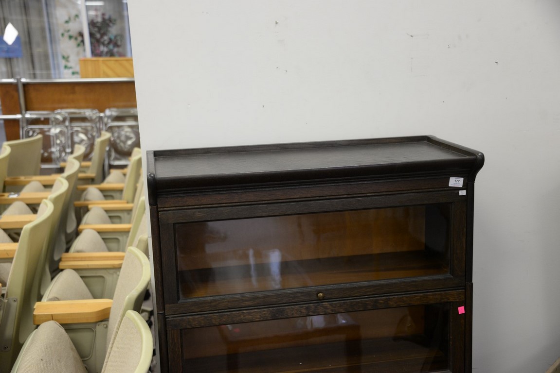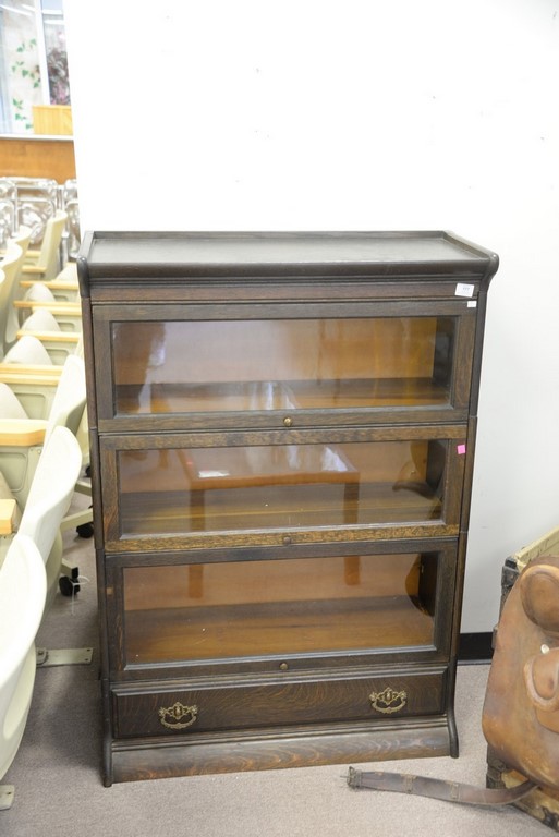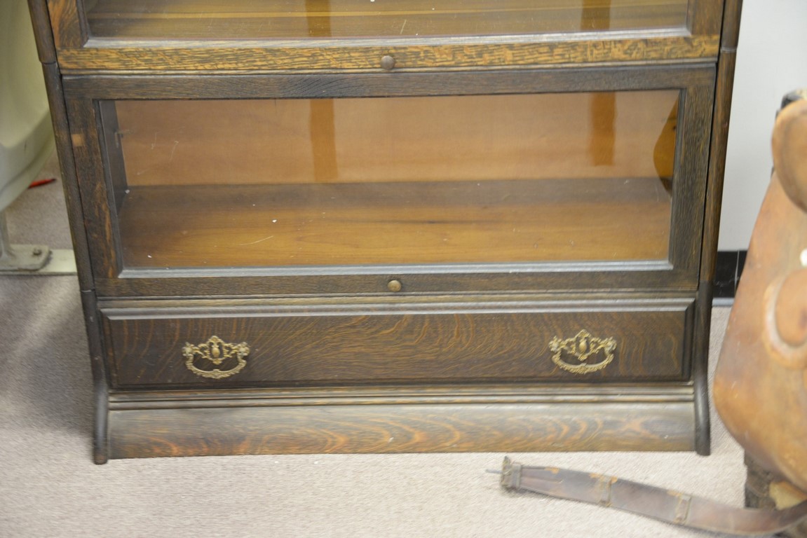 Lot 177: Oak three section stacking bookcase with drawer in base. ht. 48 in. wd. 34 in. dp. 12 in.