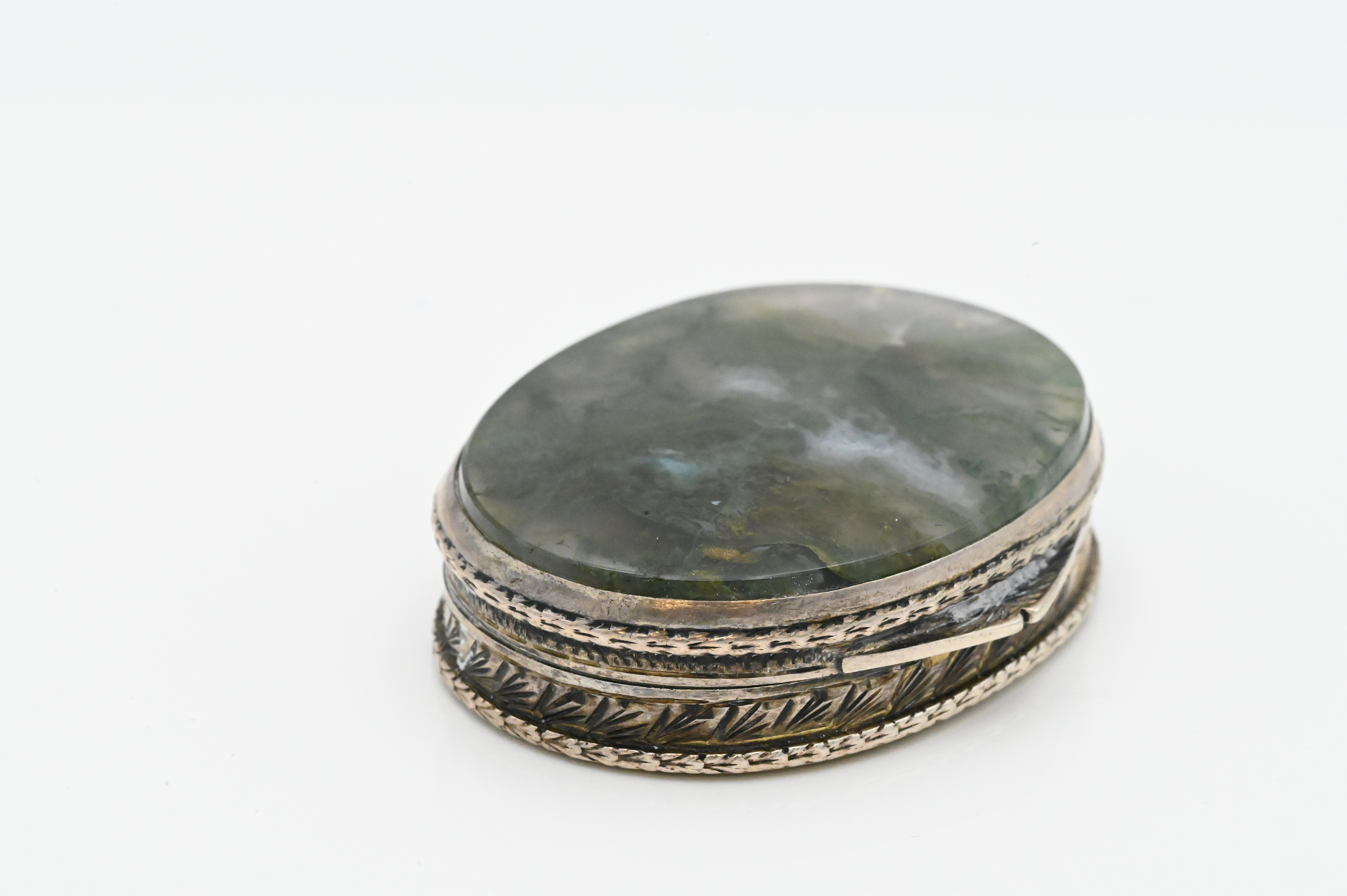 Silver Oval Box, having agate cover, 1 1/2″ x 1 7/8″.