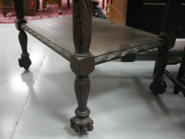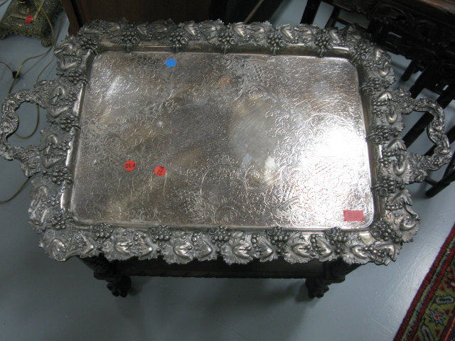 Silver plated tray mounted on table with paw feet from the estate of Broadway actress Leta Gold