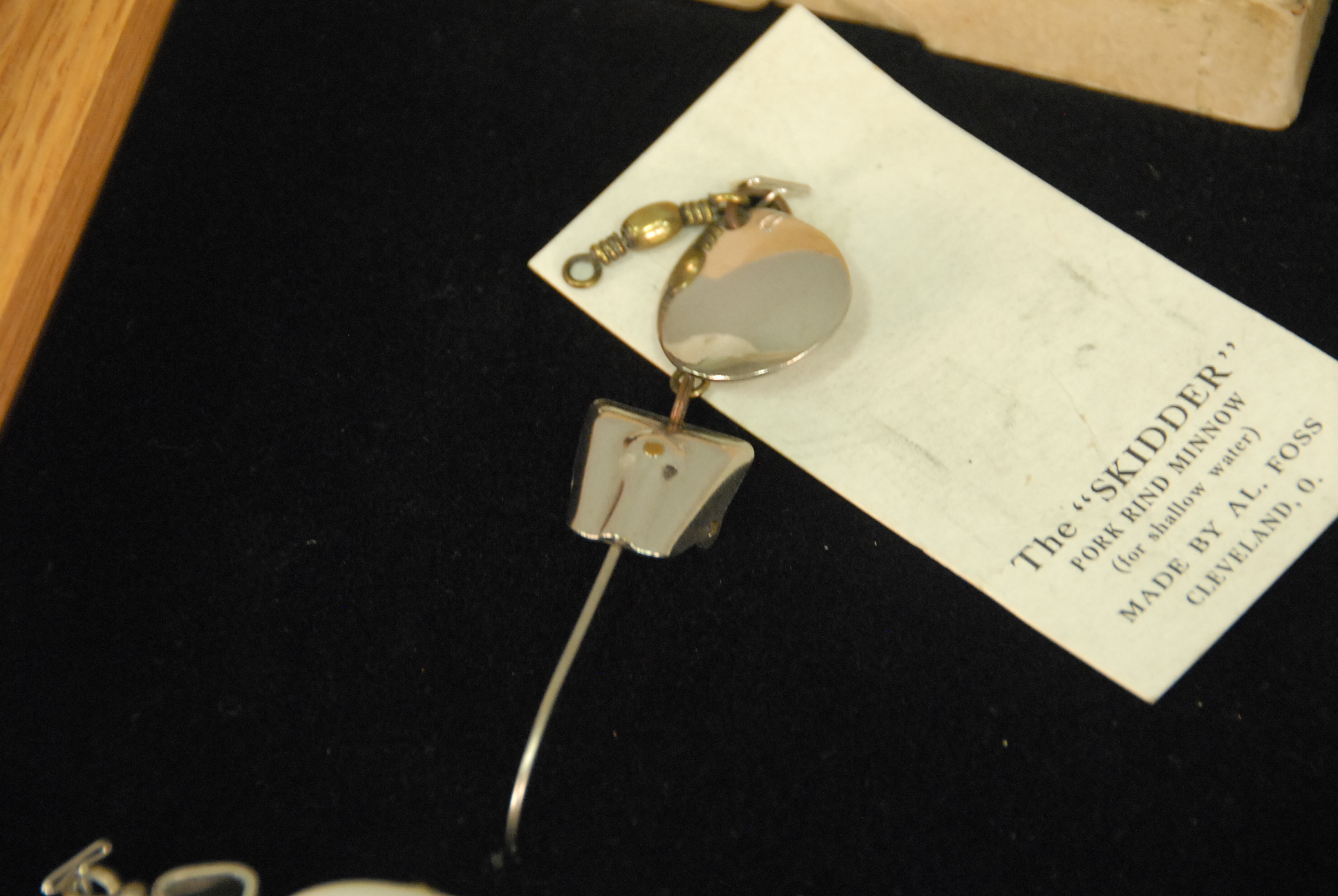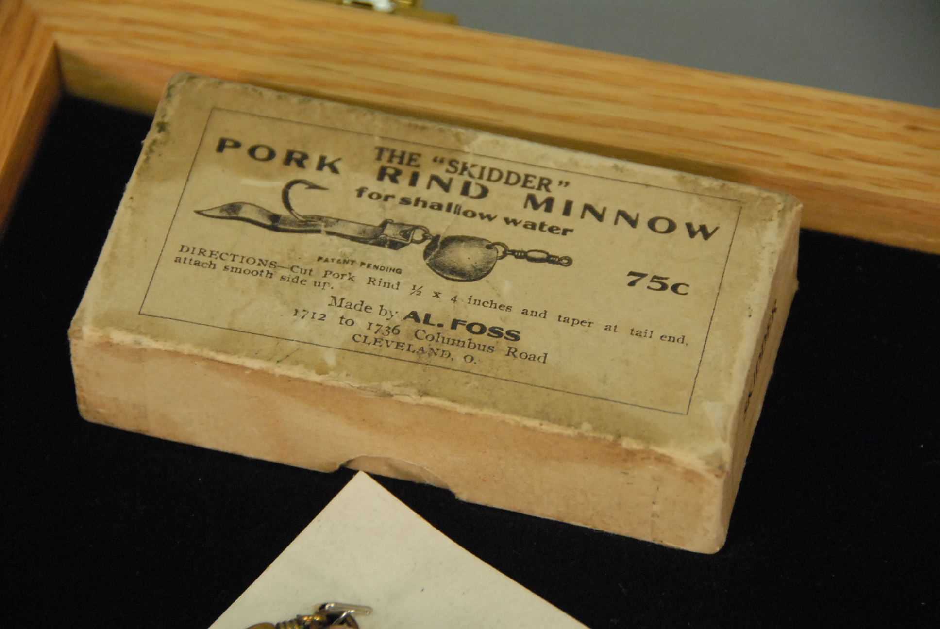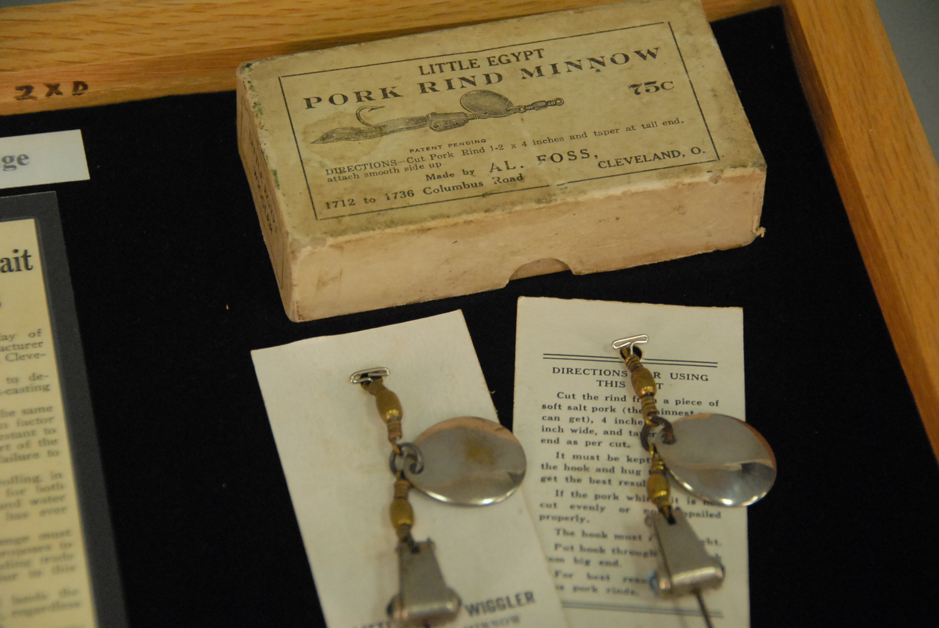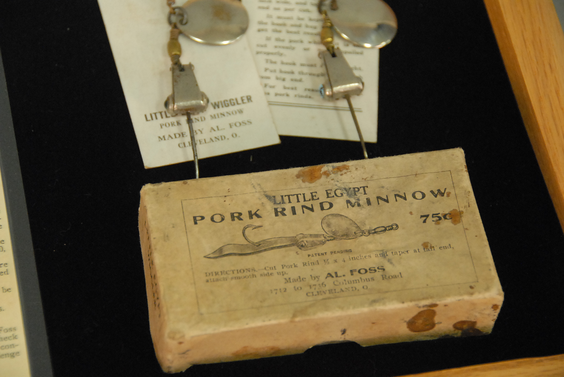 Three Al Foss Pork Rind Minnow 1915 original white boxes with lures Skidder and two Little Egypt Wiggler along with an Oriental Wiggler in wood case.