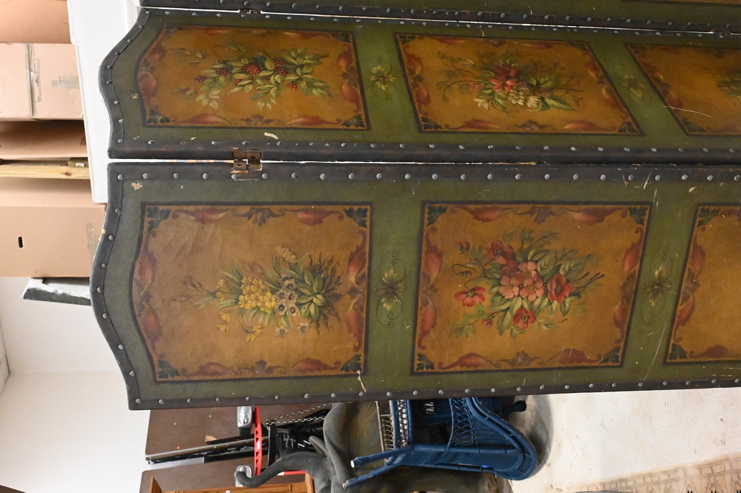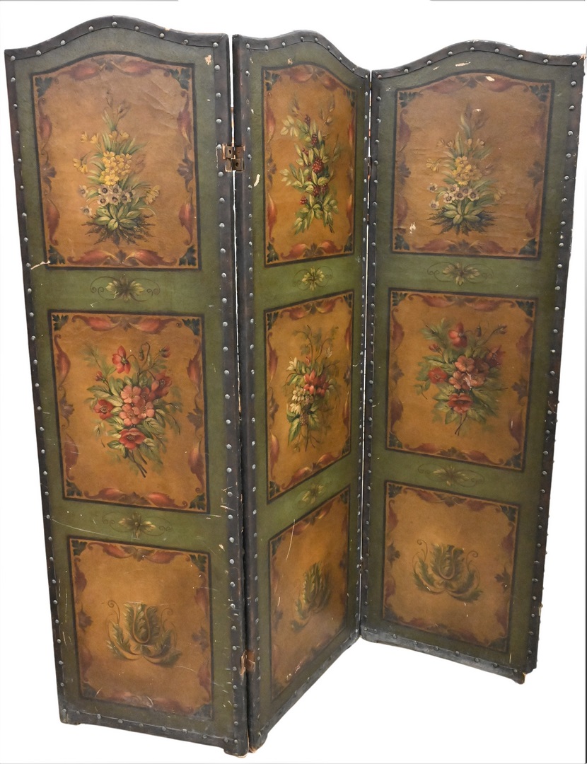 Three Fold Painted Canvas Dressing Screen, height 67 inches, width 60 inches.