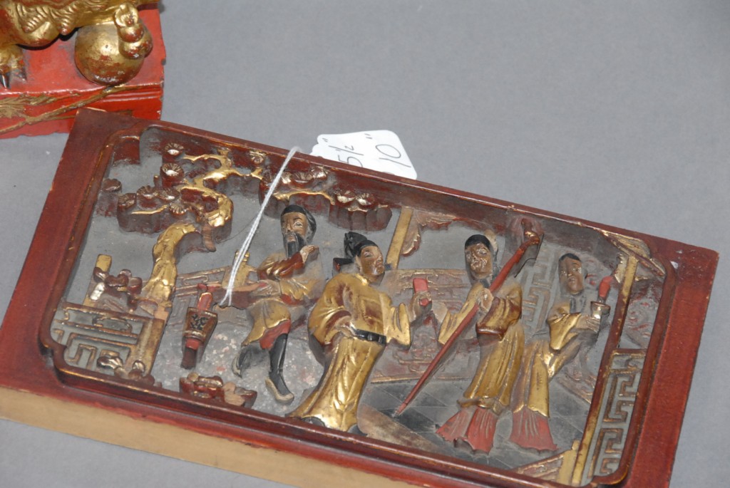 Lot 177: Three oriental carvings to include two carved wood plaques and a carved stone foo dog. plaques: 5 1/2 x 10, foo dog: ht. 5 1/2in.,…