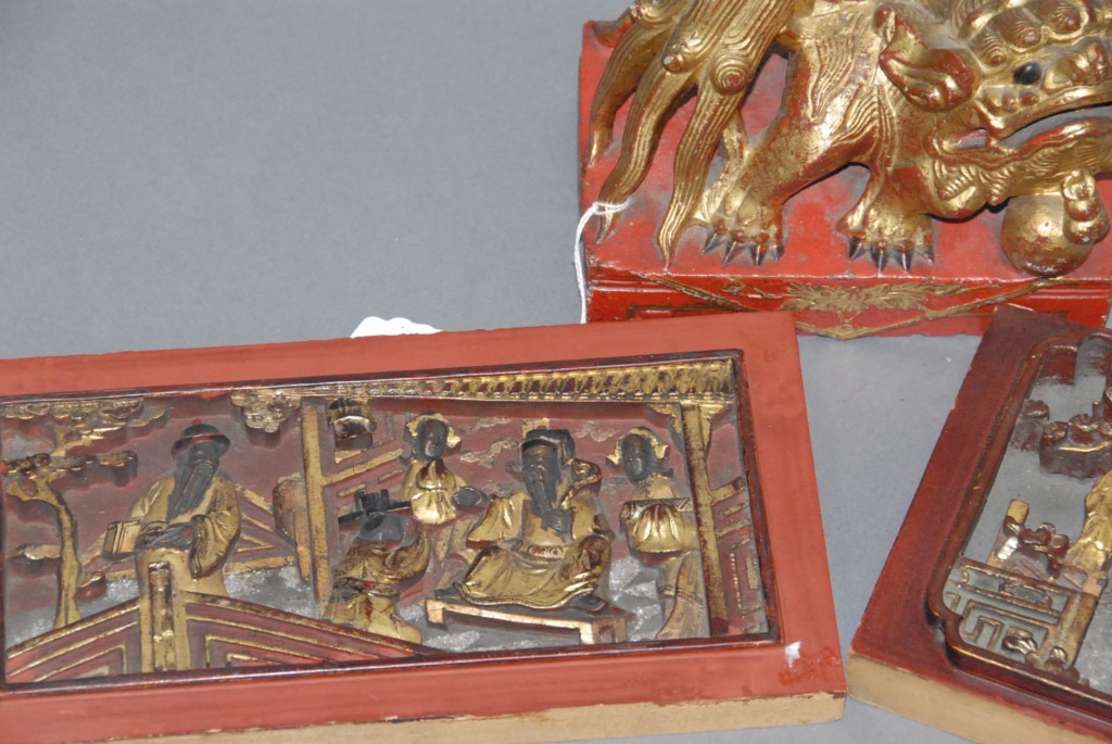 Three oriental carvings to include two carved wood plaques and a carved stone foo dog. plaques: 5 1/2 x 10, foo dog: ht. 5 1/2in., lg. 6in.