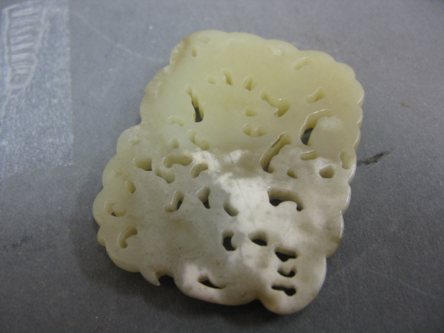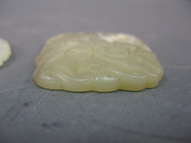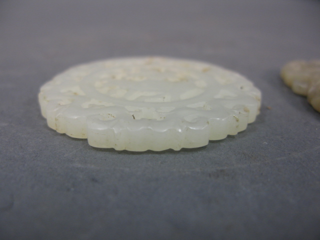 Two reticulated carved jadeite plaques one rectangle and one round.