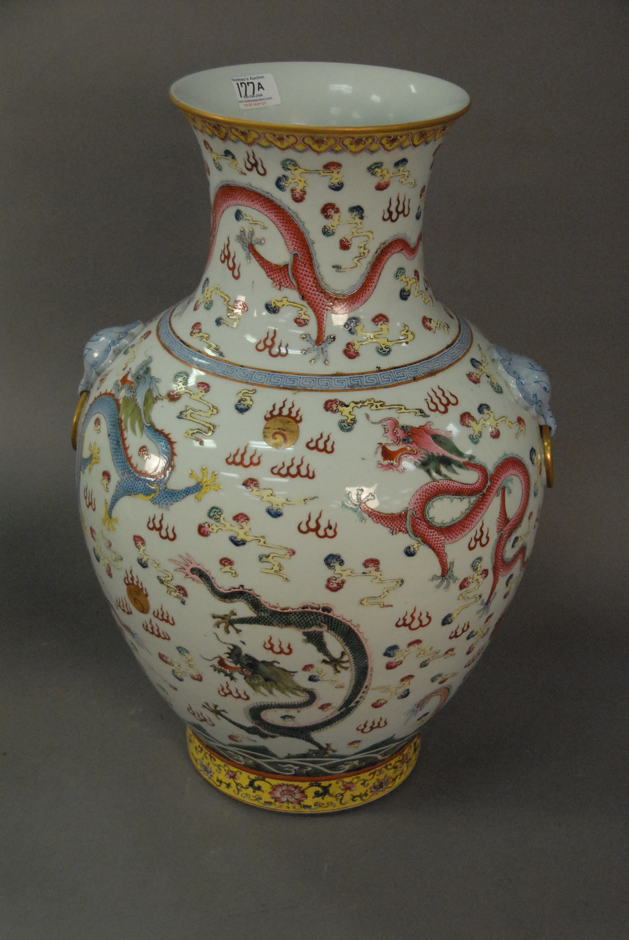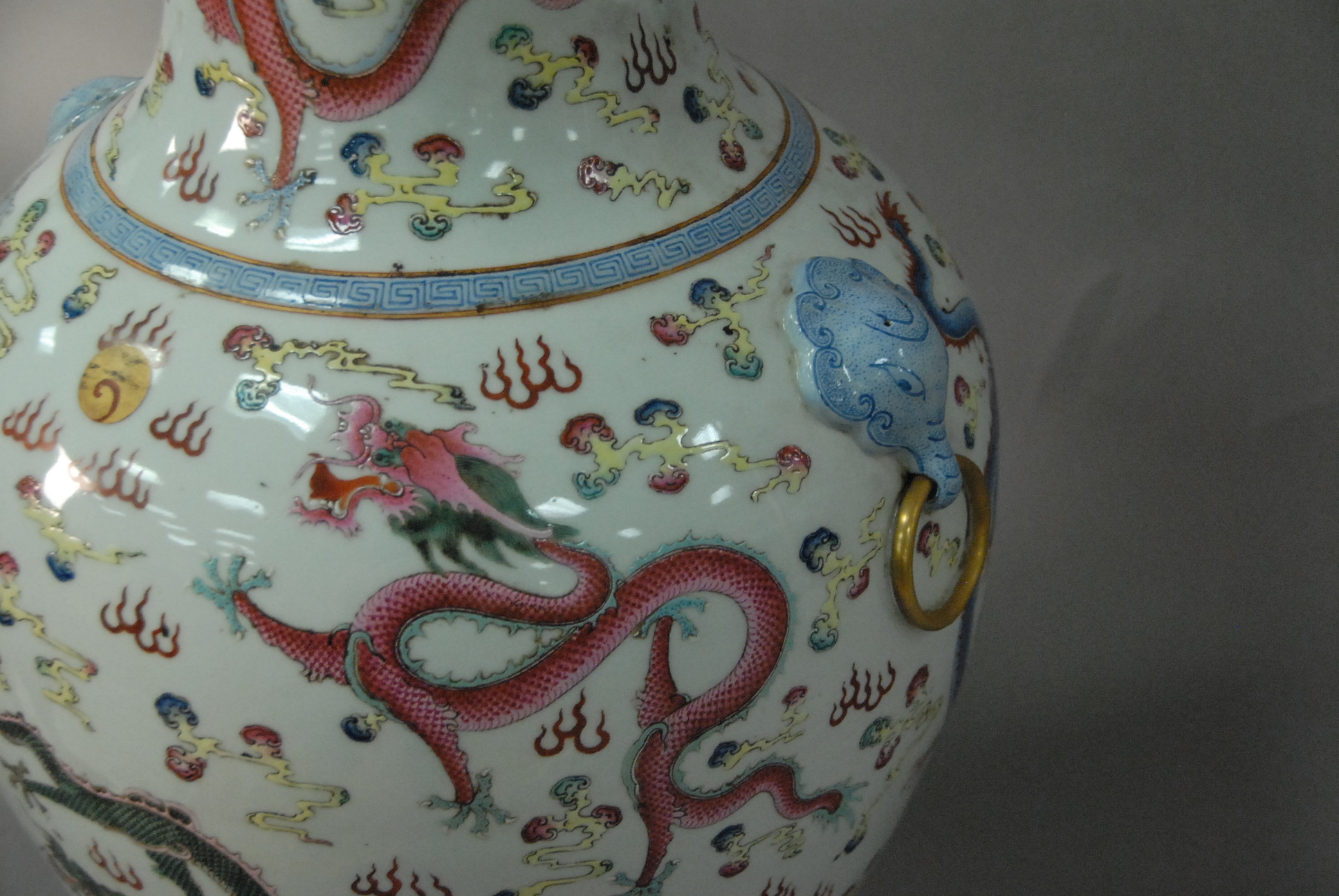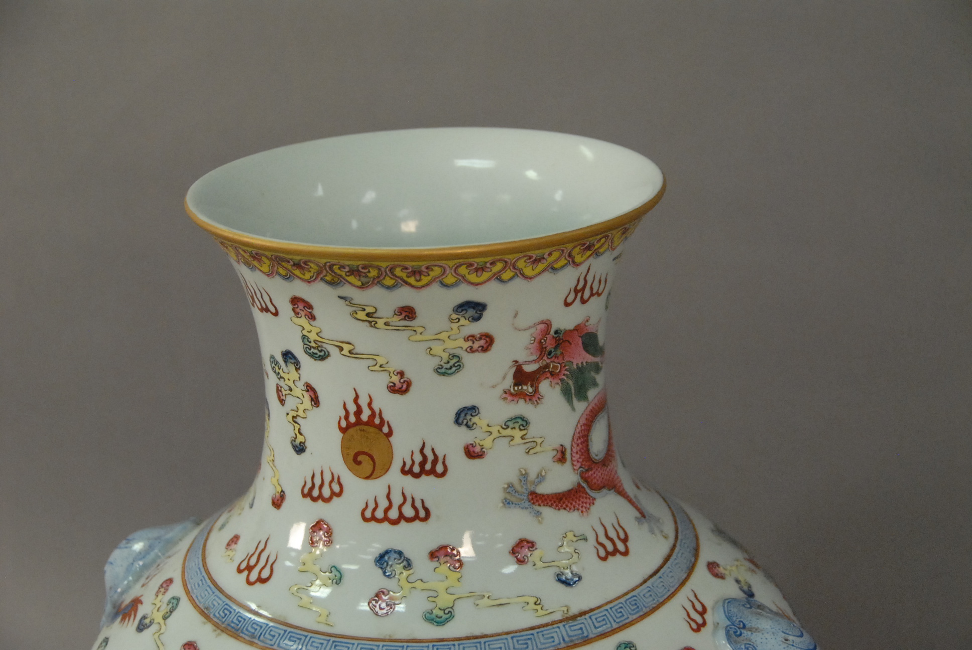 Lot 177A: Large Famille Rose balluster form vase with flaming cloud and five claw dragon design. ht. 23 in.